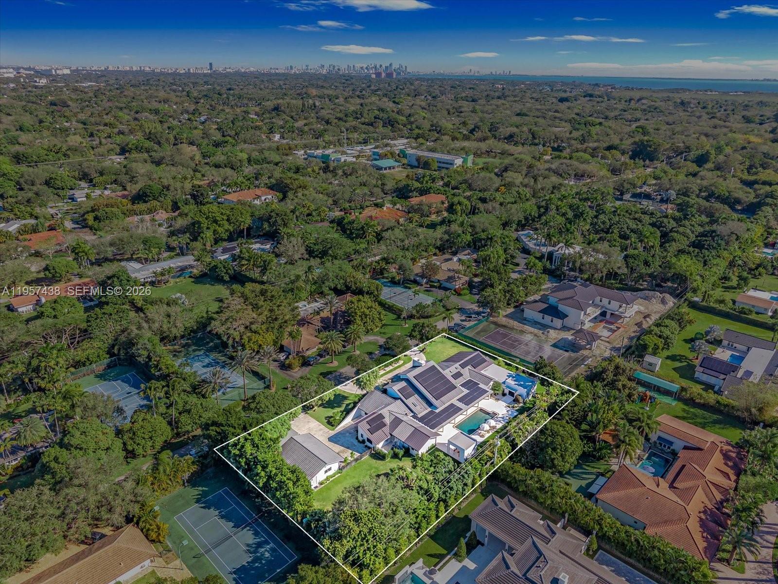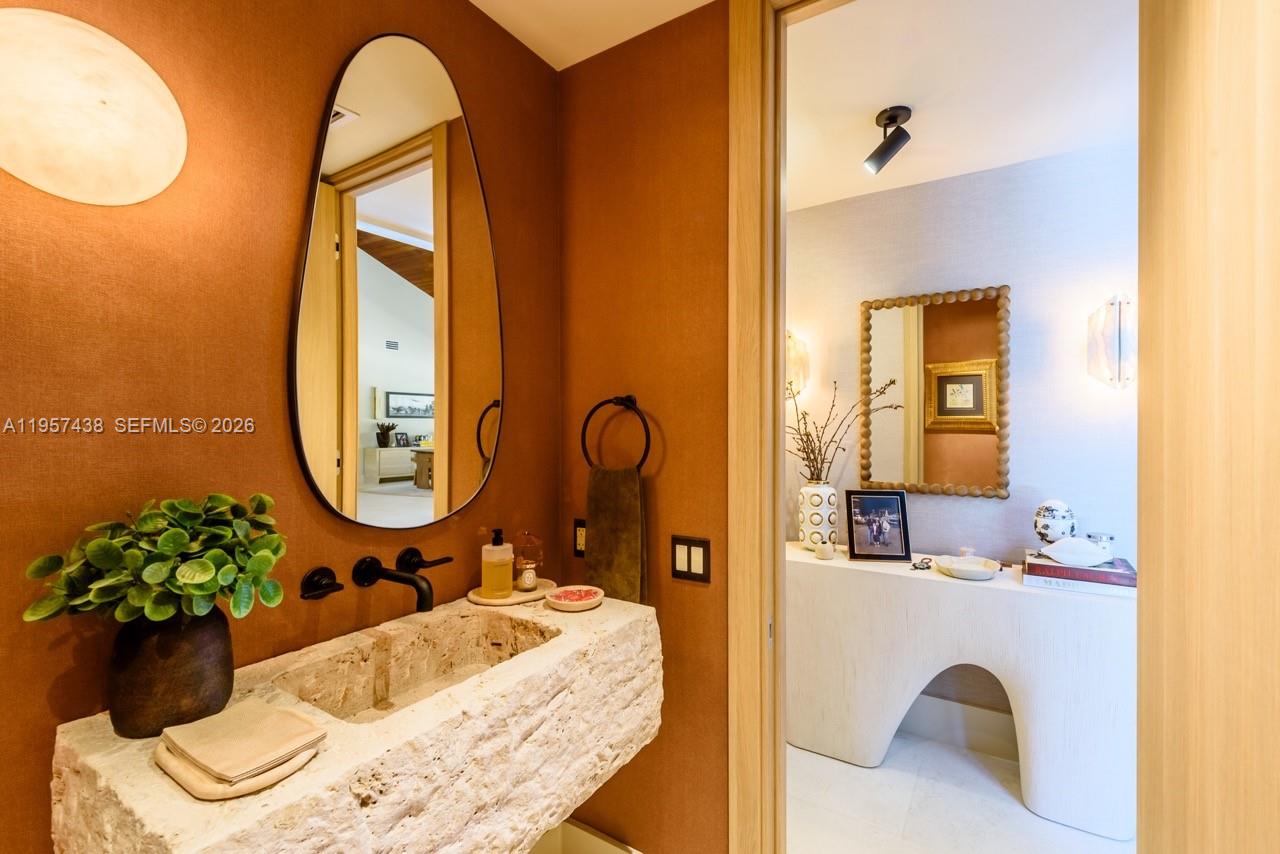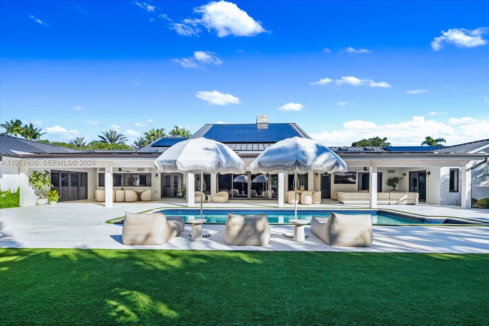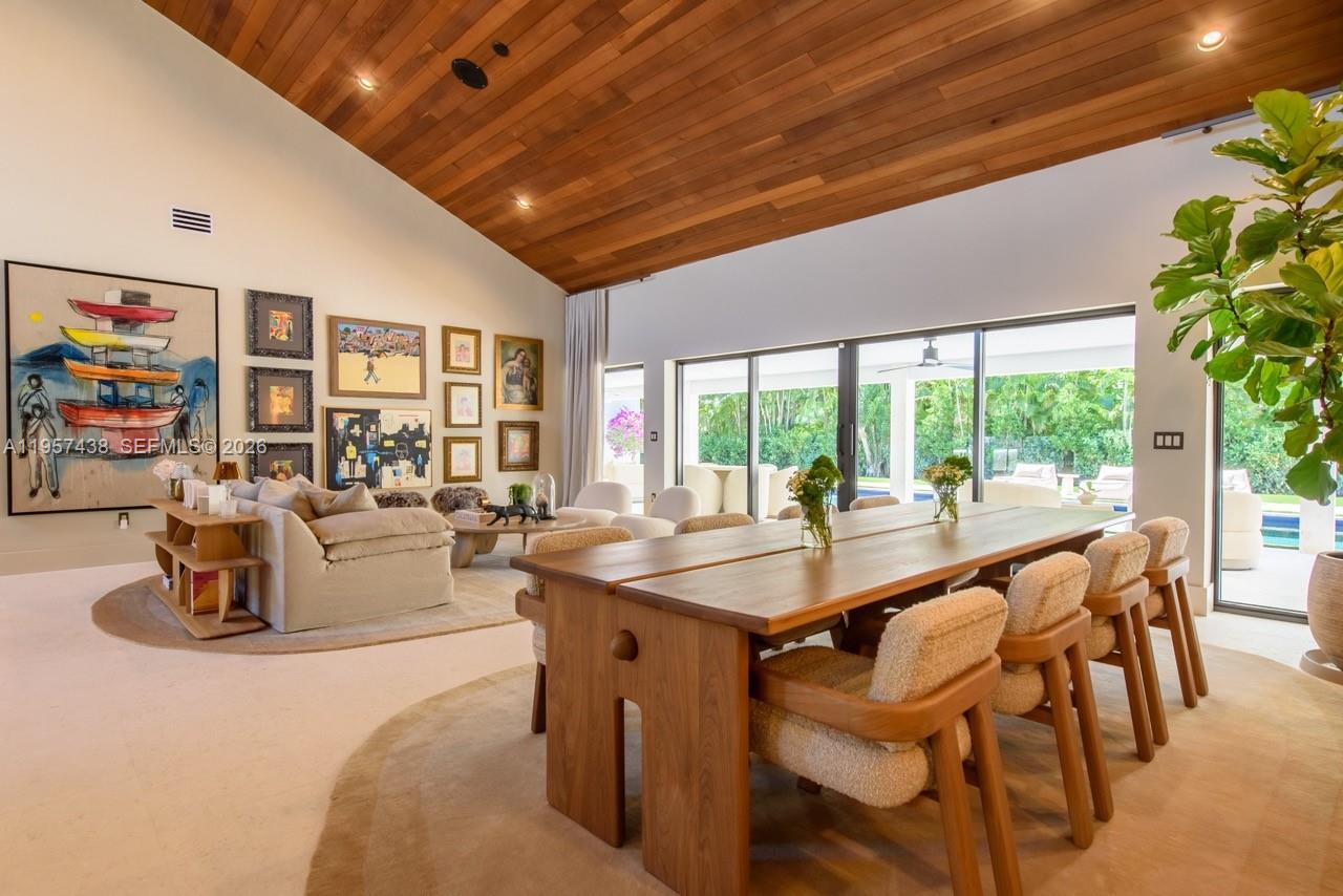 Welcome to Villa Armonia. Originally built in 1983 and completely renovated in 2025, this exceptional one-story residence offers 9, 649 total sq ft and sits on a full acre within one of the few gated communities in North Pinecrest. This home is one of the latest turnkey residences designed and renovated by Sensi Casa Design. The property features six spacious bedrooms, each with its own en-suite bathroom and walk-in closet. Additional highlights include a dedicated playroom with dual TVs, a family room with bar, and two formal living areas—one featuring a fireplace—along with wood beam ceilings and an elegant blend of wood and stone flooring throughout. The residence also offers a gym, sauna, steam room, and a detached, air-conditioned three-car garage. Outdoor amenities include a heated pool, covered terrace, and BBQ area, ideal for year-round entertaining. The kitchen, bathrooms, and closets are Made in Italy by Mia Cucina, complemented by Miele appliances and premium finishes throughout the home. Offered fully furnished.