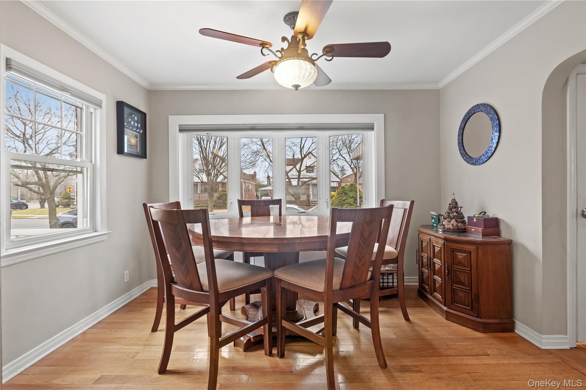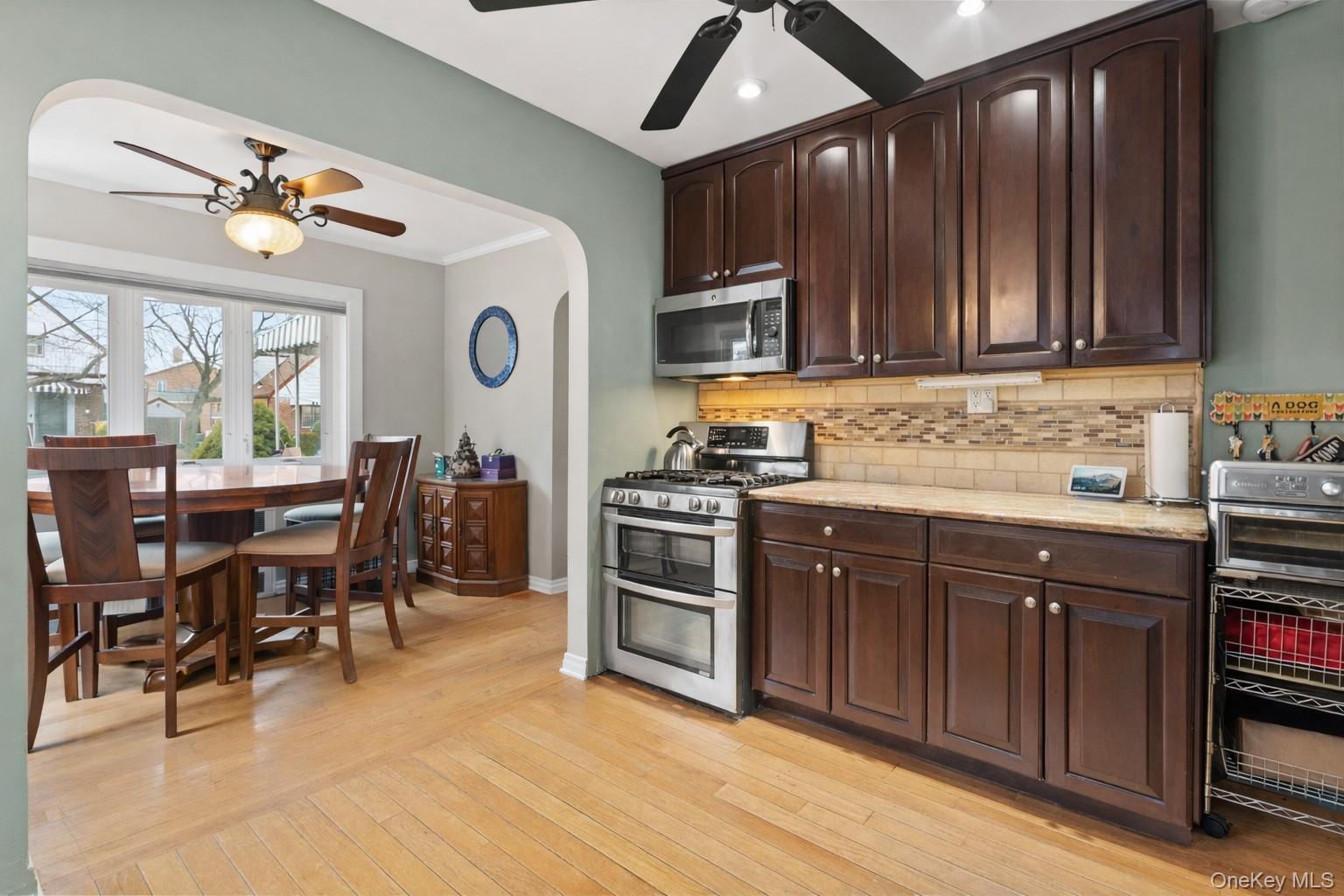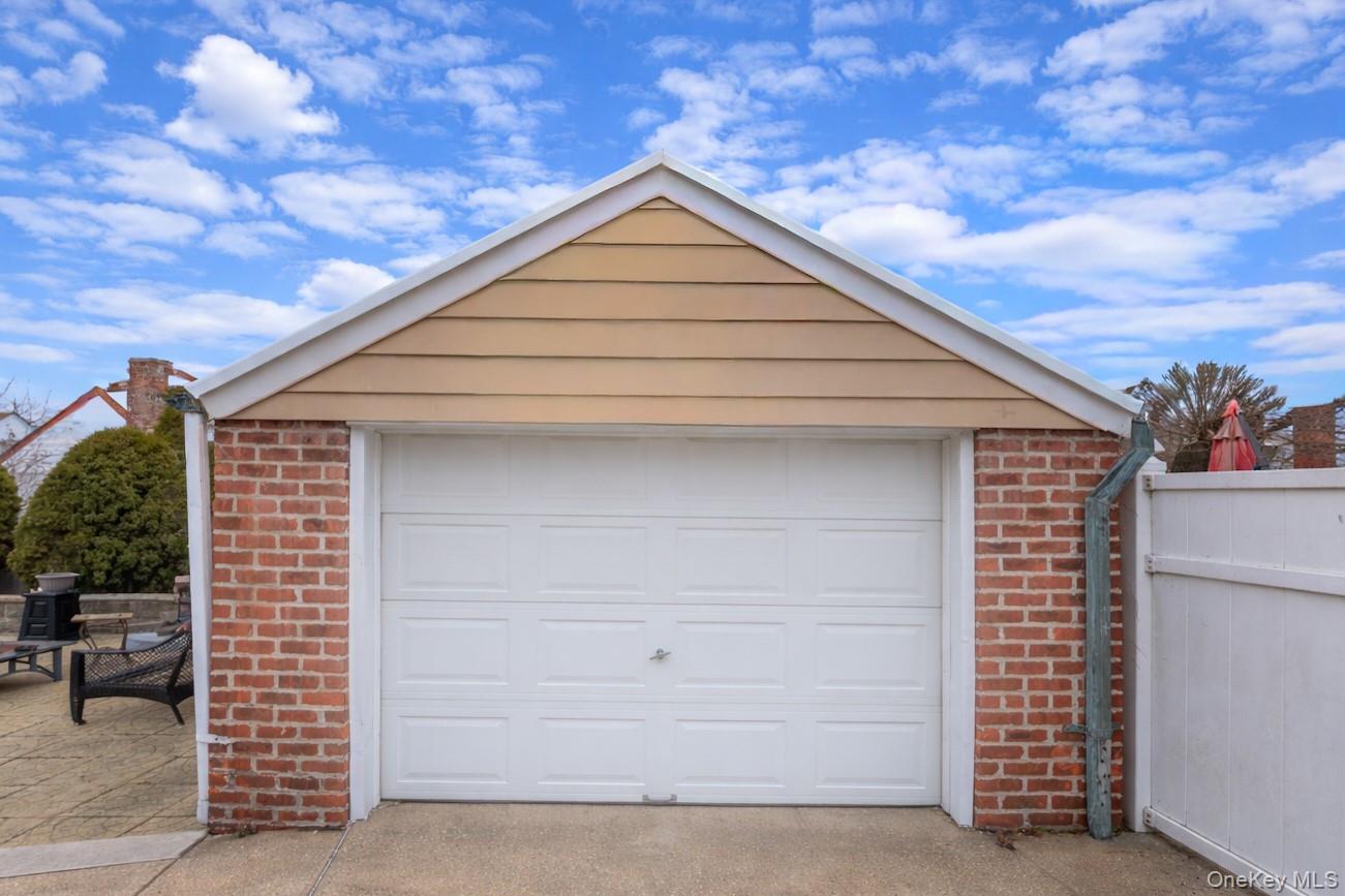 Welcome home to this beautifully maintained brick cape offering space, comfort and timeless charm in the heart of Fresh Meadows. A covered front porch with decorative masonry railing and room for seating creates a warm and inviting entry. Inside, bright and well-proportioned living spaces feature hardwood floors, crown molding, and abundant natural light. The living room flows seamlessly into a dedicated dining area, ideal for everyday living and entertaining. A graceful archway adds architectural character and leads into the updated kitchen. The kitchen is both functional and stylish with solid wood cabinetry, granite countertops, tile backsplash, and stainless steel appliances including a gas range with double oven, refrigerator, microwave, and dishwasher. Recessed lighting, a ceiling fan, and generous storage complete the space. Four comfortable bedrooms; two located on the first floor including a spacious primary with hardwood floors, ceiling fan, and double exposure windows. Upstairs; two generously-sized bedrooms provide flexible living space with charming built-in storage and ceiling fans. The private, fully fenced backyard is a true highlight, with expansive paved patio areas perfect for outdoor dining and gatherings. A long private driveway leads to a detached garage, offering secure parking and additional storage. Ductless Split A/C units and new windows ensure comfort throughout the year. This home combines classic character, modern convenience, and generous indoor-outdoor living in a charming residential setting. Close to Cunningham & Kissena Park -hiking, picnic, sports fields and golf. Fresh Meadows Place Shopping Center. Short distance to Flushing commerce and dining. Convenient access to the LIE and Grand Central Parkway. Express bus service to Manhattan and frequent local buses connect you to the subway system at 169th St, 179th St (Jamaica) and Kew Gardens.