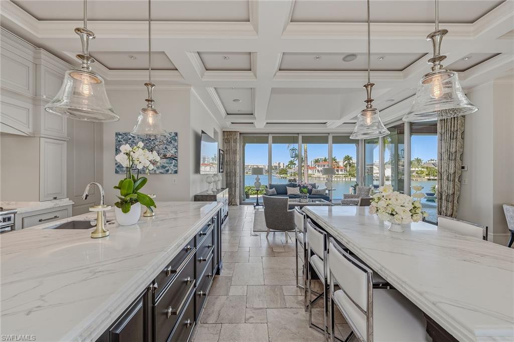 From the moment the front door opens, the bay becomes the focal point. Built by renowned BCB Homes, this custom estate was conceived to showcase the waterfront at every turn while delivering a level of detail and finish expected by the discerning buyer. The home unfolds through a thoughtful balance of formal and casual spaces, each designed to serve a purpose while maintaining visual continuity with the bay. Formal living and dining rooms create an elegant framework for entertaining, while everyday living naturally gravitates toward the family room, where expansive glass captures panoramic water views throughout the day. At center of the residence, the kitchen functions as a gathering space and a showpiece. Dual islands provide scale and flow, while marble countertops and professional appliances support serious cooking and entertaining. The 60-inch Wolf gas French plate range is not simply a feature but a statement, underscoring the home’s commitment to performance and design. Nearby, a dedicated bar and climate-controlled wine room anchor the home as a setting for evenings that linger. Inspired by coastal Europe, the home’s outdoor areas are anchored by an infinity-edge pool and spa that visually merge with the bay beyond. Covered and open-air spaces are layered to accommodate every part of the day, from shaded afternoons on the lanai to evenings around the summer kitchen and open sitting areas. The custom 90-foot dock extends the home’s lifestyle onto the water. Designed to blend naturally with its surroundings, it is equipped with a 16, 000-pound lift and floating dock platform, ready to support aquatic adventures. The first-floor primary suite occupies a dedicated wing of the home with a bedroom positioned directly on the bay, offering sweeping water views upon waking and retiring. Dual walk-in closets and a marble-clad bath evoke the best European spas, while a secluded sitting room or office provides a quiet place to work or reflect. The first floor also features a beautifully finished billiards room or fifth bedroom, complete with its bath, allowing the home to adapt effortlessly. The second floor, with its dedicated elevator, features three beautifully appointed guest suites, each with a private en-suite bath. A central social room with a morning bar creates a natural gathering point for guests, reinforcing the home’s sense of ease and hospitality. The second-floor balcony offers expansive bay views, while the rooftop terrace provides an even more commanding perspective. With a dedicated fireplace and open vistas across the water, this space becomes a destination for sunsets, evening conversations and quiet moments above it all. This Moorings bayfront residence is not simply a home but a setting for a life shaped by water, light and thoughtful design.