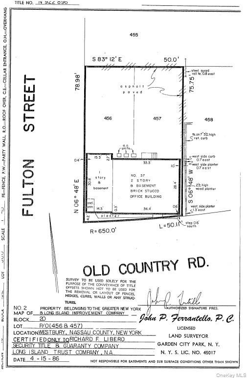 57 Old Country Road in located in the Incorporated Village of Westbury. Approximately 1. 5-mile South of the Westbury Village R/R station. Approximately 1. 5-mile West of the Wantagh State Parkway. Approximately . 5-mile East of the entrance to the Meadowbrook State Parkway. Approximately 1. 3 miles East of Zeckendorf Blvd The Source Shopping Mall, Fortunoff Way & Merchants Concourse. Approximately 1. 8 miles to Northern State Parkway Approximately 2 miles to Jericho Turnpike