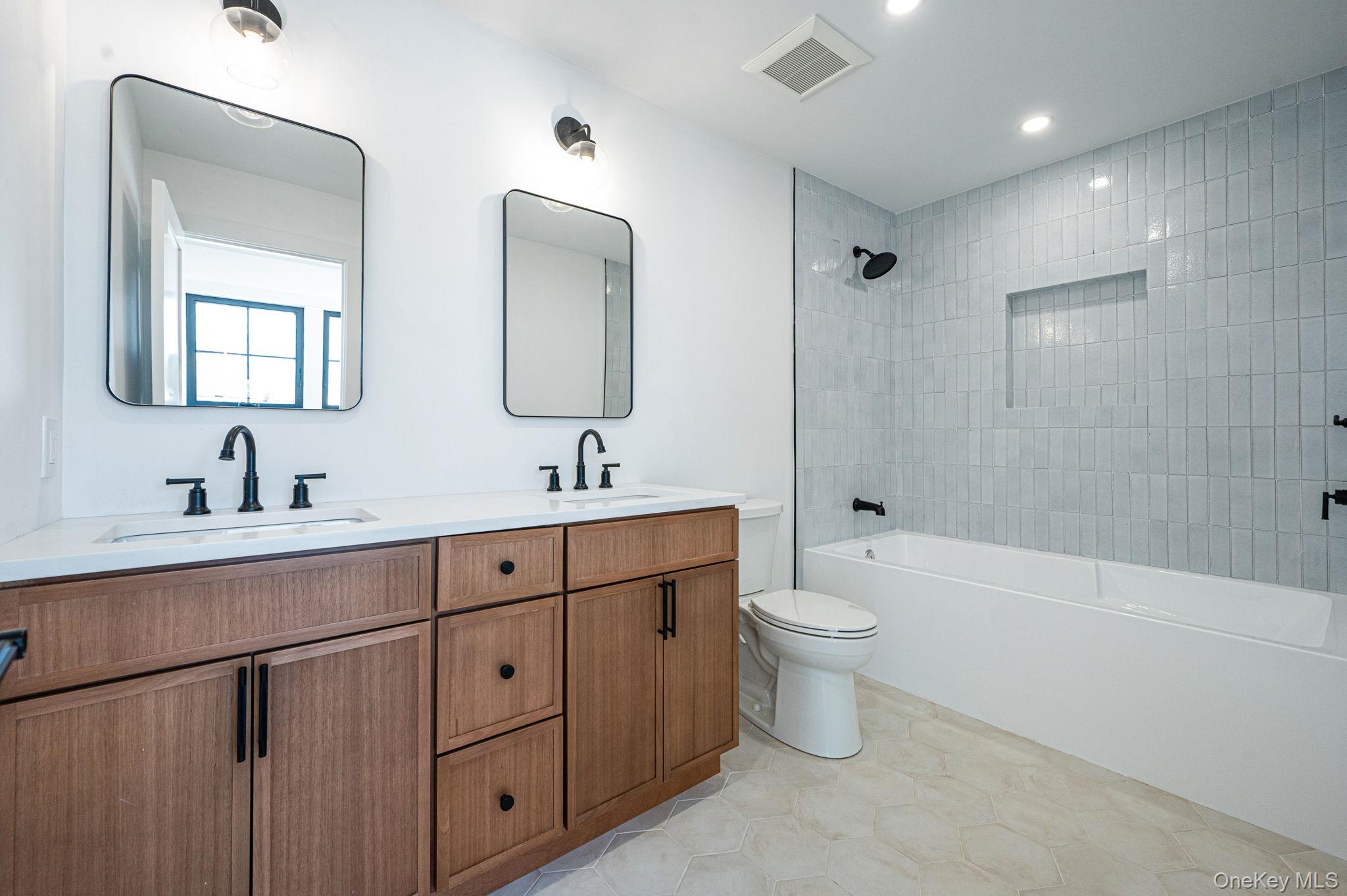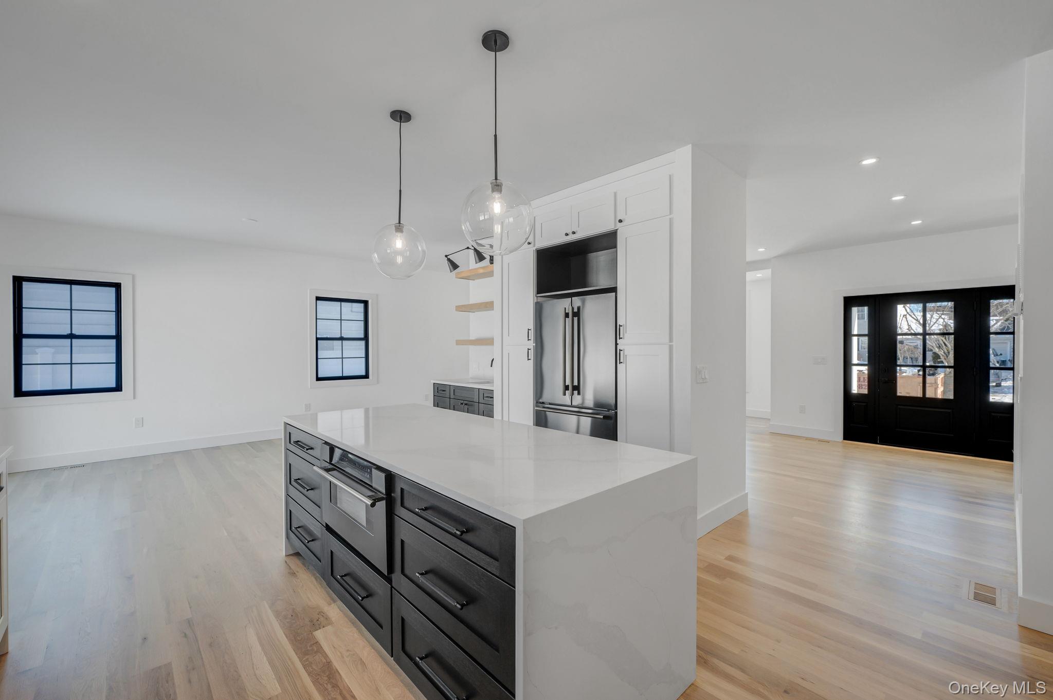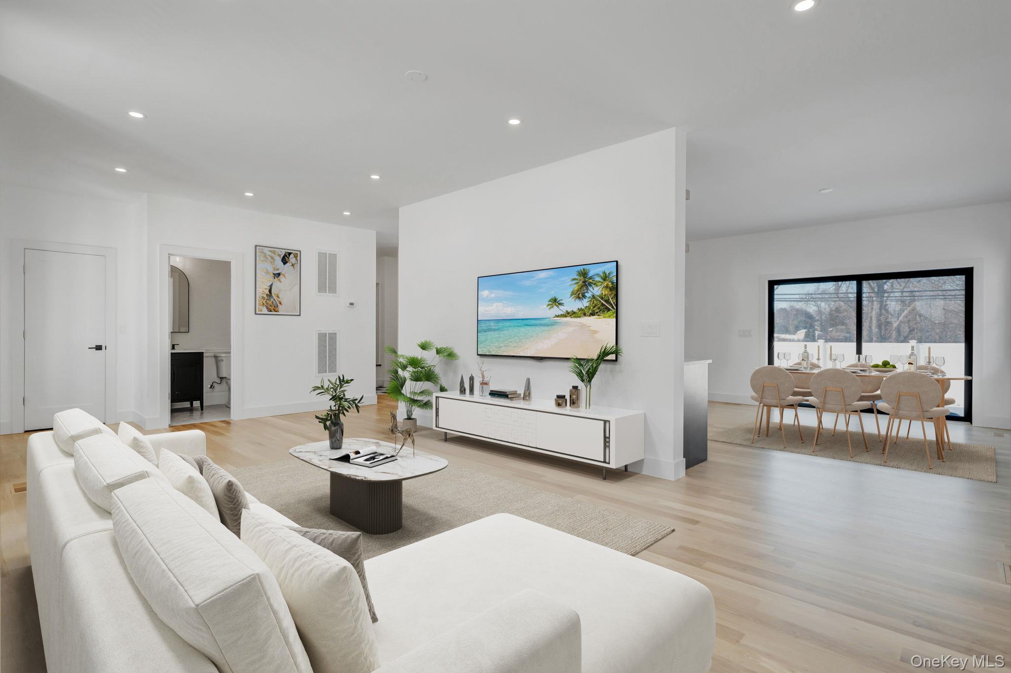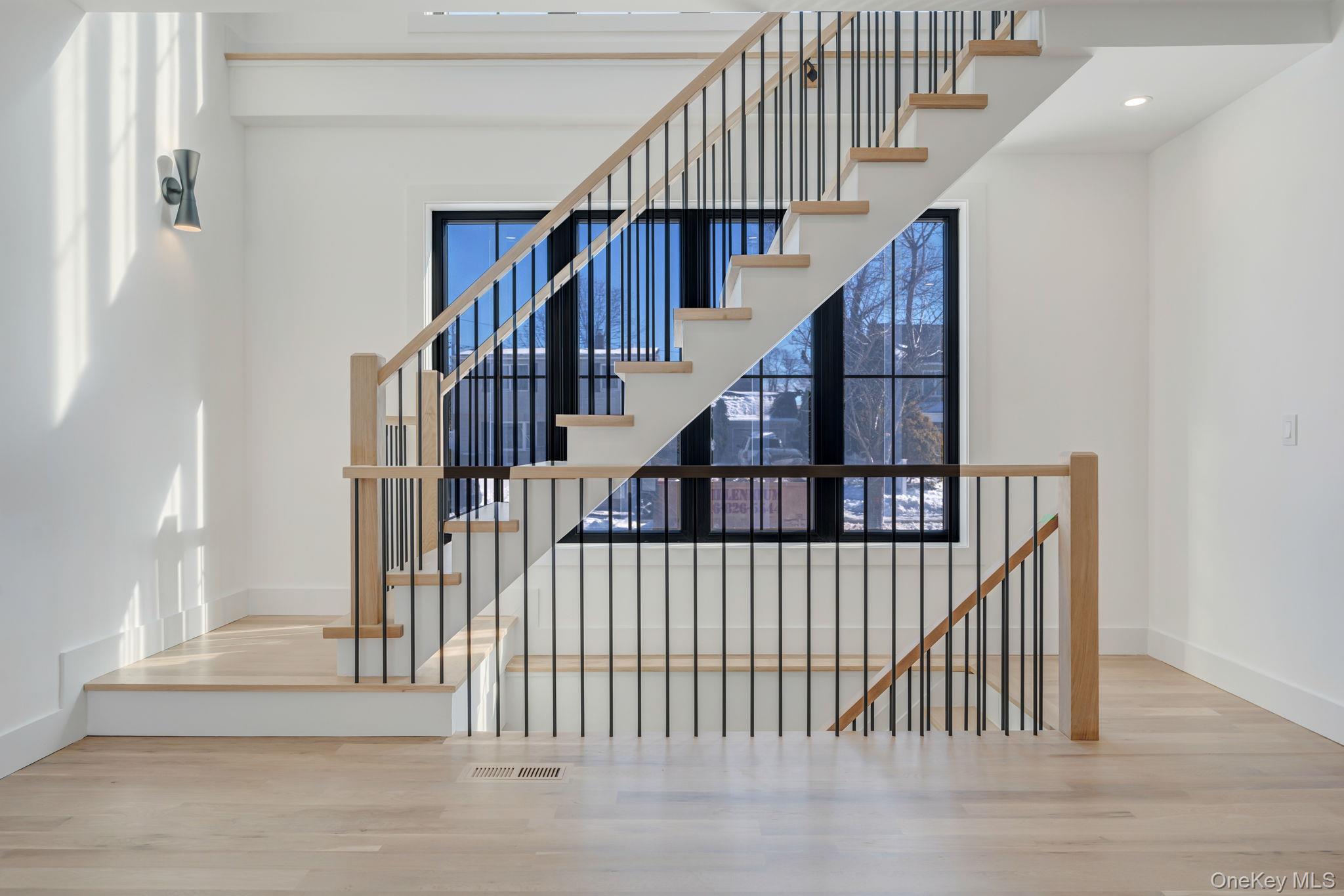 Brand new eastern-facing Colonial offering over 3, 100 sq ft of thoughtfully planned living space, plus a full basement with high ceilings and an outside entrance, providing exceptional versatility for both today and the future. The exterior sets the tone with clean architectural lines, board and batten style siding, black framed windows, and a welcoming covered entry that gives the home strong curb appeal and a custom-built presence. Inside, oversized Andersen windows fill the home with natural sunlight, highlighting the open layout and airy feel. The main level flows effortlessly from the spacious living area into a beautifully designed kitchen with a dedicated dining area and large glass sliders to the yard. The kitchen is anchored by a waterfall-edge quartz island, two-tone cabinetry, and a full suite of Forno appliances. A standout feature is the first-floor junior primary suite with a full bath, ideal for guests, an in-law suite, or a private office. Enter from the garage into a built-in mudroom area with bench seating and hooks for bags and jackets. A powder room completes this level. The staircase serves as a design focal point with its modern railing and dramatic window wall, bringing light into both floors and enhancing the home’s architectural character. Upstairs, the primary suite feels like a true retreat with vaulted ceilings, large windows, two walk-in closets, and a beautifully designed private bath featuring a freestanding soaking tub, oversized glass shower, and modern finishes. Three additional bedrooms are all well-proportioned and share a full hall bath. The second-floor laundry room adds everyday convenience to the layout. The full basement (approx 1, 500sqft) with high ceilings and an outside entrance offers outstanding potential for future finished living space, a recreation area, gym, or additional storage. Additional features include central air, an energy-efficient electric heat pump heating system, propane cooking, sewer connection, 4-inch hardwood flooring throughout, and the ease and efficiency of new construction. Set on a 60 x 100 property within the Levittown School District, this home delivers a rare combination of space, natural light, architectural detail, and modern systems in a brand new build.