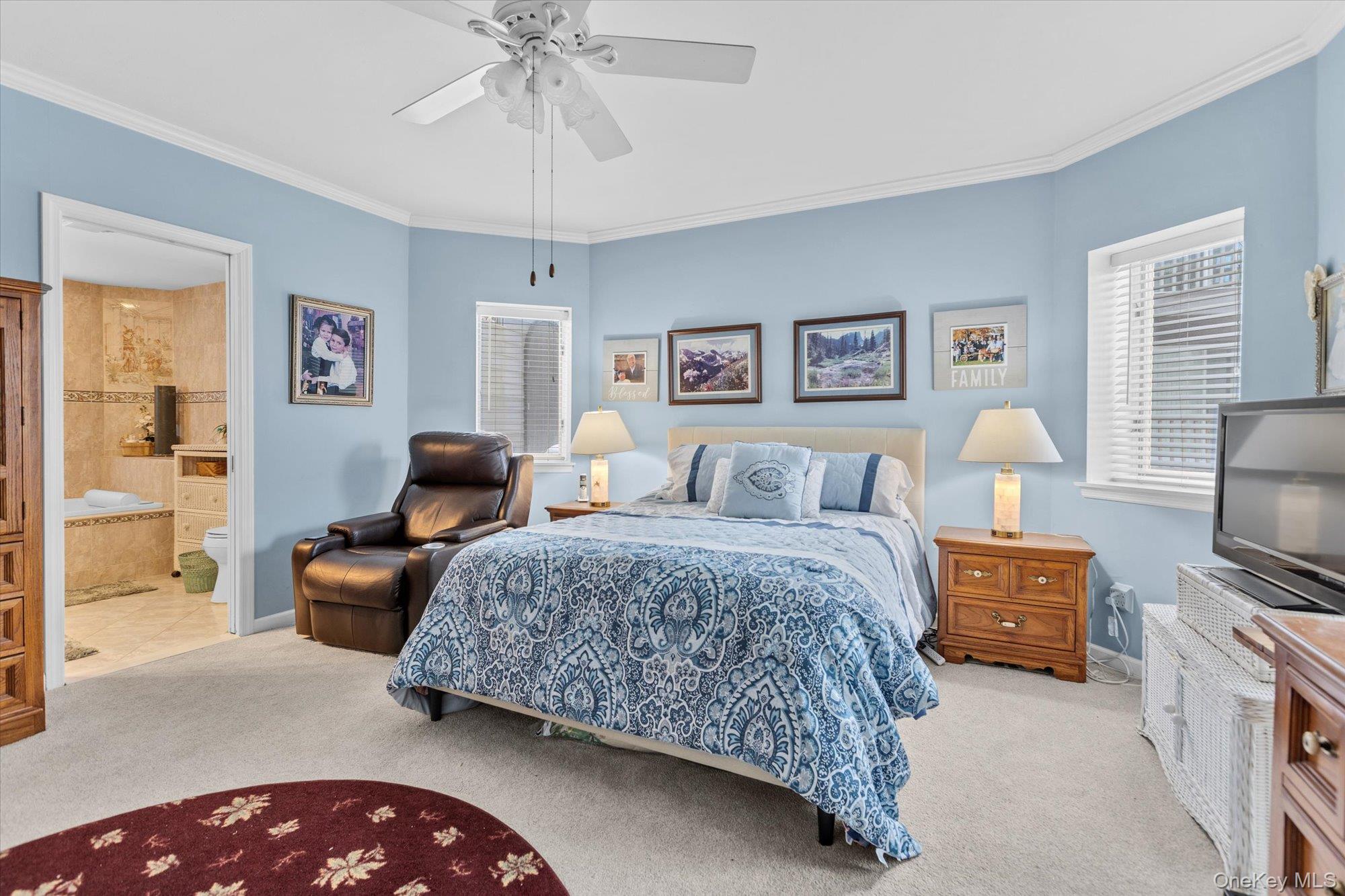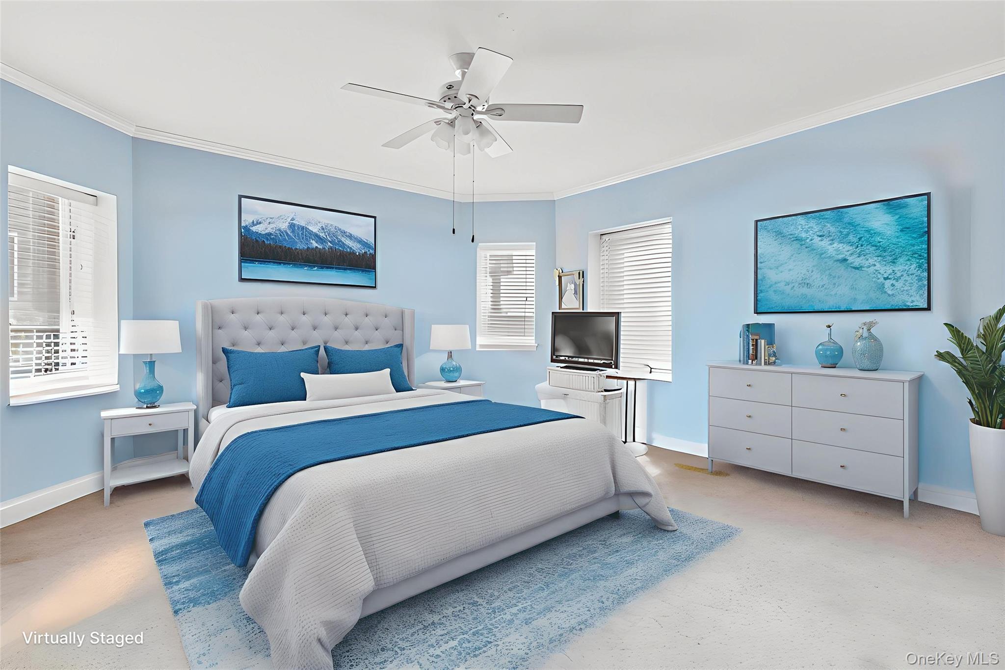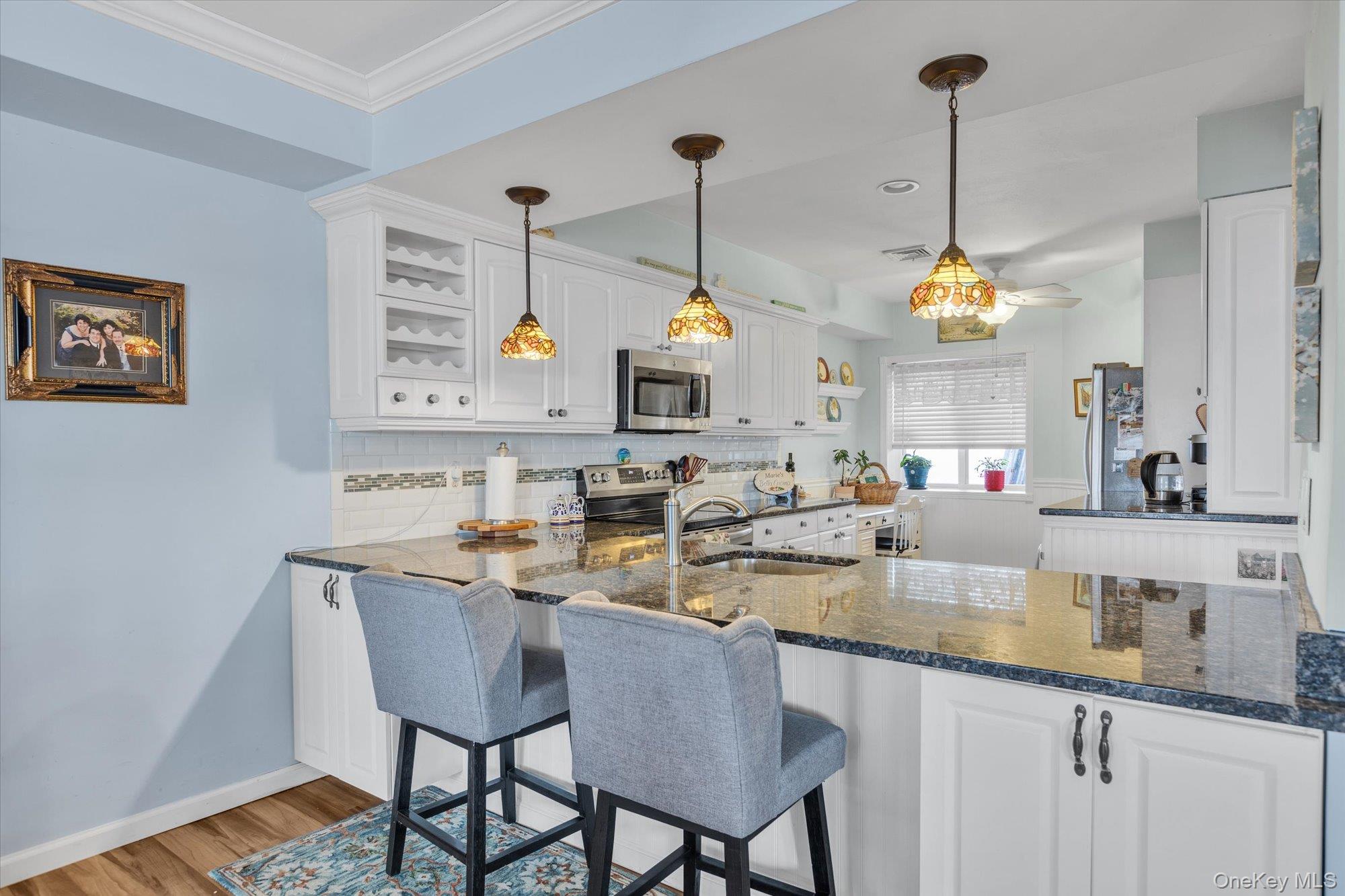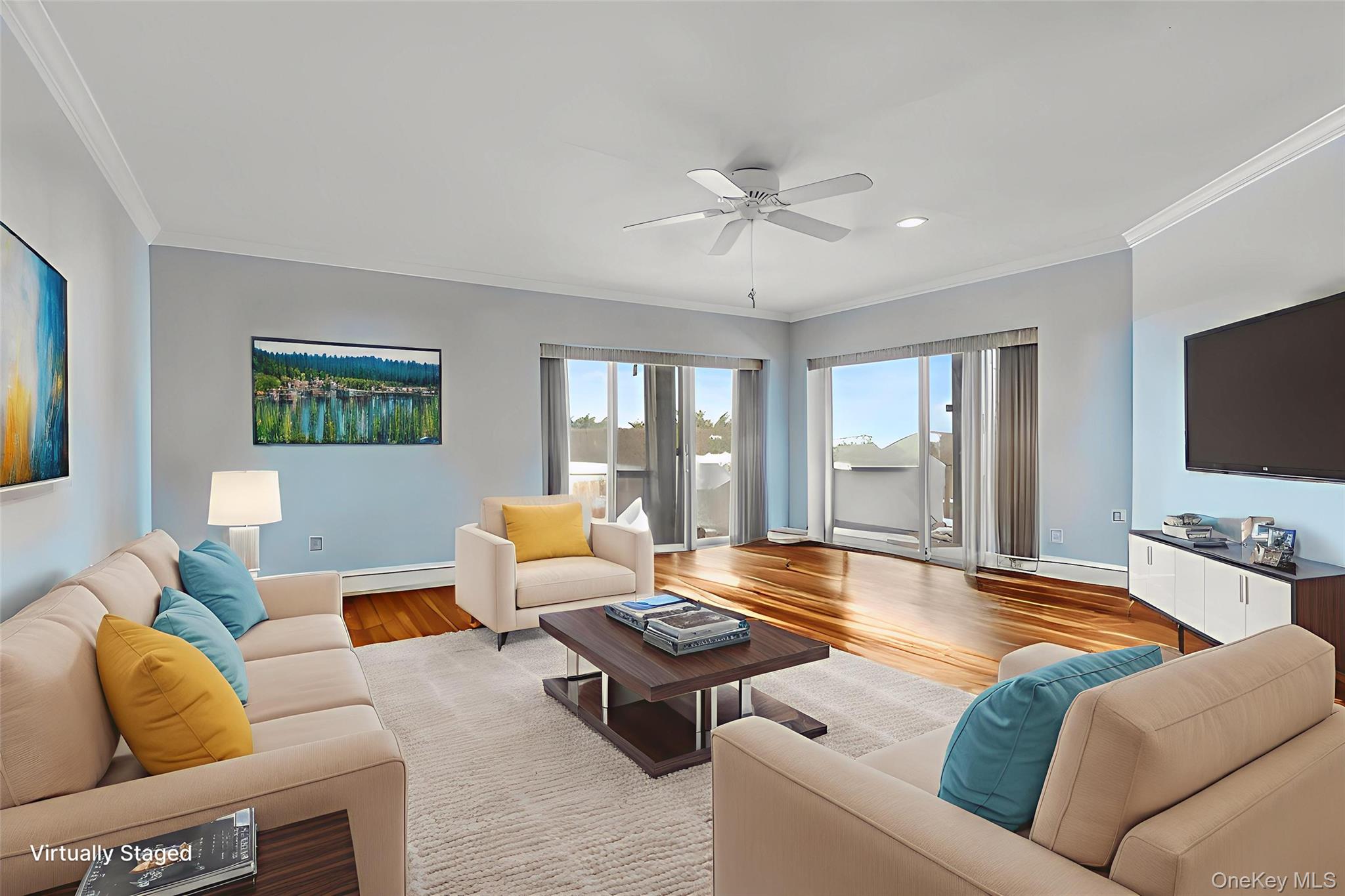 This rarely available end unit at the Bluffs in Baiting Hollow offers amazing views of the Long Island Sound. You will never get tired of watching the sun melt into the shimmering sound from your own home! The heated, enclosed sunroom with a wall of Anderson windows facing the water can be used as a den, home office, or 3rd sleeping area. The renovated kitchen is the perfect place to prepare gourmet meals. It features granite countertops, white, soft-close cabinets, an LG refrigerator, a Bosch dishwasher, a GE stove/ convection oven, a microwave, and Whirlpool washer and dryer. The sun-filled living room has an electric fireplace and opens to the spacious dining area making for easy entertaining. The sumptuous master suite offers huge walk-in closets and a spa-like master bath with heated floors. There is luxury vinyl flooring throughout the condo that looks like wood but is incredibly easy to care for. The wrap around deck can be accessed from the living room, sunroom, and primary suite. Amenities include a huge pool, 3 tennis courts, 4 pickleball courts, bocci, and pool house with fitness room. Owners at Fox Hill enjoy access to a secluded beach that you can comb for treasure. The community is adjacent to the world class Baiting Hollow Golf Club designed by Robert Trent Jones. Baiting Hollow is convenient to the best wineries, dining and shopping on the North Fork. All this and only 90 Minutes To NYC. Please note that this listing uses virtual staging to give buyers an idea of what the rooms might look like with different furniture.