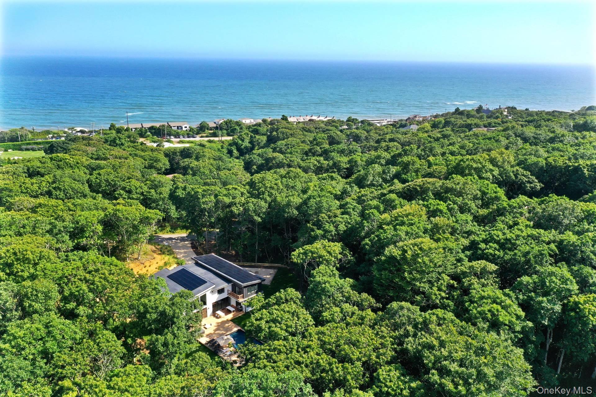 Set in the privacy of Hither Woods, this six bedroom, four and a half bathroom offers contemporary sophistication while staying true to the open and free and environmentally friendly spirit of Montauk. The 5, 155 sq. ft. two story home has it all with its 28, 000 watt roof mounted solar panels, and high efficiency HVAC. Each room has it's own individually controlled zone thermostat for maxim comfort and the house has Low E Anderson windows with heat lock coatings for maximum energy performance whether enjoying this home in summer or winter. Walking through the contemporary styled entrance reveals an open expansive living room with high ceilings, a dining room with a long slate table that seats twelve directly adjacent to a large open, fully appointed, California style kitchen. The living room, dining room and kitchen all have views of the 15x30 pool, hot tub and large yard with excellent privacy. Along the east side of the first floor is a bedroom with an ensuite bathroom leading to the first floor den and access to an extensive, ready to be finished, basement. The second floor features a primary bedroom with a modern roomy bathroom. This floor also features a large guest bedroom with it's own full bathroom. Three remaining bedrooms and another bathroom also adorn the second floor, they all have good storage space, great privacy and views of the amazing area surrounding 19 Elm. Situated near trendy Old Montauk Highway, Gurneys Inn and Hither Hills State Park, 19 Elm captures the classic, open and free spirit of Montauk in a contemporary, modern home.