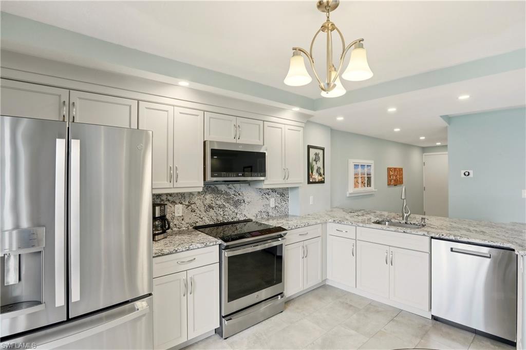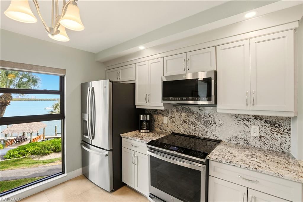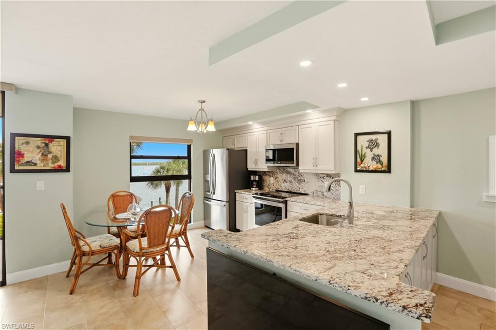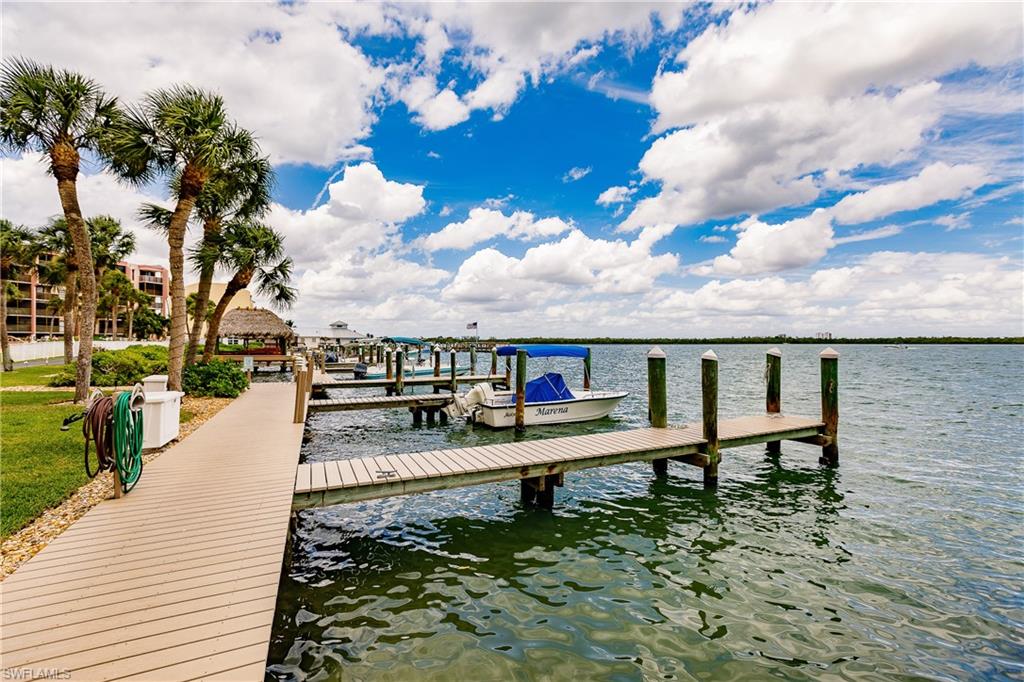 Come and experience Paradise at its finest! Riverside Club, a jewel of Marco Island, invites you to tour this new listing. See for yourself the magnificent wide water views offering breathtaking sunrises and moonrises over the Jolly Bridge. You will enjoy the fabulous tropical lifestyle right from your lanai as you encounter nature's parade: playful dolphins and abundant marine life! We must also mention your delight at watching boating activity. Whether you are sipping your favorite cocktail or morning coffee you will experience the relaxing, tranquil, island vibe right from your own lanai. This condo, offering a washer and dryer, was updated in 2022 with beautiful granite counter tops, new appliances, shaker cabinets and luxury vinyl flooring for warmer floors. Riverside Club offers two lap pools, two spas; and brand new tennis and pickleball courts! Riverside Club is the home of the Pelican Pier Marina. The fees at Riverside Club include electricity. Additionally, you can lease a boat slip for $400/year, also included is gated and locked boat trailer storage on the property. All new impact resistant windows, sliders, and lanai cages have been installed. Riverside Club, located in Olde Marco, is within walking distance to many fine restaurants, live entertainment and boutiques. Rose Marina, is less than a mile away, this marina is the launch site for the Key West Express and they offer boat rentals as well