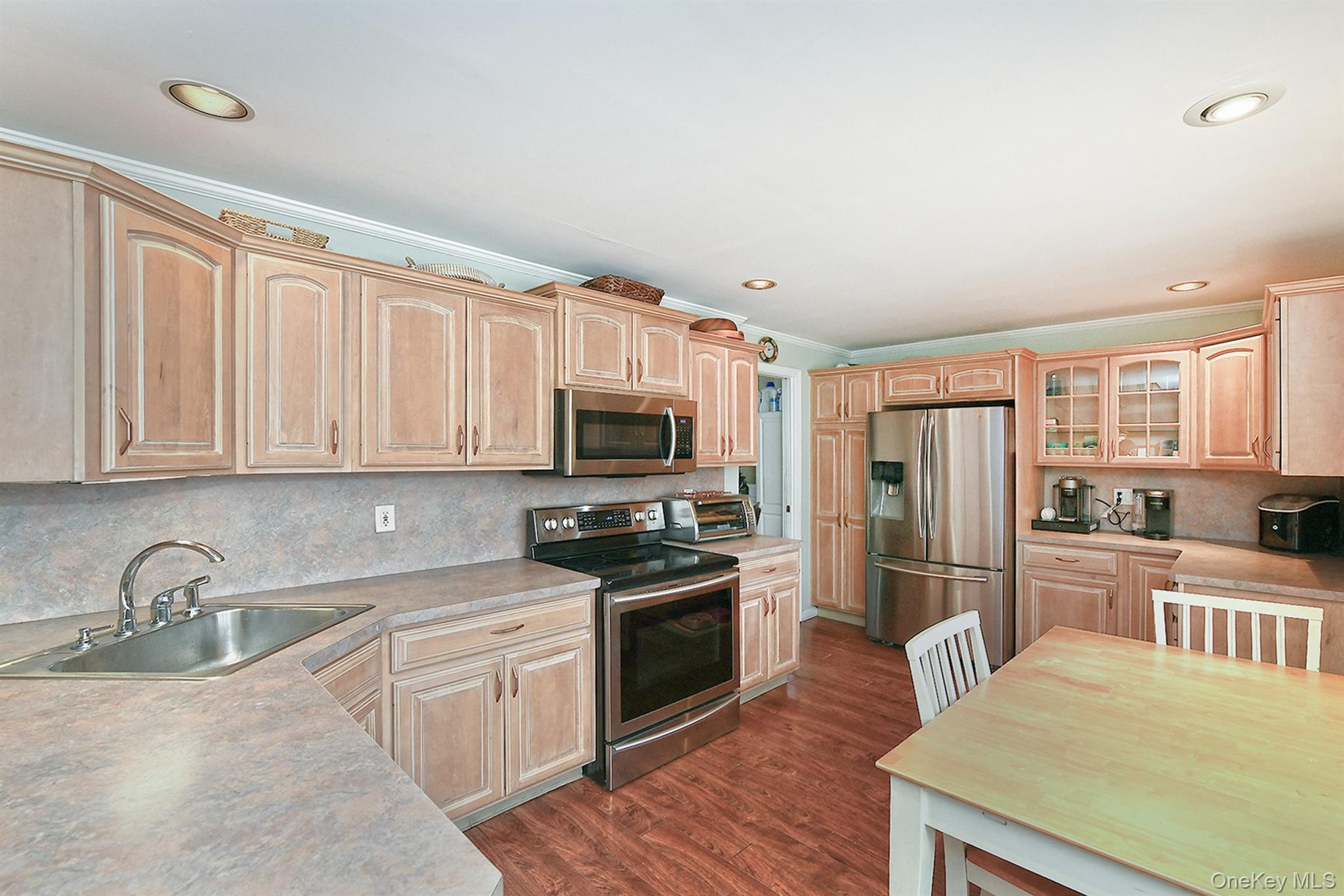 Move right into this spacious 4-bedroom, 2-bath expanded Cape in Levittown offering 1, 459 square feet of living space. The first floor features an extended eat-in kitchen with stainless steel appliances, a one-year-old dishwasher, abundant cabinetry, and a bay window, along with a formal dining room with a large window and wall A/C, an extended living room with tile flooring, wall A/C, and a wood-burning fireplace, a primary bedroom with a large closet, an additional bedroom or home office, a tiled full bathroom, and a separate laundry room. The second floor offers a rear dormer with a large bedroom featuring a big closet and wall A/C, another bedroom with wall A/C, a spacious tiled full bathroom, and a storage room. Additional highlights include overhead lighting throughout, a one-car garage, above-ground oil tank, three-zone heating with a five-year-old boiler, new driveway, crown molding, 150-amp electric service, updated windows, home security system, in-ground sprinklers front and back, and a private fenced backyard with patio and shed, all with low taxes.