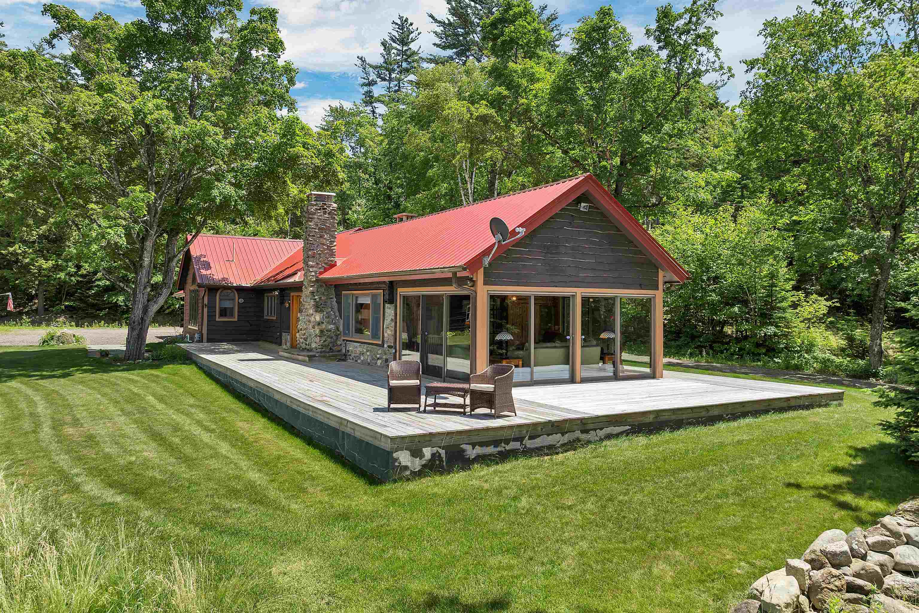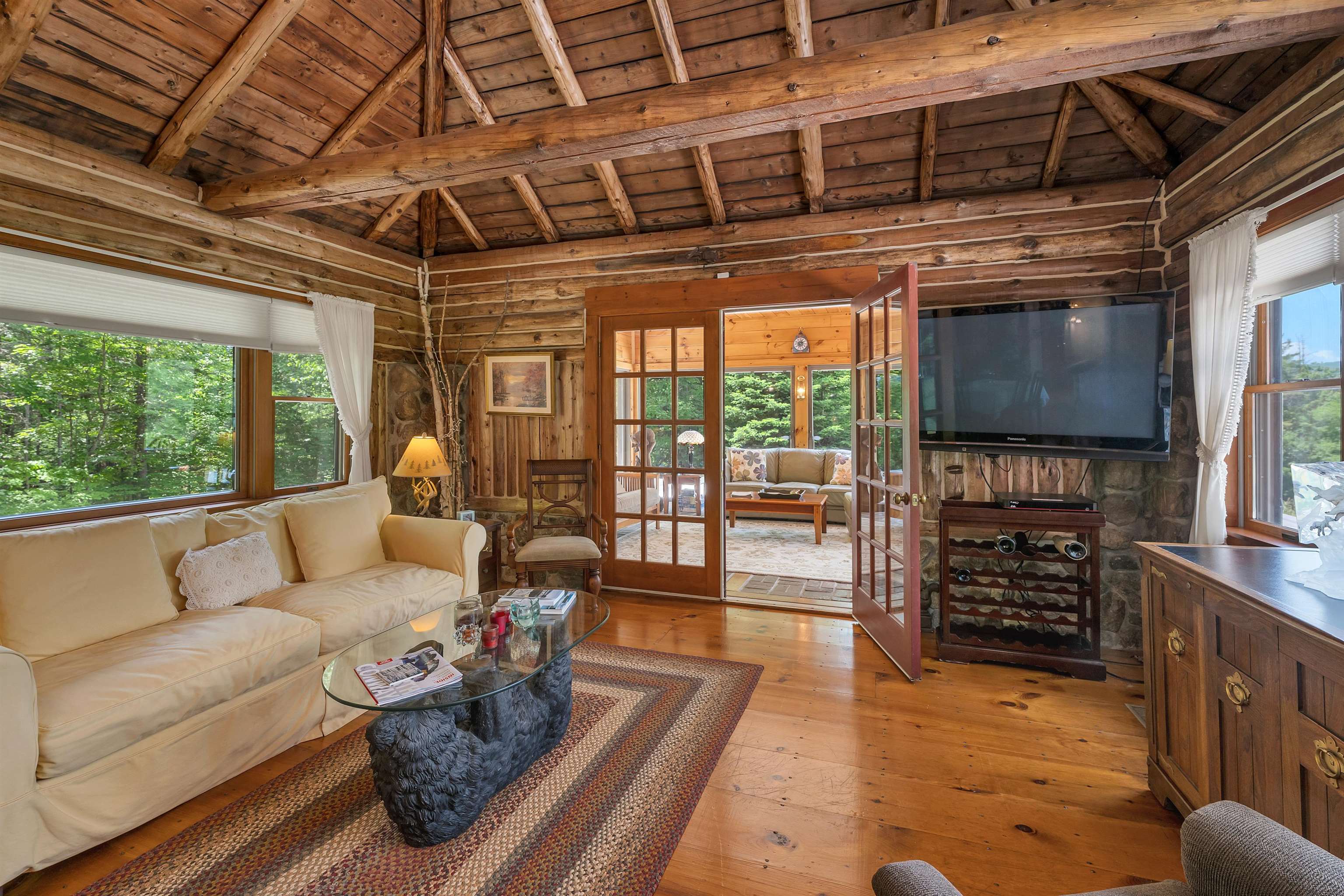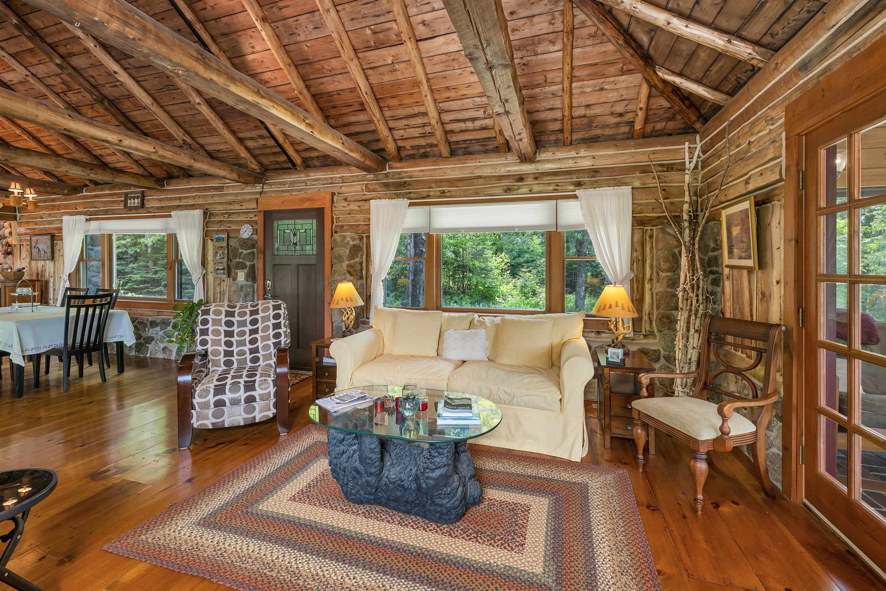 Luxury Log Home Mountain Retreat in Jackson. A Rare Offering on 6 Private Acres. Opportunities like this are truly uncommon. This custom luxury log home blends character, privacy, and versatility in one unforgettable mountain retreat. Set on 6 secluded acres with beautiful views, an open floor plan, and the ease of one-level living, it offers a rare combination of comfort and craftsmanship. Seller financing is available. Renovated in 2020, the home makes a stunning first impression with massive hand-hewn log beams, a soaring cathedral ceiling, and warm natural wood throughout. The great room features wide plank pine floors and a newly added gas fireplace set in a striking natural-stone hearth. The chef-inspired kitchen pairs rustic charm with modern convenience, highlighted by a fully restored antique Raymond wood-burning cookstove framed in stone. Relax in the 4-season sunroom surrounded by nature, or step onto the expansive 1, 200-sqft wrap-around deck for outdoor living at its best. The spacious primary suite includes log walls, a sitting area, walk-in closet, and private bath. Two additional bedrooms—one ensuite—complete the main level. Bonus Space: A detached one-level apartment offers a bedroom, full kitchen, living room with wood stove, full bath with laundry, and its own garage bay. Two oversized garage bays add exceptional storage or workshop options—ideal for guests, rental income, multigenerational living, or a caretaker. The wooded setting includes a stone patio with firepit, a large woodshed, and ample parking. Minutes to skiing, hiking, North Conway, and Jackson Village, this home delivers the perfect blend of luxury, privacy, and mountain-town charm.