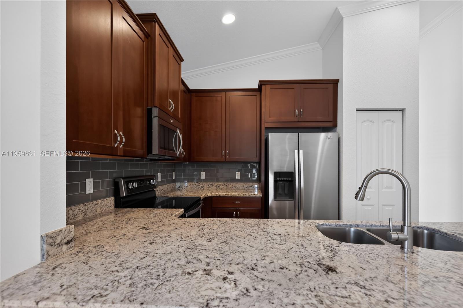 Welcome to this pristine 3-bedroom, 2-bath, 2-car garage home featuring single-story living, and is ready for immediate enjoyment. The upgraded kitchen opens seamlessly to the family room. The spacious primary suite features an oversized walk-in closet and a private ensuite bath with dual sinks, a soaking tub, and a separate shower. Ceramic tile flows through the main living areas, complemented by luxury vinyl flooring in all bedrooms—no carpet. Enjoy modern convenience with smart controls for the A/C, select lighting, and irrigation system. The light-filled open living spaces are ideal for everyday comfort and entertaining. Relax on the screened-in patio, perfect for unwinding or hosting guests. Additional highlights include a fully fenced backyard and impact windows and doors.
