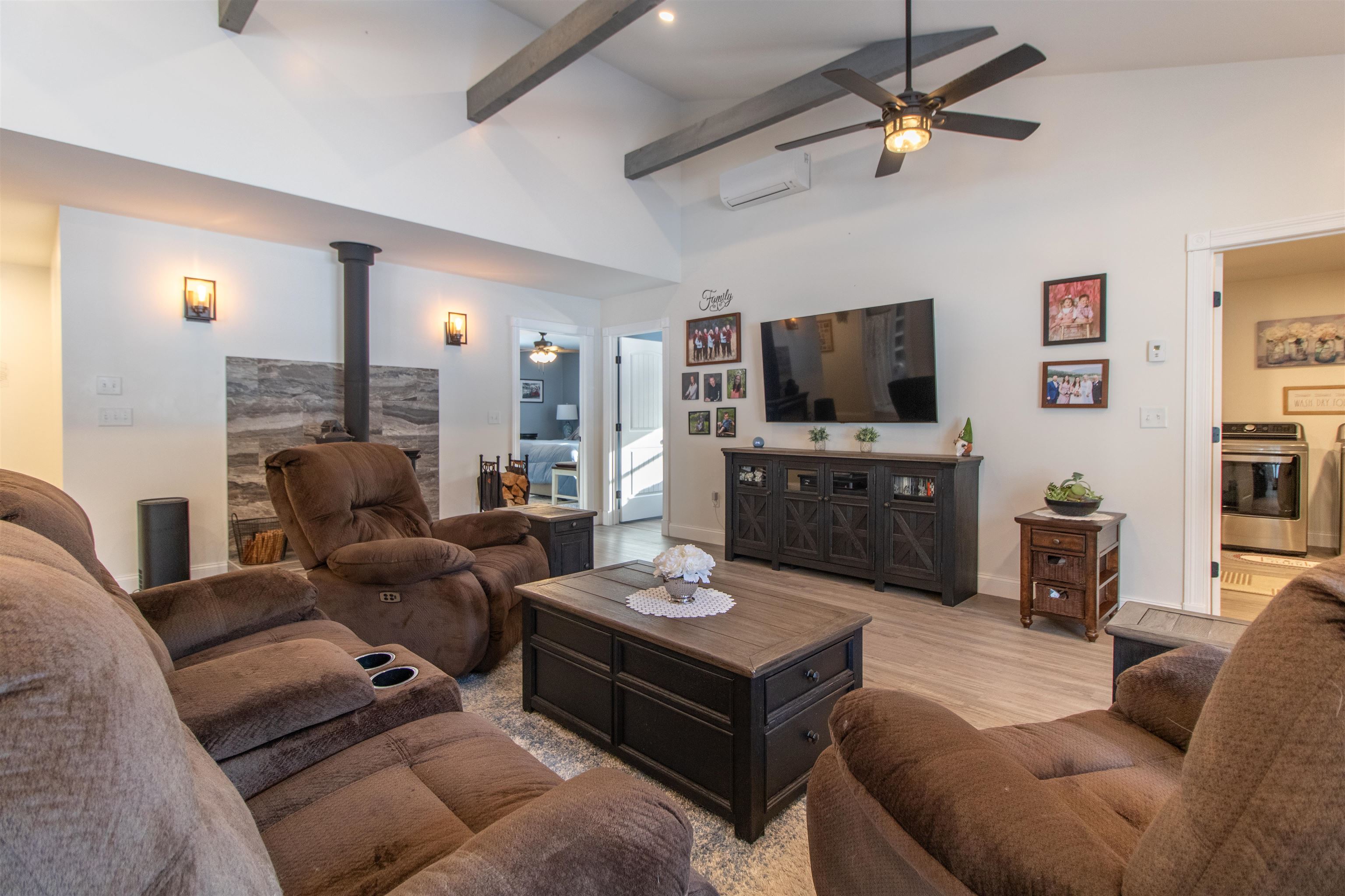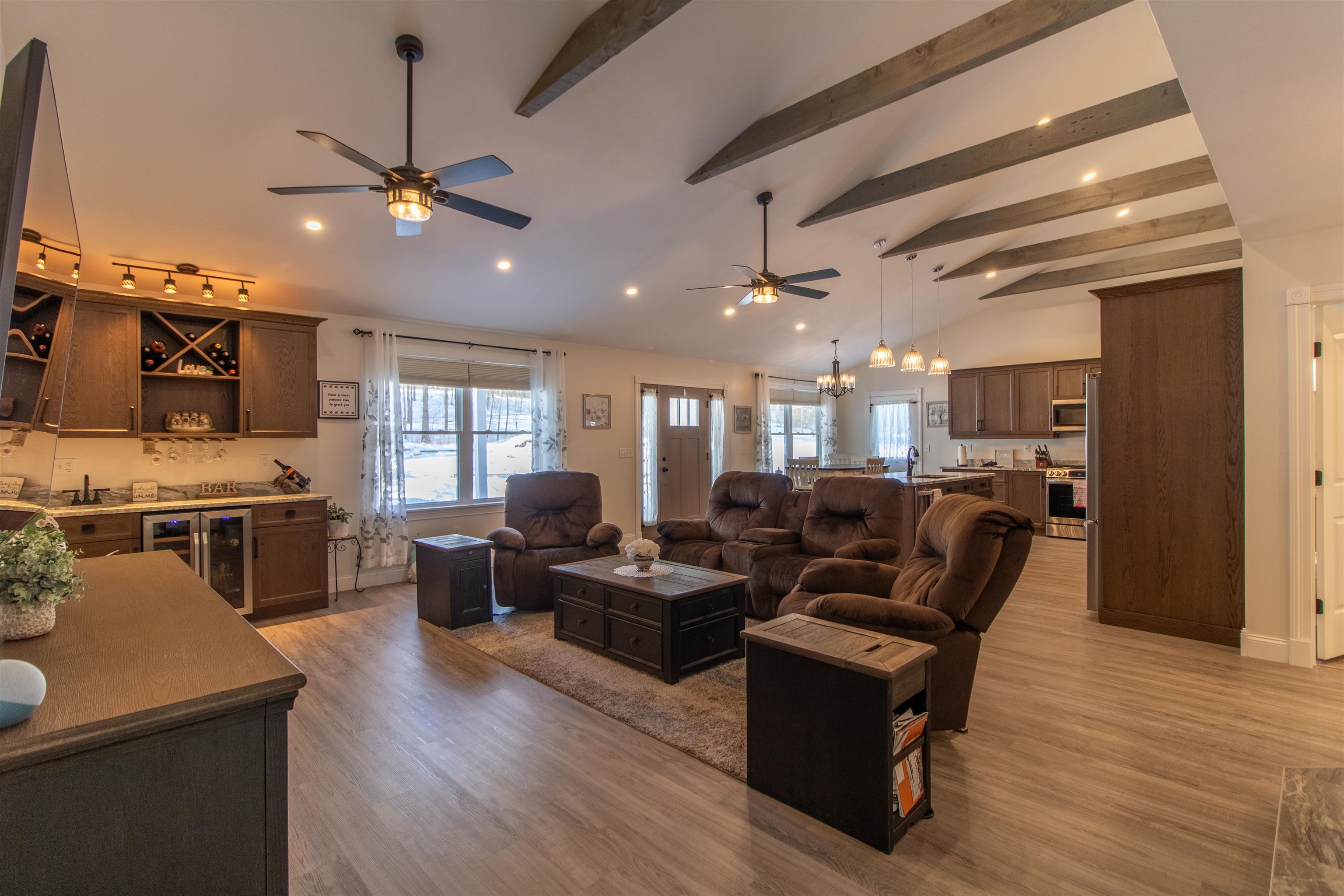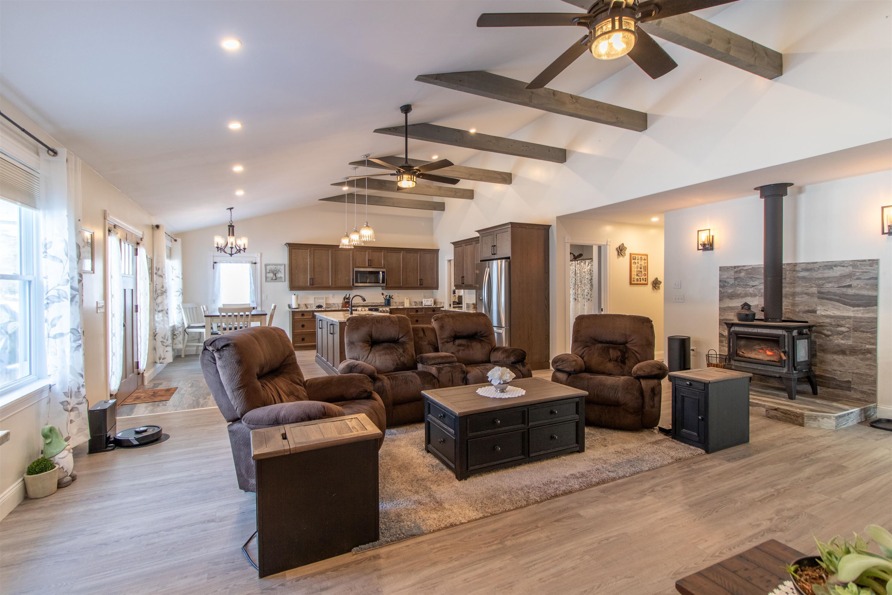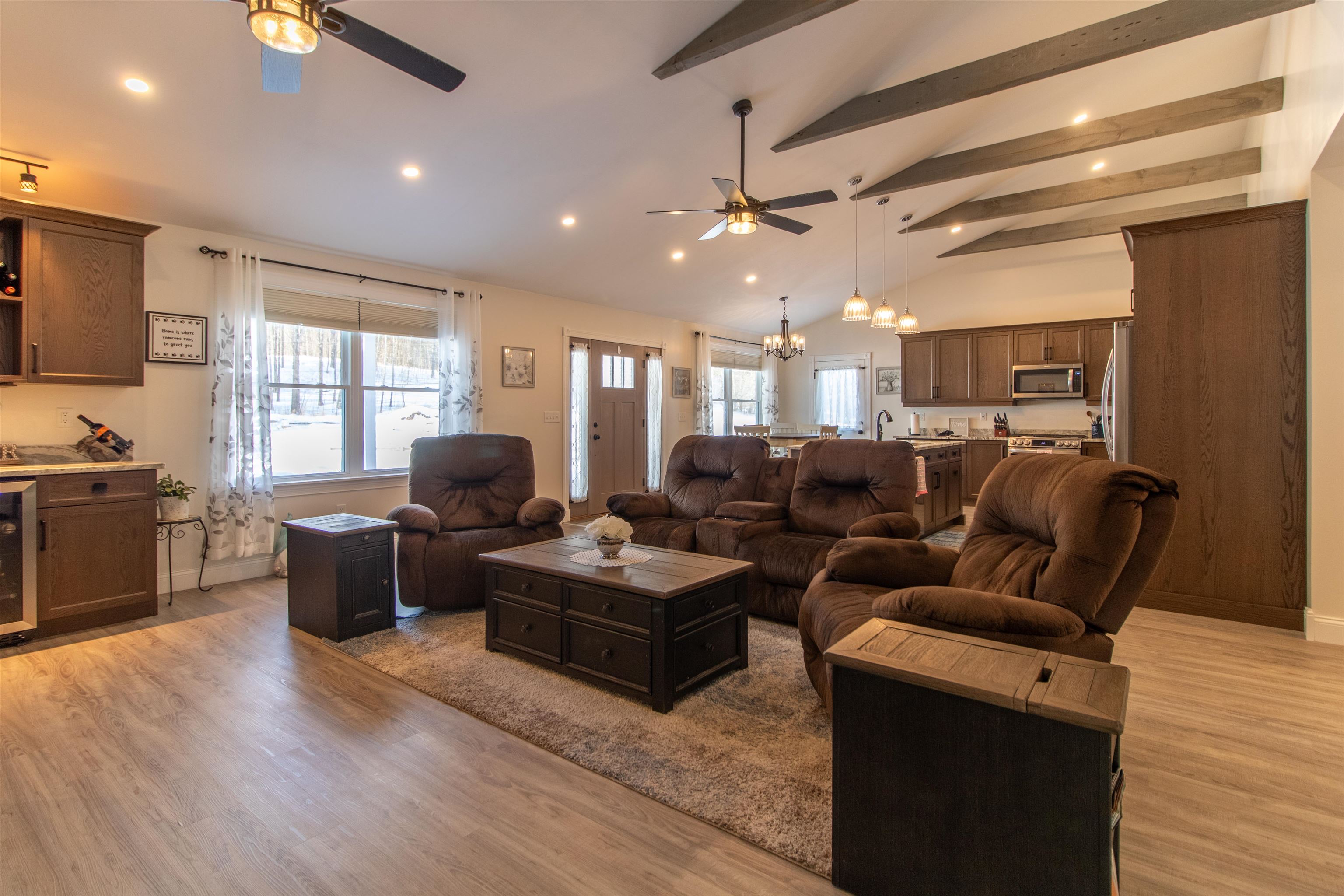 Meticulously maintained newer 3-bedroom ranch set on 29 private acres. This 2-bath home offers an open-concept layout with a spacious kitchen featuring a large island and an inviting living area centered around a Hearthstone wood stove, perfect for cozy evenings. The primary suite includes a walk-in closet and a private bath. The property includes appliances and most furniture, making it turnkey. The property consists of an attached 2+ car garage with a third bay ideal for smaller toys or equipment, plus a detached garage and a woodshed conveniently located a short distance from the home. There is also dry storage above the attached garage. Enjoy an extensive trail network throughout the land, perfect for snowshoeing, hiking, and cross-country skiing, with easy access to the VAST trail system for snowmobiling. Jay Peak Ski & Resort is nearby, making this an exceptional four-season Vermont retreat offering comfort, and recreation.