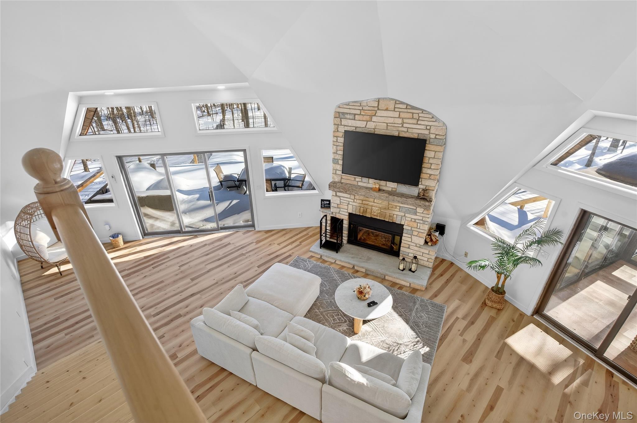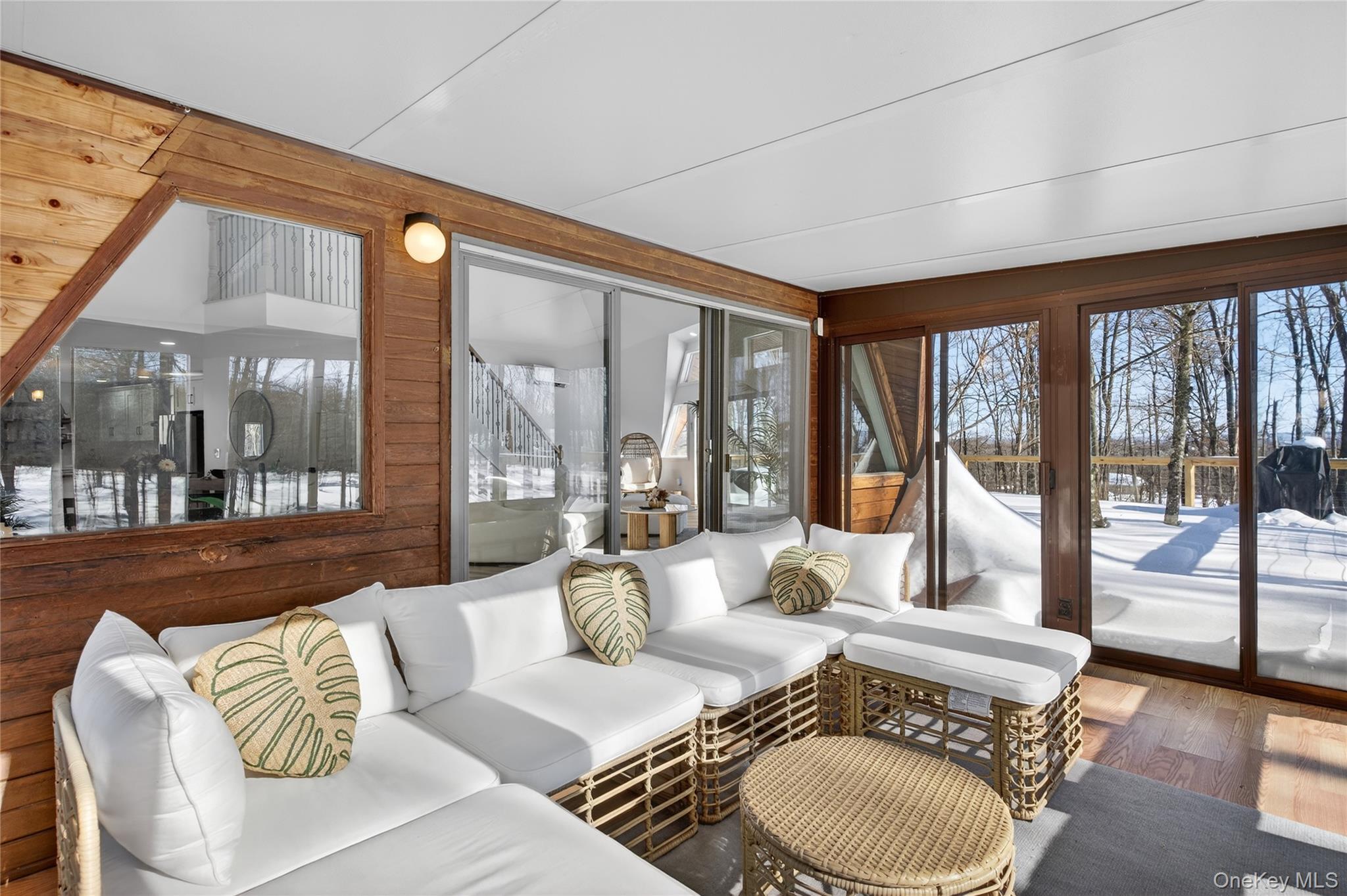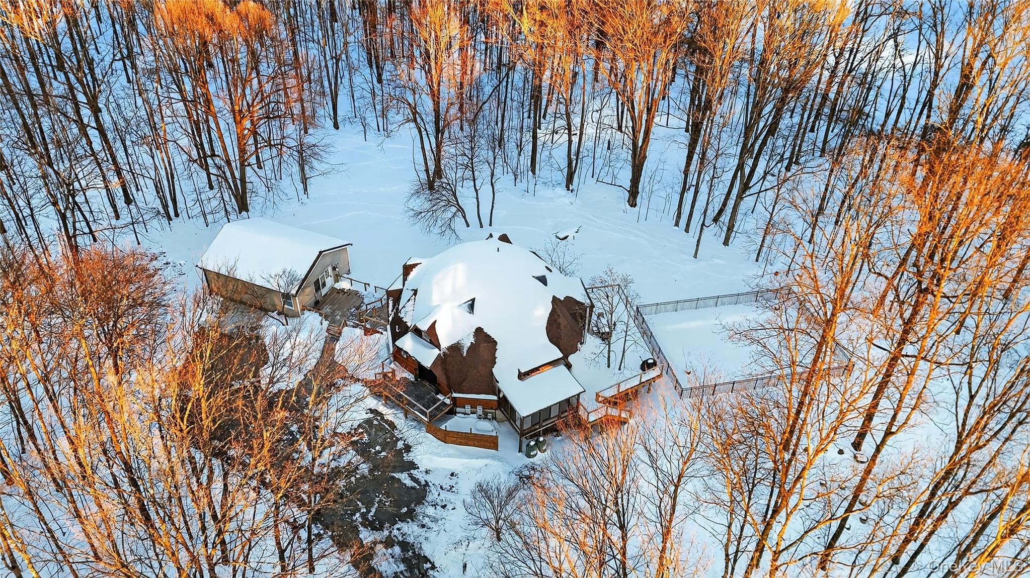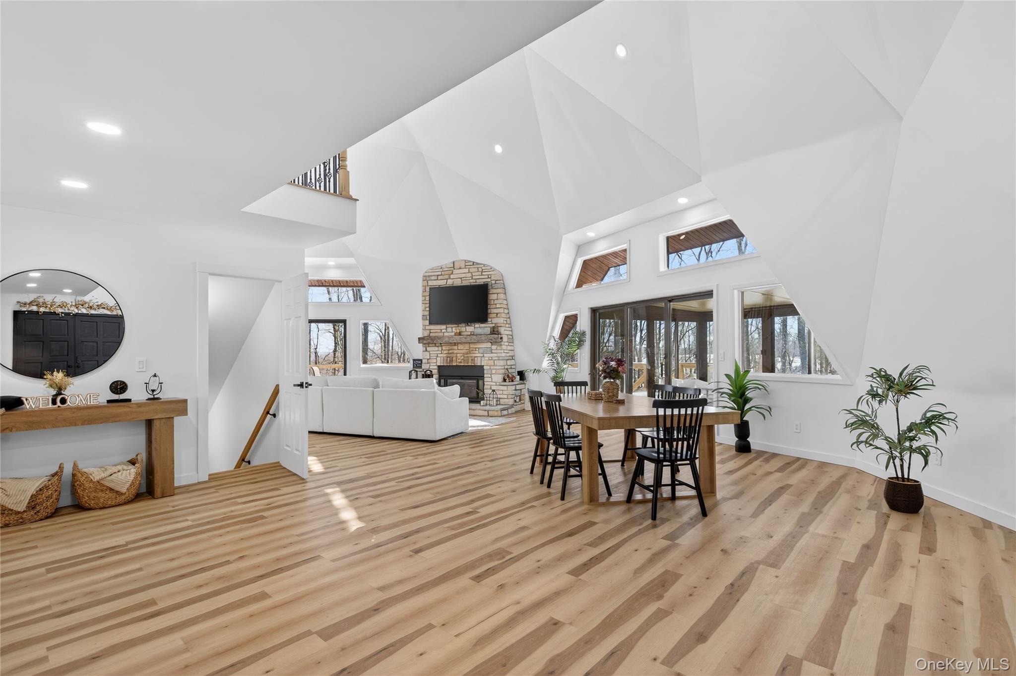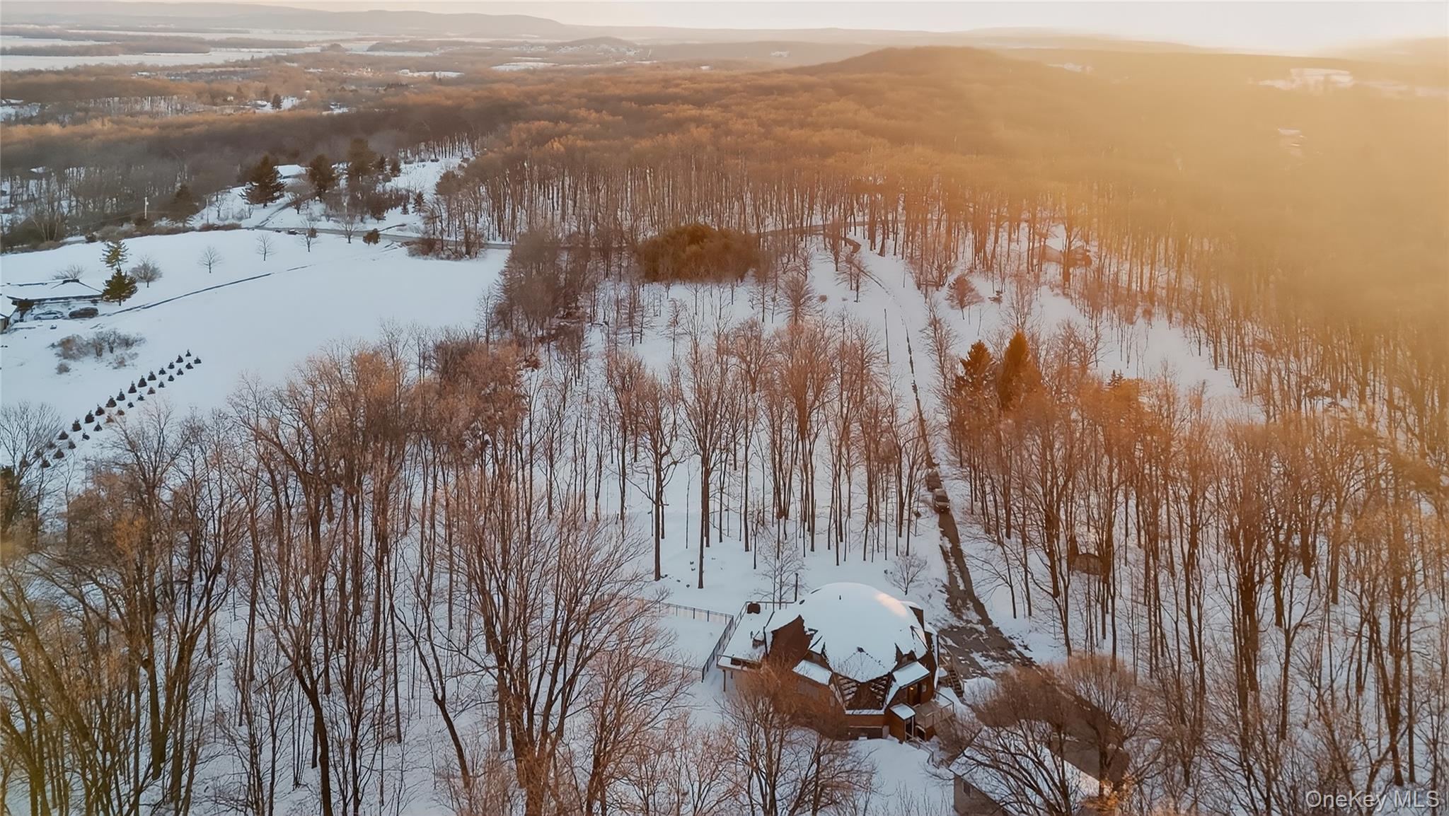 A Private Mini-Estate of Architectural Distinction in the Goshen School District. Set within the quiet preserve of over 10 acres of wooded grounds, this fully renovated architectural geodesic dome residence—known locally as The Wooden Igloo—offers a rare opportunity to own a true mini-estate that blends iconic design, modern luxury, and exceptional flexibility. Thoughtfully reimagined from top to bottom, the property delivers nearly 3, 000 square feet of distinctive living space, complemented by a separate, legal 660 sf guest cottage. The main residence features five bedrooms and three-and-a-half bathrooms, designed with an open, flowing layout and 20+ ft, double-height ceilings that feel both expansive and calming. The main level is entirely open, ideal for both entertaining and quiet evenings at home. It is anchored by a wood-burning stone fireplace, generous living and dining areas, and a sunroom wrapped in full-height windows—a space that fills with natural light and warmth throughout the day while offering peaceful views of the surrounding landscape. A primary suite with a stand-alone whirlpool tub, shower, and dual vanity on the first floor adds ease and long-term livability. Above, three additional, very well-sized bedrooms and a full bath provide their own sense of separation and privacy. The fifth bedroom is down below, facing the walkout patio that links to the in-ground swimming pool. The rest of the lower level is purpose-built for both business and leisure, featuring a theater-style media space for movie nights, a dedicated home office, and plenty of flexibility that is well-suited for a gym, studio, or additional entertaining—quietly removed from the main living areas when privacy is desired. Throughout the home, multi-zone ductless heating and air conditioning ensure comfort year-round, making the space equally inviting in every season. Beyond the main residence, the estate includes a fully renovated, legal two-bedroom cottage with its own full bath, laundry, and independent heating and air conditioning. Ideal for extended family, guests, or staff, the cottage also offers the option for rental income, all while maintaining a comfortable sense of separation from the main home. The grounds invite you to slow down and enjoy the setting—relax by the swimming pool in the summer sun, explore the open acreage, or simply take in the stillness and privacy that only land of this scale can provide. There is also a distinct opportunity to possibly subdivide your property, if you so choose, to build additional homes for the ultimate compound, or to sell. Despite its serene, retreat-like atmosphere, the property is just 15 minutes from both Goshen and Middletown, offering convenient access to shopping, dining, healthcare, and major roadways, all while remaining within the highly regarded Goshen School District. Additionally, the home is only around 30 minutes to Stewart International Airport and Air National Guard Base, 25 minutes to Wodbury Commons with commuter bus routes to NYC, 1 hr 15 minutes for a direct commute to NYC, 40 minutes to West Point to watch Army Football, Hockey, and more, and just minutes from I-84 and I-87 access. Distinctive, tranquil, and meticulously updated, this one-of-a-kind mini-estate offers architectural significance, refined comfort, and rare flexibility—an exceptional opportunity for the discerning buyer seeking privacy, presence, and a true sense of place. Make it yours!