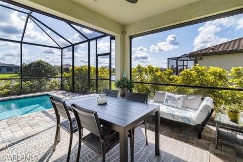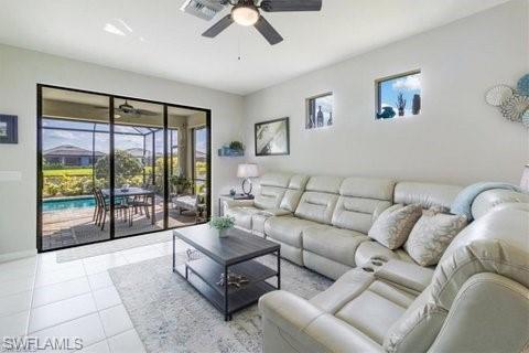 This breathtaking Serenity model is in the 55+ Del Webb Golf Community. Enjoy 10ft ceilings, tile/luxurious vinyl plank flooring throughout, 2 bedrooms both with spacious walk-in closets, den/office with French doors, 2 full bathrooms, private pool, and 2 car Epoxied Garage Floor. This home Features a delightful kitchen with upgraded White shaker cabinets, pull out shelves, beautiful backsplash, pantry, breakfast bar and a generous amount of granite countertops for cooking and entertaining. The Living room is very inviting with plenty of natural light and three sliding glass doors that fully open onto the covered lanai. Walk into your Primary suite and enjoy the haven of comfort and relaxation with a large walk-in closet and a stunning view of your outdoor oasis. The Primary Luxurious Bathroom is outfitted with a glass-enclosed shower, private water closet, spacious dual upgraded vanity with plenty of drawers and large linen closet. Enjoy your elegant backyard with your very own private salt water/heated pool. Fully screened with a peaceful view of the matured landscaping overlooking the tranquil lake. Home has been upgraded with remote control lanai hurricane shades and easy close shutters on all windows. Perfect location. Five-minute golf cart ride to Panther Run Golf Course, easy walking distance to the State-of-the-Art Amenities center with a full gym, resort pool, lap pool, Jacuzzi, sauna, pickleball, tennis, bocce courts, billiards, golf simulator, restaurants and so much more. Experience The small town living in Ave Maria.