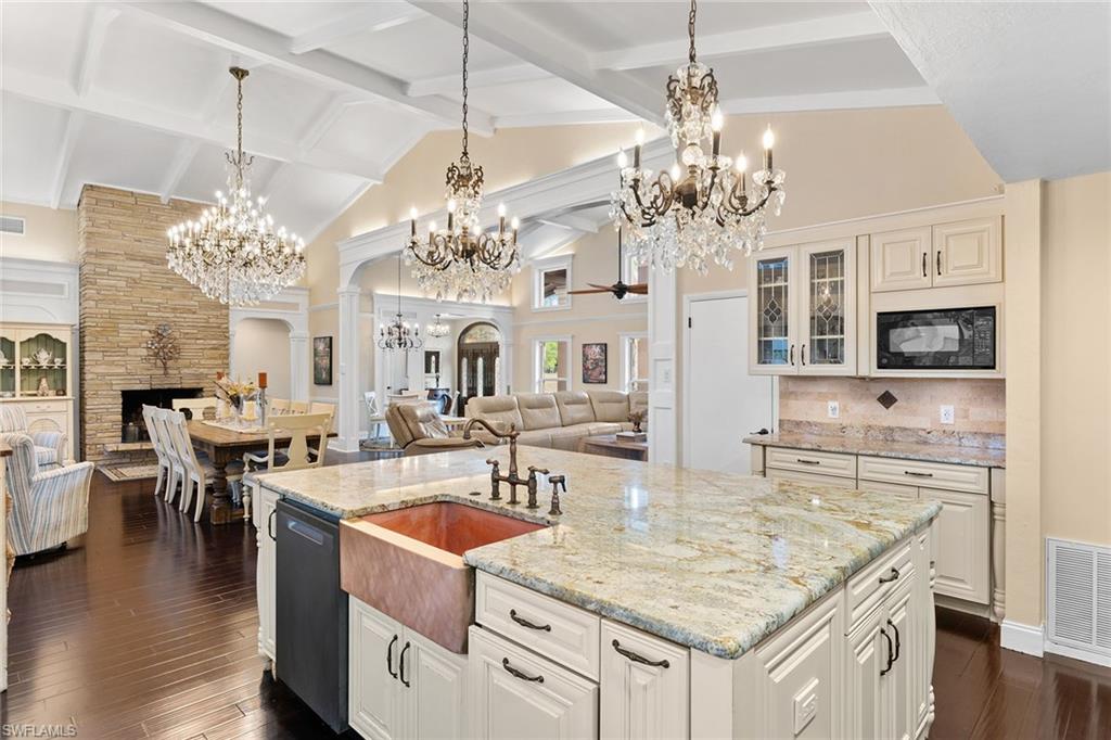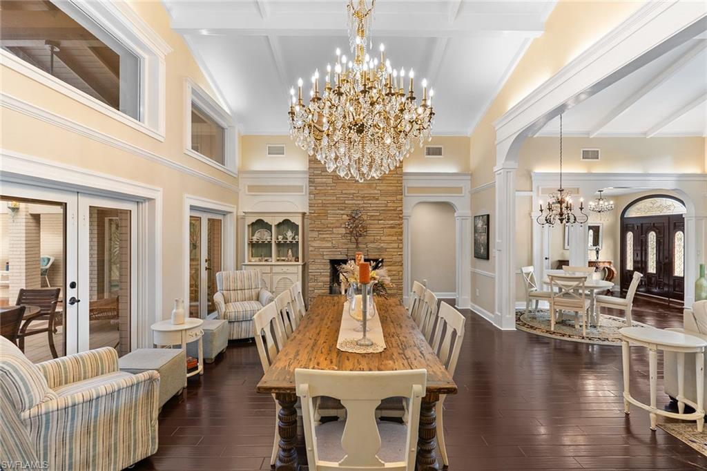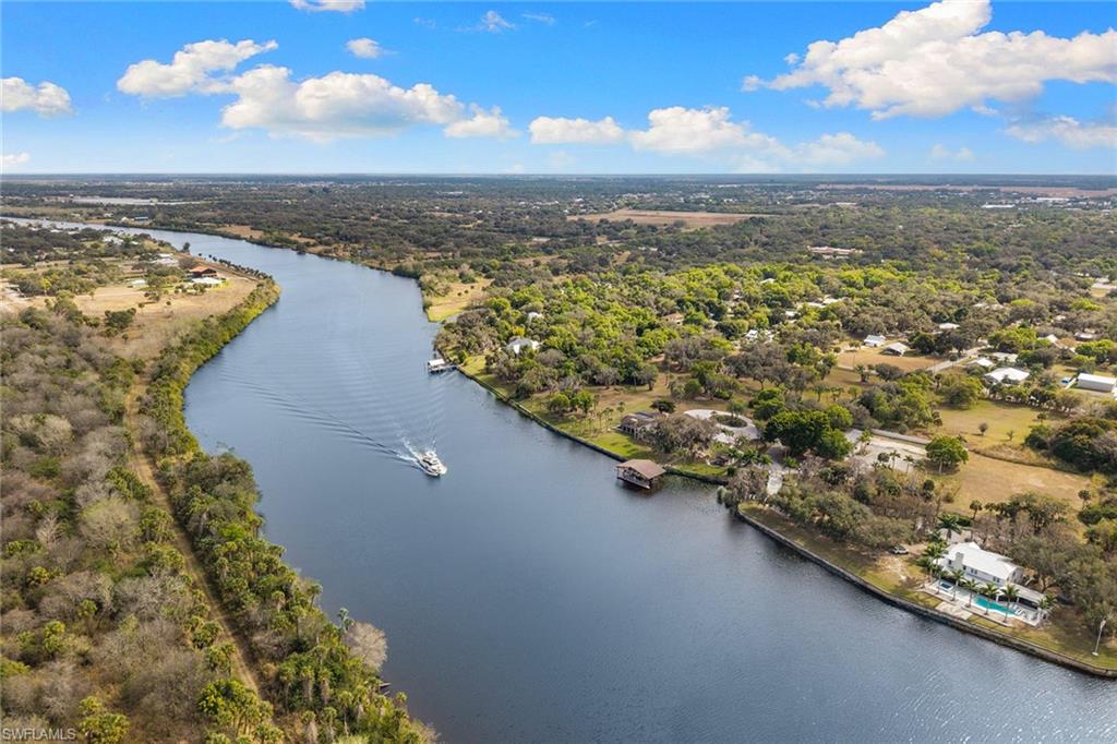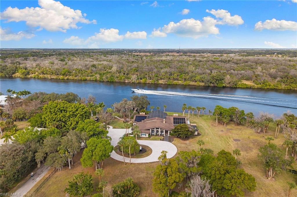 This one-of-a-kind five-plus acres riverfront estate offers approximately 400 feet of Caloosahatchee River frontage located on the great loop. The home has had only two owners and has been thoughtfully curated with timeless architectural character and extensive modern updates, including whole-home generator, security system, photovoltaic solar panels, pool equipment, renovated kitchen and baths, laundry, updated flooring, lighting, courtyard, dock, and a new paver driveway. The formal living space features an original sandstone fireplace and stunning river views from the kitchen, dining and living areas. There is also a private courtyard accessible from three of the bedrooms, including the primary. Outdoor living is surrounded by over 150 palms and grand oaks, including a resort-style saltwater pool and spa, a large entertainment pavilion, a covered 50-by-50-foot dock, with 50A Shore Power, and two 10, 000-pound boat lifts, providing Intracoastal access. A rare opportunity to own a timeless riverfront retreat designed for unforgettable gatherings and generations of memories to come.