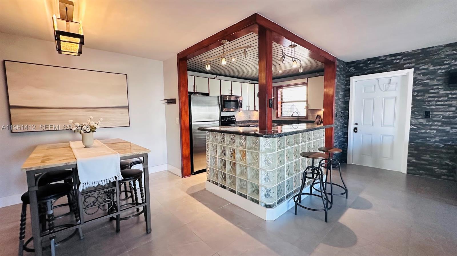 The home features a bright, open living and dining area with large windows that flood the space with natural light and is perfect for entertaining. Porcelain tile flooring throughout, impact windows, and a covered screened porch, offering a peaceful outdoor space ideal for morning coffee or evening relaxation.
