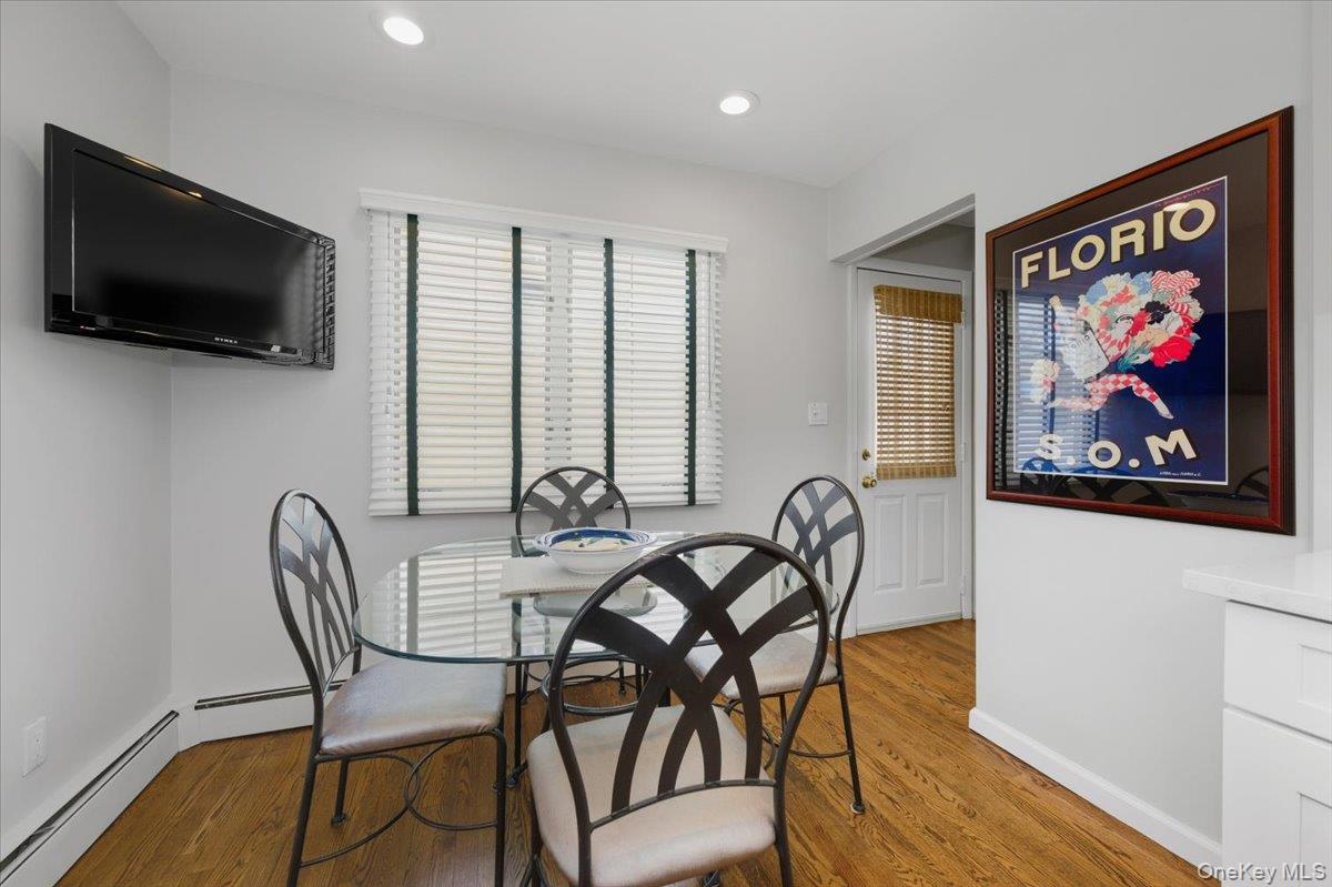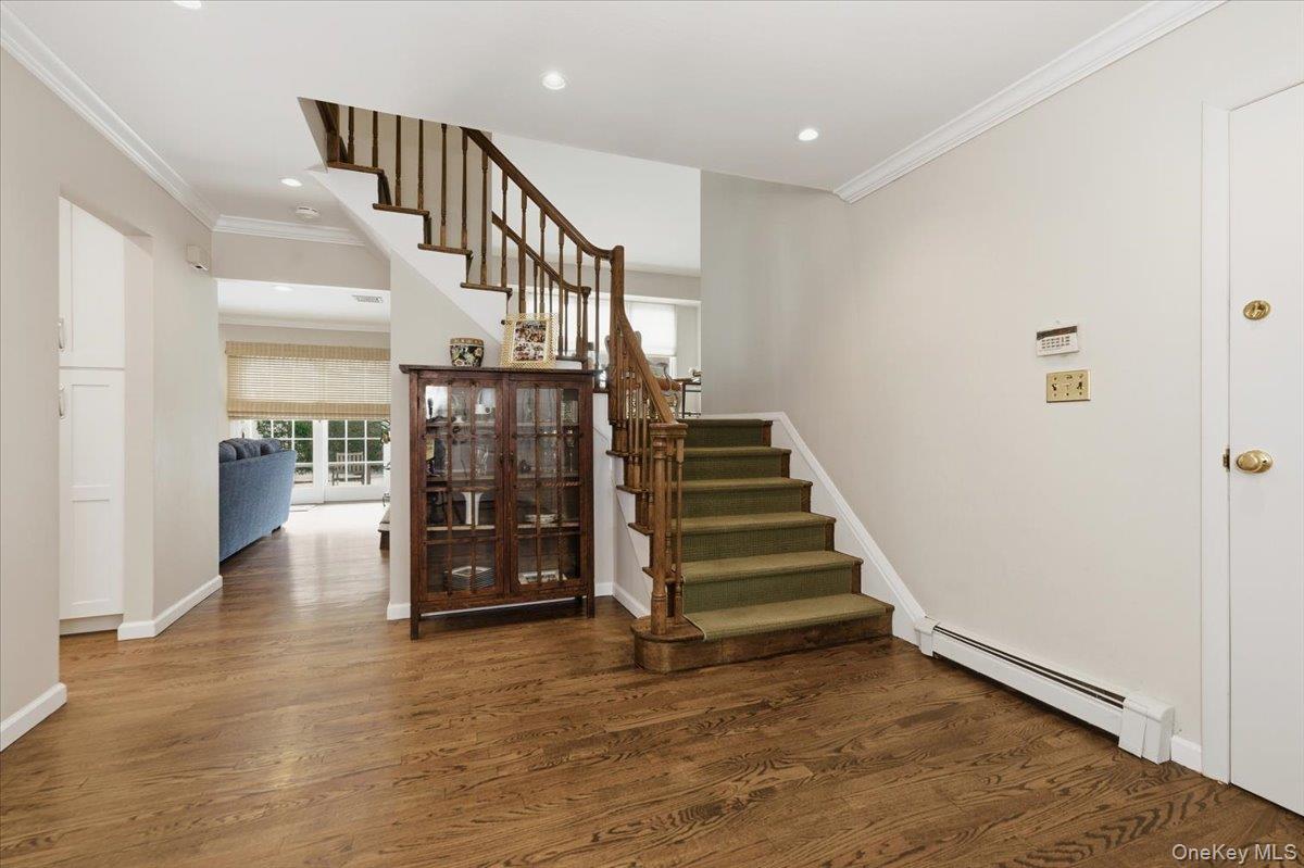 Welcome to this beautifully maintained splanch-style home offering the perfect blend of space, style, and functionality. The inviting double-door entry welcomes you into a bright foyer featuring a convenient powder room. The formal dining room seamlessly opens to the updated kitchen, showcasing quartz countertops, white paneled wood cabinetry, and a spacious pantry—ideal for both everyday living and entertaining. Just beyond the kitchen, the warm and inviting family room features a charming wood-burning fireplace and sliding glass doors that lead to a fully fenced backyard, perfect for outdoor gatherings and relaxation. A half flight up, the elegant formal living room boasts cathedral ceilings and a stunning wall of windows that flood the space with natural light while offering beautiful views of the property. The upper level features four generously sized bedrooms, including a spacious primary ensuite, three additional guest bedrooms, and a full guest bath. A striking wooden banister connects all three levels, complementing the beautiful hardwood floors that run throughout the home. Additional highlights include a partial basement offering storage and laundry space, an attached one-car garage, leased solar panels for energy efficiency, and a multi-car driveway. This home truly offers a complete package of comfort, design, and convenience. Close Proximaty to beautiful Baldwin Park.