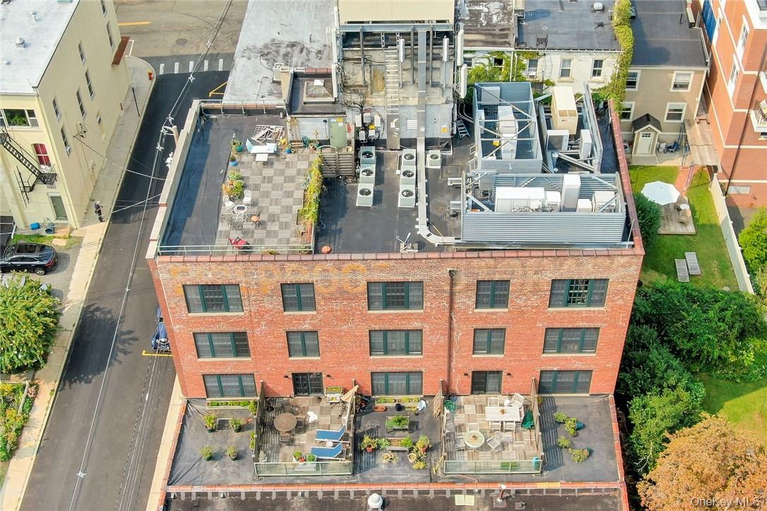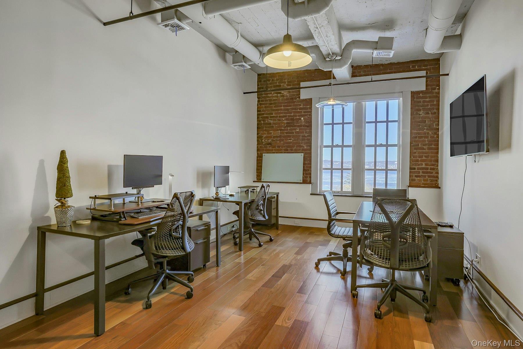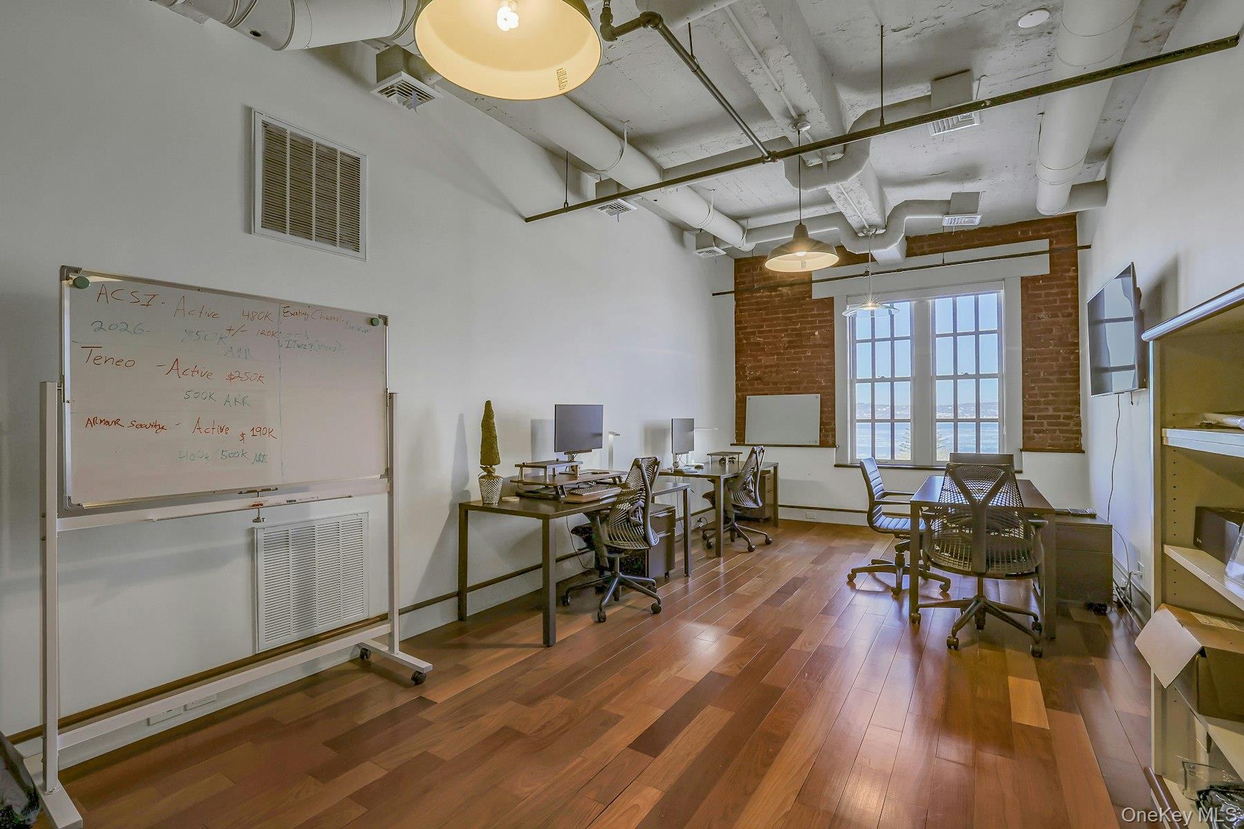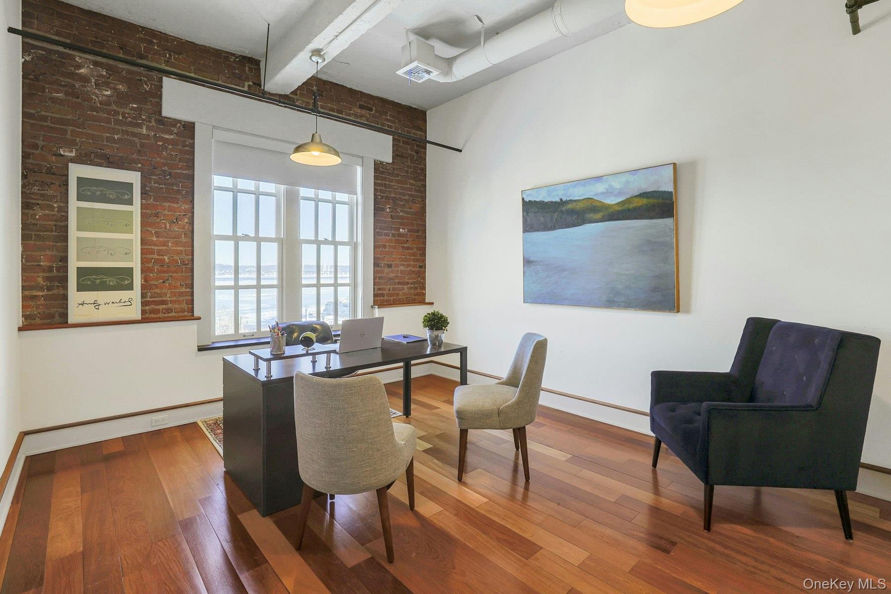 Extraordinary six-room office suite perched on the top floor of the historic Nyack Express Building in the heart of downtown Nyack, offering breathtaking, wide-open views of the Hudson River. Tenant has access to roof top deck too. This sun-filled space—originally a moving and storage building—was completely rehabilitated in the early 2000s and now boasts a refined industrial aesthetic with exposed brick walls, 12-foot concrete ceilings, true divided-light Marvin windows, and warm wood floors throughout. Feels more like an Amon Resort than an office rental. A luxury rental for a tenant looking to make a statement for its brand or one who loves style. The suite features a welcoming reception area (which can also function as an office), four large river-facing rooms, plus an additional room ideal for an office, conference room, or studio. Tenants enjoy access to a chef’s kitchen equipped with a professional-grade Garland stove, as well as a rooftop deck overlooking the Hudson—perfect for breaks or informal meetings. Ideally located just 1/2 block to the Hudson River, off North Broadway, two blocks from Main Street, and steps from the Runcible Spoon Cafe. A truly inspiring alternative to working from home.
