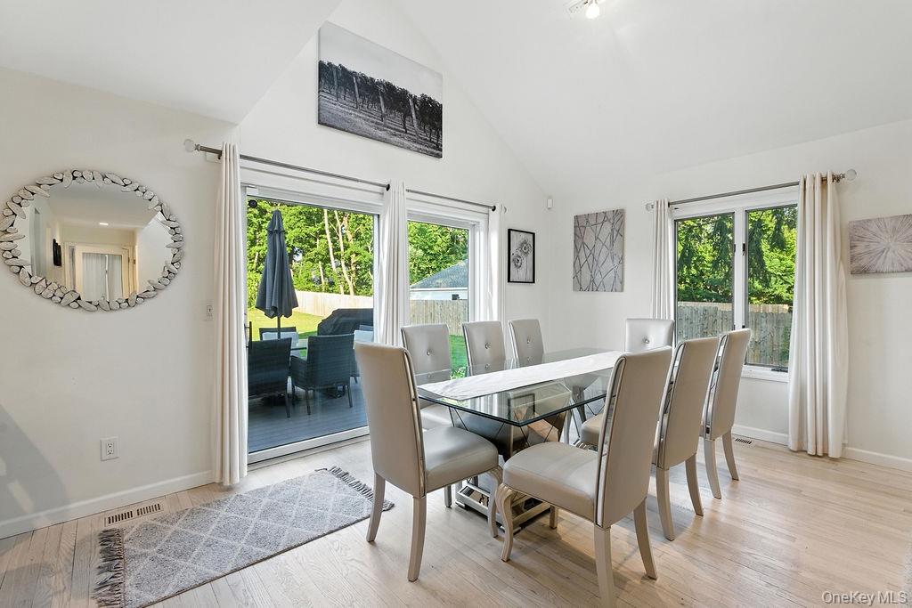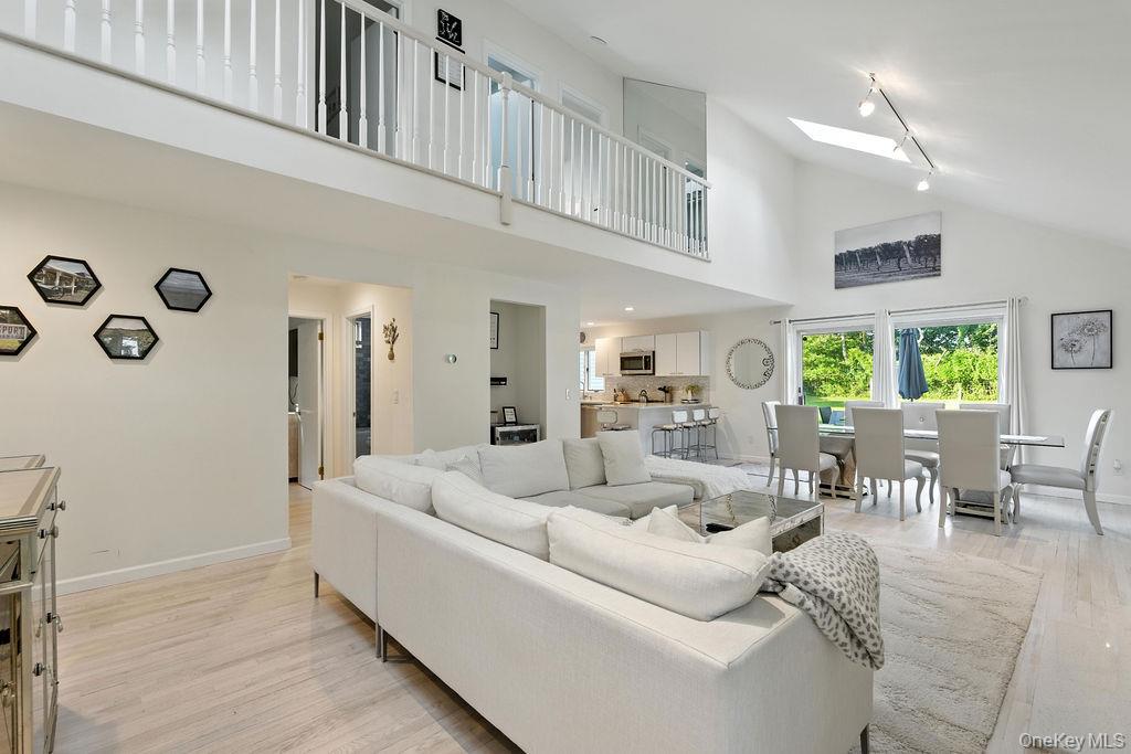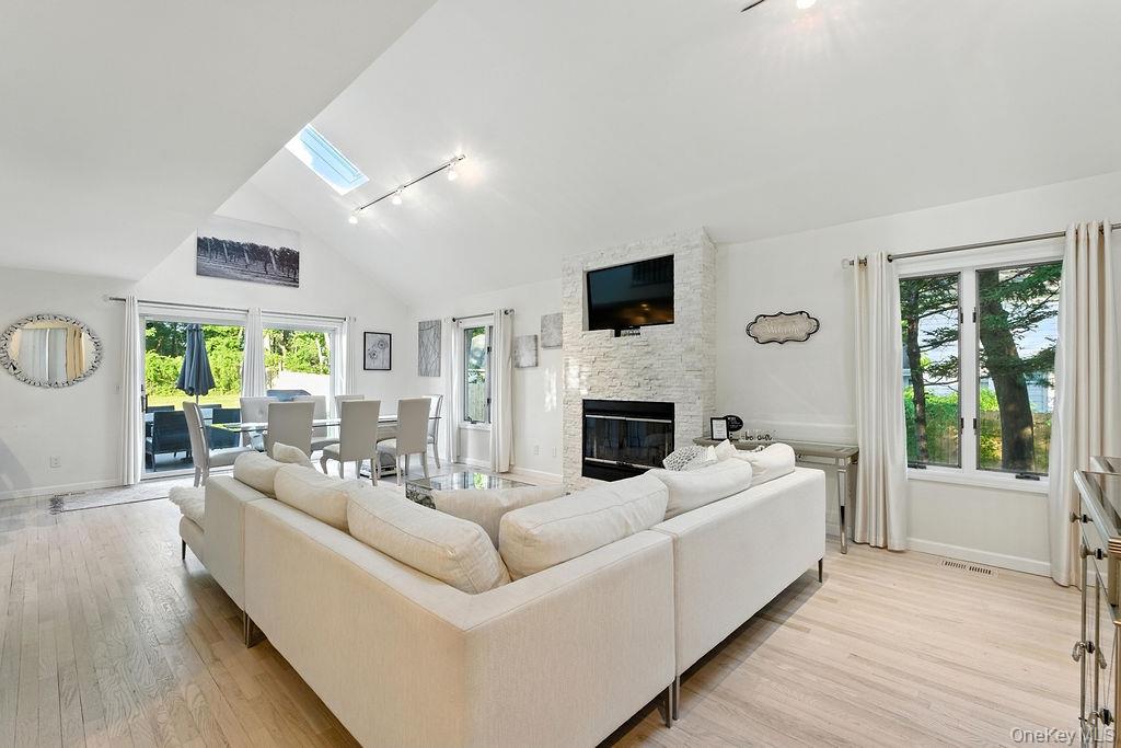Welcome to this secluded and bright home nestled next to a beautiful apple orchard in the heart of Jamesport Hamlet. This elegant home boasts 3 bedrooms and 2 bathrooms with an open floor plan. Forced air climate control throughout the home with vaulted ceilings and skylights for natural light, large parking garage for many cars and an electric car charging station! This property features beach rights, close proximity to wineries, wedding venues, restaurants, breweries, aquarium, splish splash, tanger, Greenport, Southold and orient point!
