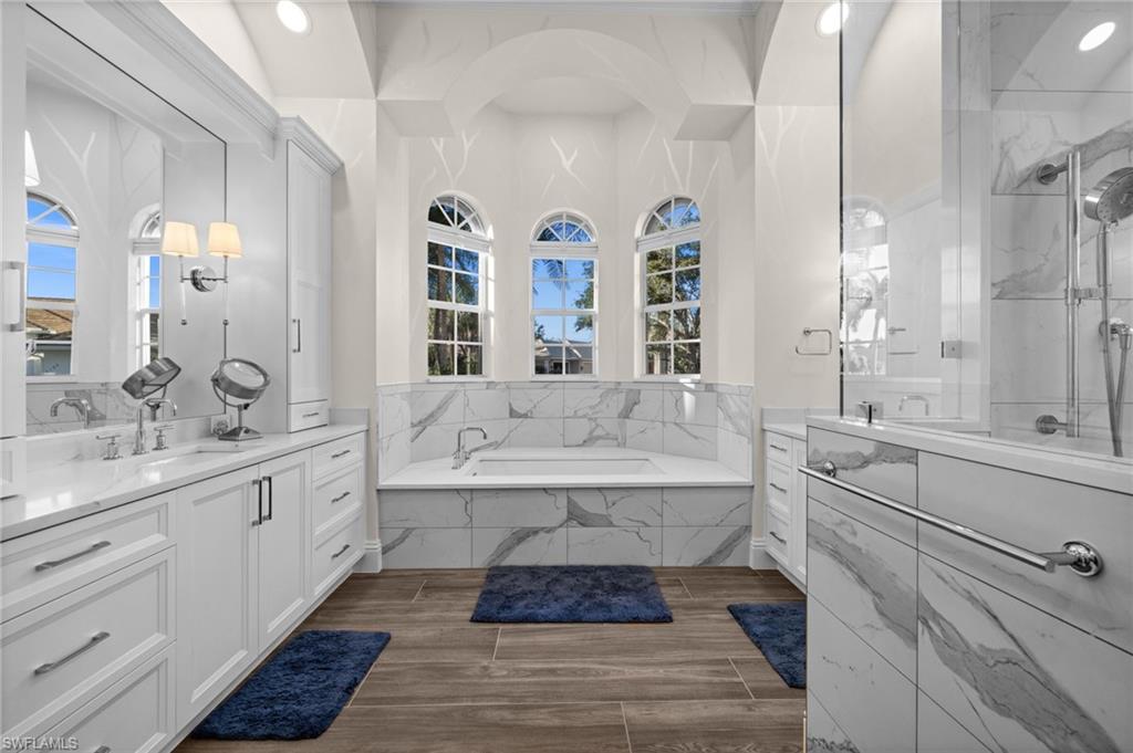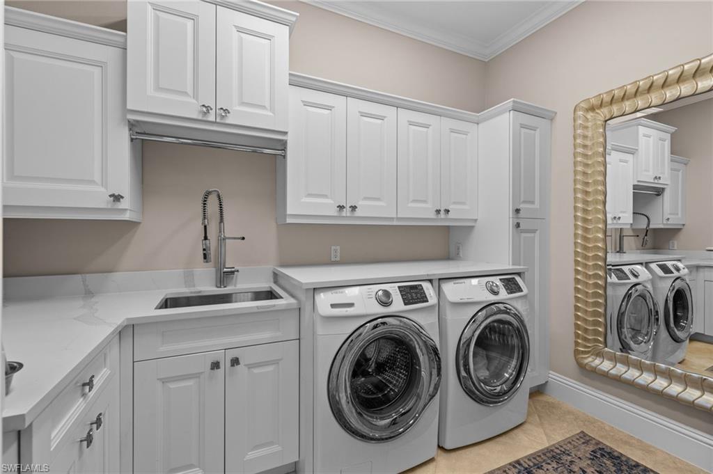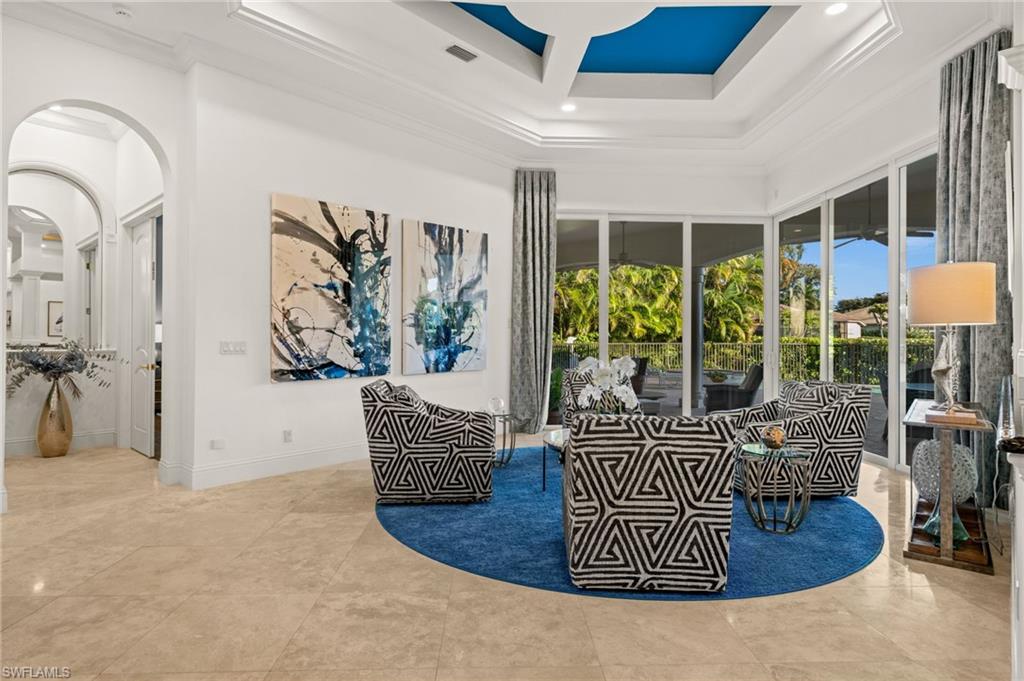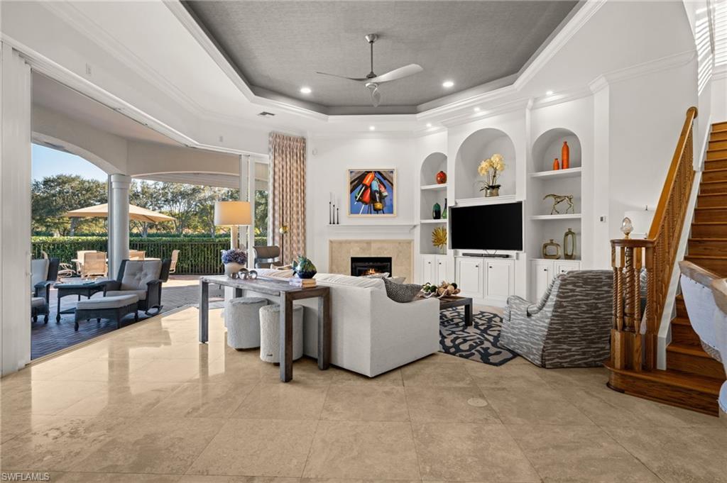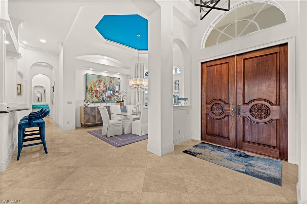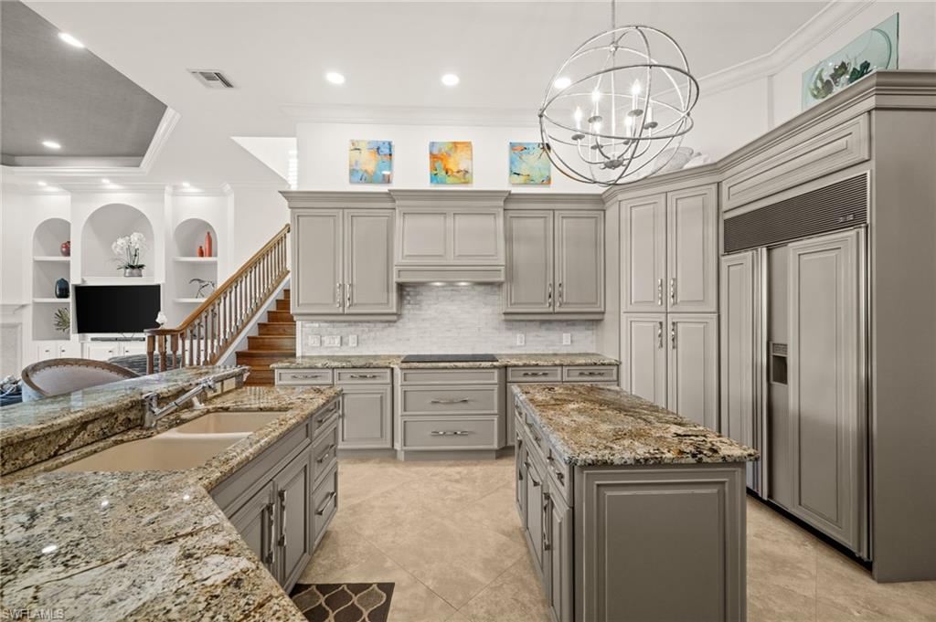 Designed for both grand entertaining and comfortable daily living, the home showcases marble flooring, granite countertops, high-end appliances, custom built-ins, detailed ceilings with crown molding, and elegant lighting throughout. The chefs kitchen with beautiful cabinets, wall oven and bar top make coupled with a stunning interior wet bar further enhances the home’s entertaining appeal.