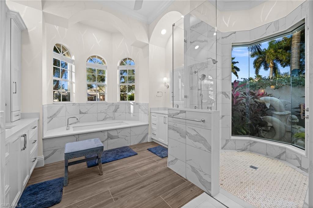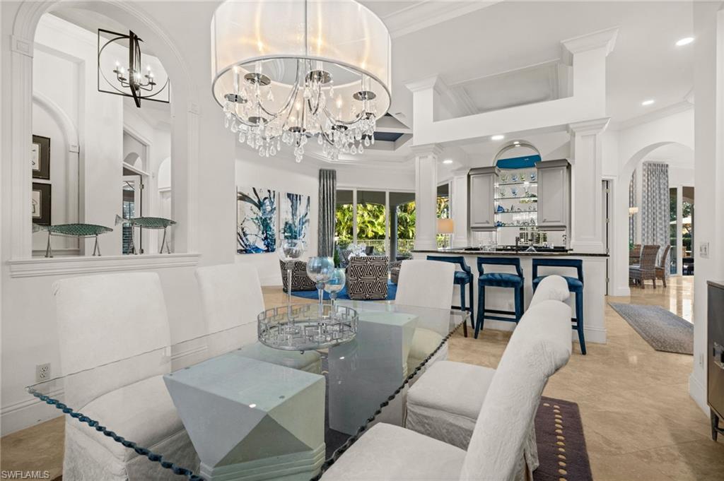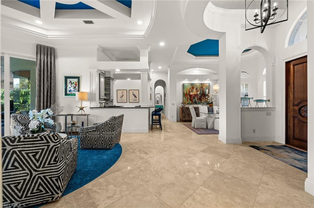 Situated in the prestigious Pelican Marsh community and just minutes from world-renowned shopping and dining, this exceptional lakefront residence offers refined luxury on an expansive, meticulously landscaped homesite with custom lighting.