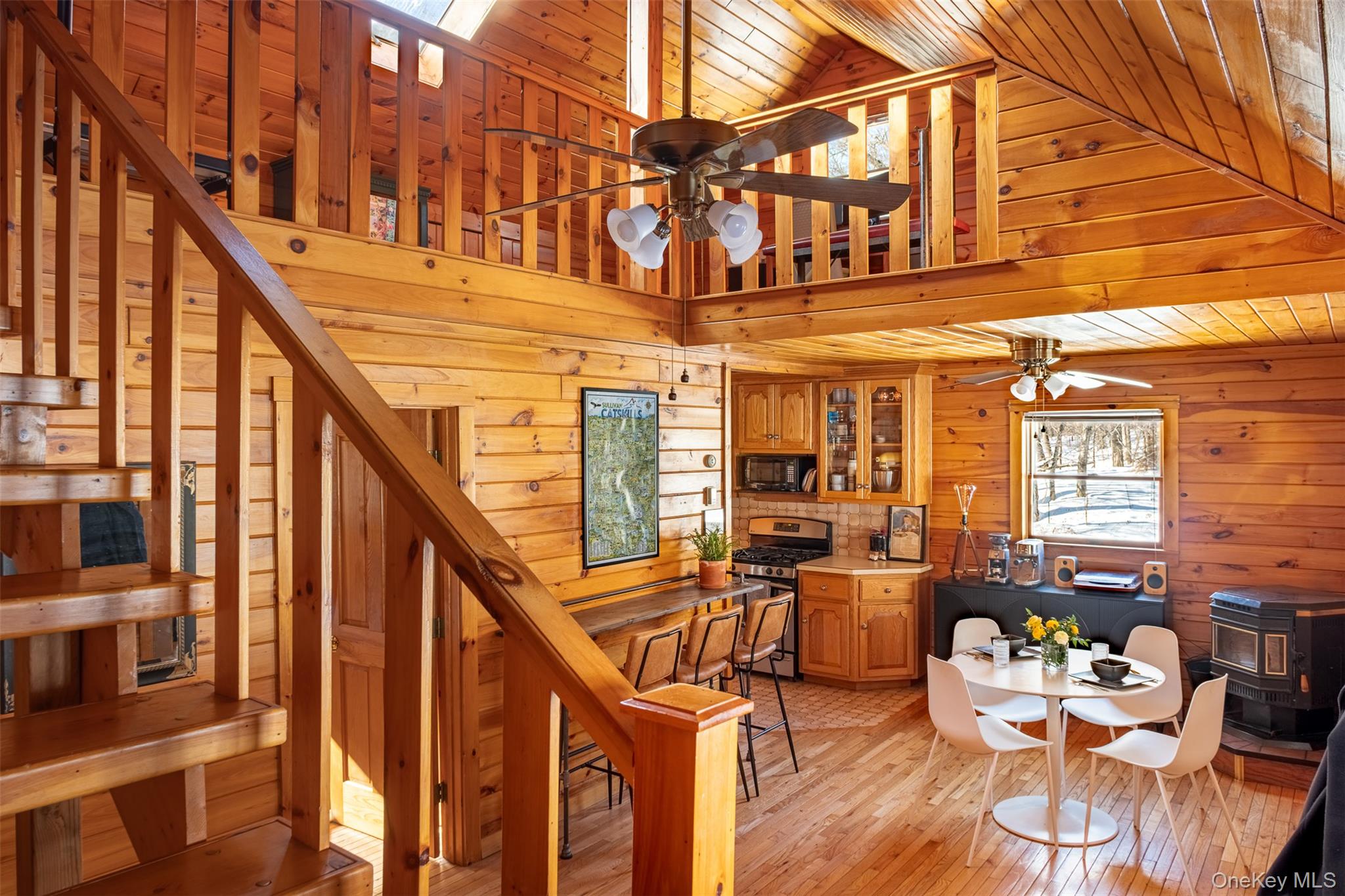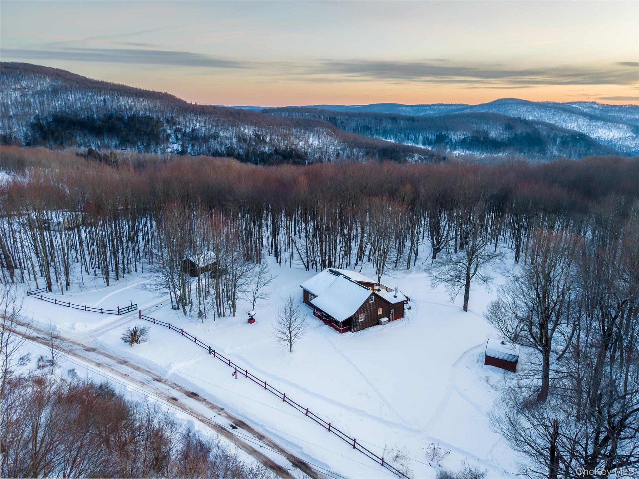 Perched high on a mountaintop and surrounded by a maturing forest, this inviting Catskills retreat offers privacy, warmth, and authentic upstate charm. A spacious front porch welcomes slow mornings and long evenings, setting the tone for relaxed upstate living. Inside, vaulted ceilings and a nicely flowing layout create a sense of ease and openness, while two pellet stoves provide efficient, cozy comfort throughout the seasons. Natural light fills the living spaces, enhancing the home’s rustic character and making it feel equally suited for full-time living or a weekend escape. The king size primary bedroom enjoys southern light exposure and a private bath, while the second bedroom offers flexibility for guests, home gym or creative space. Overlooking the main living space, the skylit loft provides an ideal work-from-home area or reading retreat - quiet and bright - tucked above it all. The kitchen is efficiently designed with ample cabinetry and modern appliances, offering a practical and comfortable space. Outside, a generous deck and large, fenced yard adds versatility for pets or gardening and invites dining al fresco, stargazing, or soaking in the surrounding woodland. Just off the driveway, a large barn-style shed adds functional charm and is a versatile space for projects, storage, or hobbies. A whole-house generator adds peace of mind, complemented by practical updates including a newer roof and oil tank. Located just minutes from the heart of Roscoe - affectionately nicknamed Trout Town USA - this mountaintop home offers easy access to world renowned fly fishing, scenic forest trails and year-round recreation. Conveniently located just minutes from Livingston Manor, Callicoon and Liberty - just about two hours from the GWB.