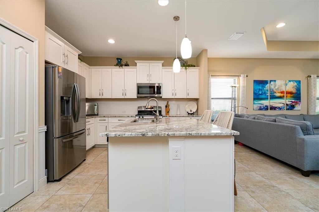 Come see Villa Palmeras and see this immaculate home with two bedrooms plus den and two baths with two car garage (door will be painted shortly). Tile flooring and new LVP flooring in den and bedrooms(23). Kitchen with white cabinets, new Moen faucet, pantry, new microwave(25) and Refrigerator with French doors (24). New granite counters and center island squared off with additional cabinet and drawer and sitting area (24). New thermostat(25). New picture window screening on lanai. NO more gutter cleaning as a Gutter Shield System has been installed (26). Storm Smart electric screen for hurricane protection 26). The guest bedroom has a Chest Murphy Bed which is queen size with 6” memory foam so you are ready for your first guests. Gas AOSmith water heater. NOW you know about some of the wonderful things about this home. Its great room is wonderful for entertaining .