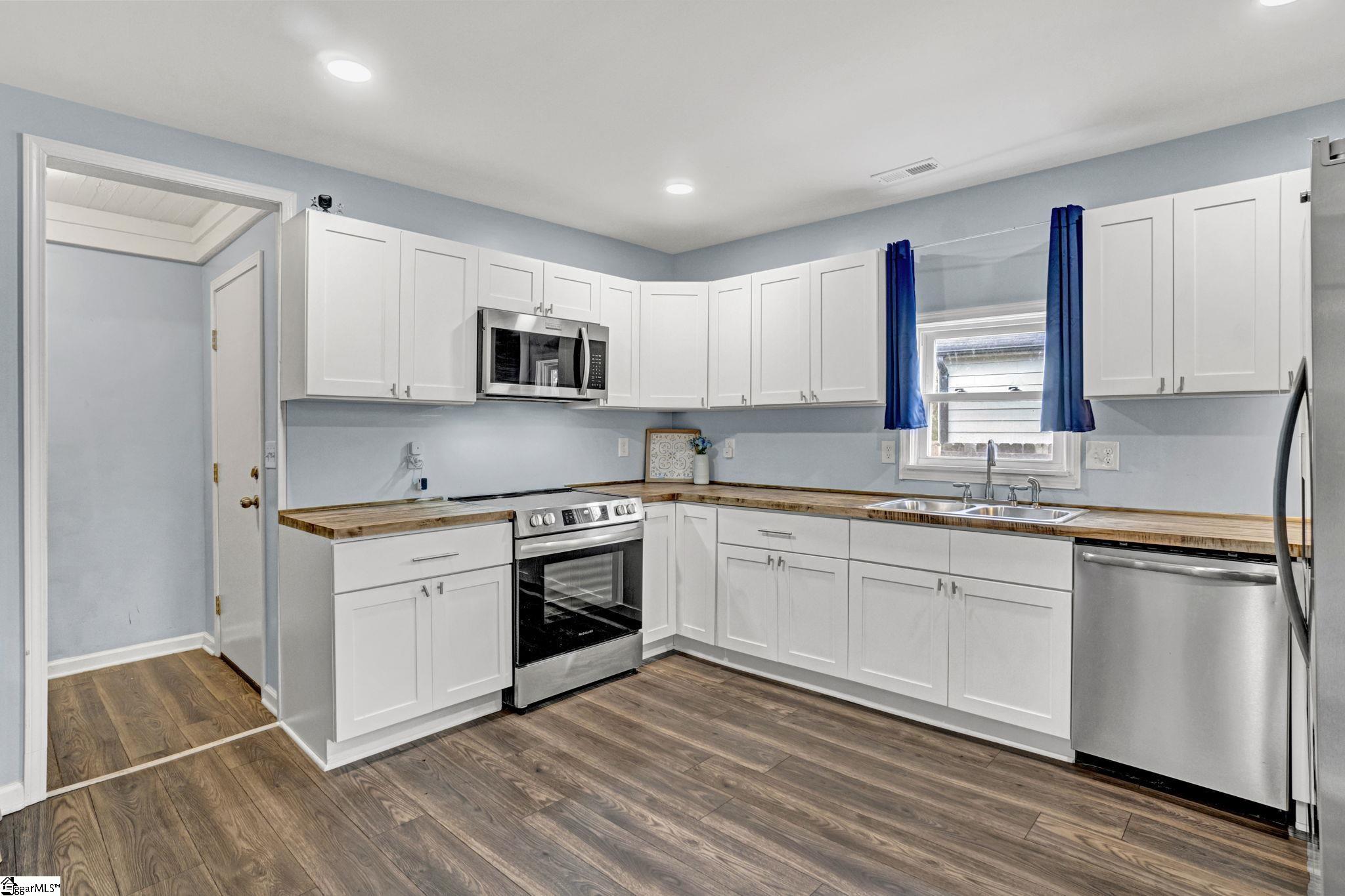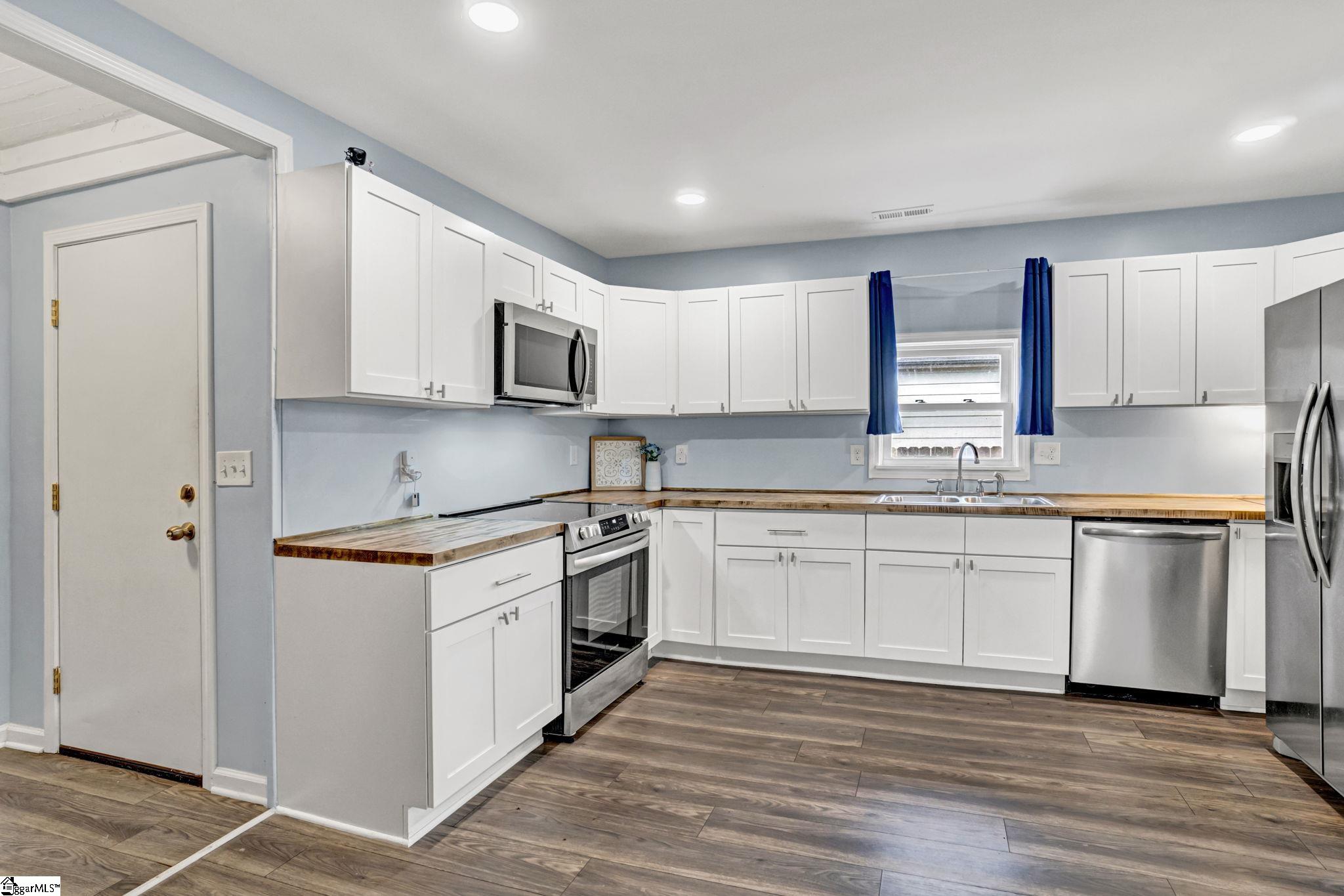 Welcome to this fully renovated 2-bedroom, 2-bath home offering 890 sq ft of thoughtfully designed living space. This ideal roommate floor plan features two generously sized bedrooms, each with its own private en-suite bathroom with tub/shower combination. The kitchen has been beautifully refreshed with stainless steel appliances, butcher block countertops, plenty of cabinet space, and a cozy eat-in dining area. The open living space feels bright and welcoming, finished in modern neutral tones that make it easy to move right in and make it your own. Washer, dryer, and refrigerator are included, making this home truly move-in ready. Enjoy abundant storage throughout and large rooms that feel both comfortable and functional. Brand new 2 ton mini split unit with ventilation throughout the house. Ideally located just minutes from Anderson University and close to restaurants, shopping, and entertainment, with easy access to I-85 and a short drive to Easley, Clemson, or Anderson. Whether you're a first-time buyer, downsizing, or looking for a strong rental opportunity near the university, this property delivers value and versatility. Call today to schedule your showing! Preferred Lender offers assistance towards closing!