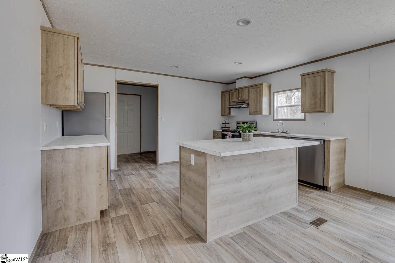 Welcome to this brand-new, never-lived-in 3 bedroom, 2 bath home, offering 1440 sq ft of modern comfort. This spotless property features an open and functional layout with bright natural light throughout. The kitchen, living, and dining areas flow seamlessly, creating an inviting space for everyday living. The kitchen includes stainless steel appliances. The primary suite includes a generous full bath including a separate shower and large tub, while the additional rooms offer flexible options for guests, work, or storage. The incredible wrap around deck will be the perfect spot for your morning coffee or spending evenings with family and friends. Surrounded by trees, you can enjoy privacy and a beautiful view from the deck. This property also incudes an outbuilding for storage! Minutes from downtown Easley, the Silos and Southern Weaving. With everything fresh and untouched, and close to restaurants and shopping, this home provides the rare opportunity to move into a truly new space without the wait of new construction. A clean, simple, and move-in-ready home -- perfect for starting fresh. This home includes a full one year manufacturers warranty! Home is USDA eligible and FHA approved. NO HOA!