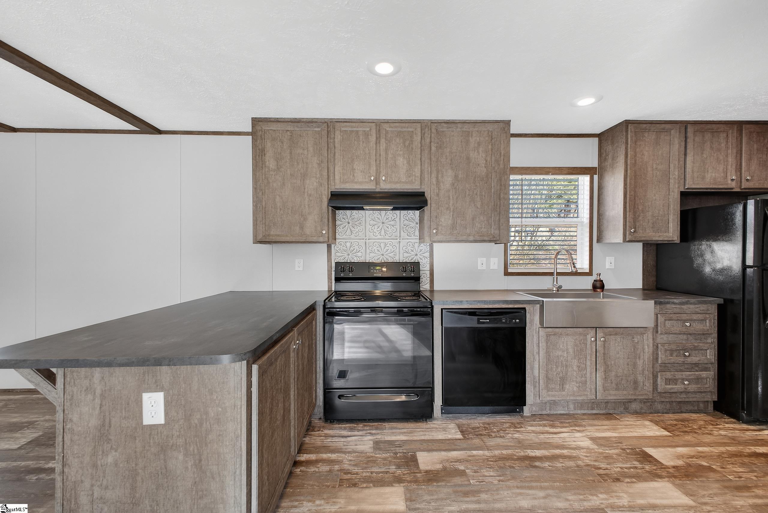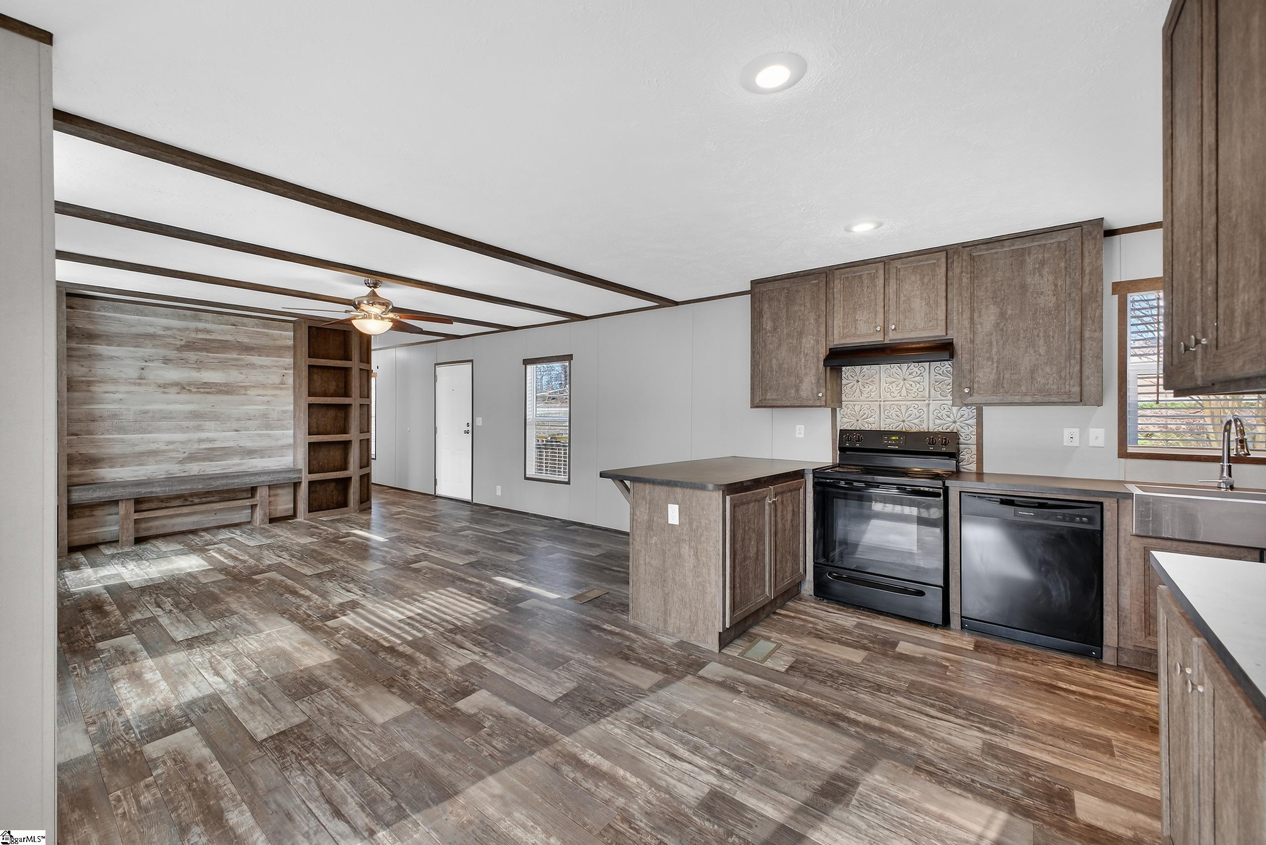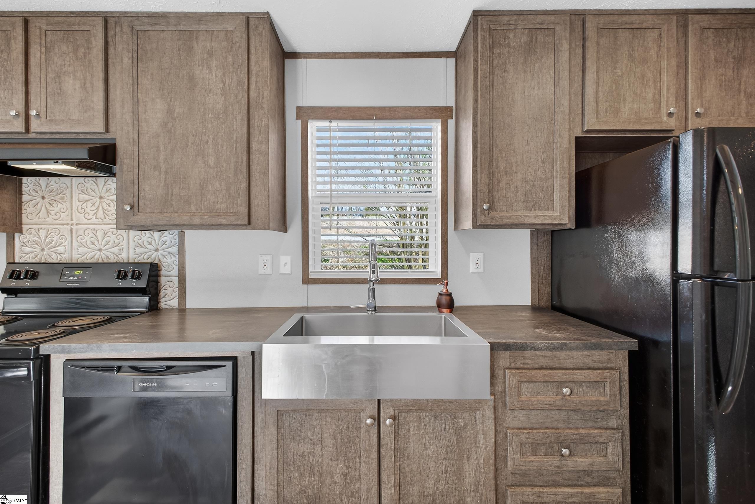 Modern finishes, built-in bookcases, and a private wooded setting along Georges Creek — with no HOA — set this 2021 Clayton “Anniversary 76” (16x76) home apart from the ordinary. Situated on 0. 51 acres, this 3-bedroom, 2 full bath home offers an open-concept layout with neutral cool tones and durable wood-look flooring throughout. The spacious living area features decorative ceiling beams and custom built-in shelving, creating both character and functional storage. The kitchen is designed for everyday living with abundant cabinetry, electric range with vent hood, stainless apron-front sink, and a large island overlooking the main living space. Natural light enhances the home’s modern yet comfortable feel. The primary suite is privately positioned on one side of the home and includes a dual vanity, soaking garden tub, separate shower, and walk-in closet. Two additional bedrooms and a full bath are located on the opposite side for added privacy. A walk-in laundry room with washer and dryer provides added convenience. Enjoy both front and back decks overlooking the wooded, sloping lot with seasonal views of Georges Creek. A separate storage building conveys with the property. Custom LeafFilter gutters installed to help direct water flow from the house and prevent seasonal leaf buildup. Also comes with a transferable warranty. Conveniently located just 5 minutes to Hwy 123, 10 minutes to Hwy 153, and approximately 20 minutes to Downtown Greenville, this property offers accessibility while maintaining a peaceful, tucked-away setting — all without restrictive HOA rules. Ideal for homeowners seeking affordable modern living or investors looking for a strong rental opportunity.