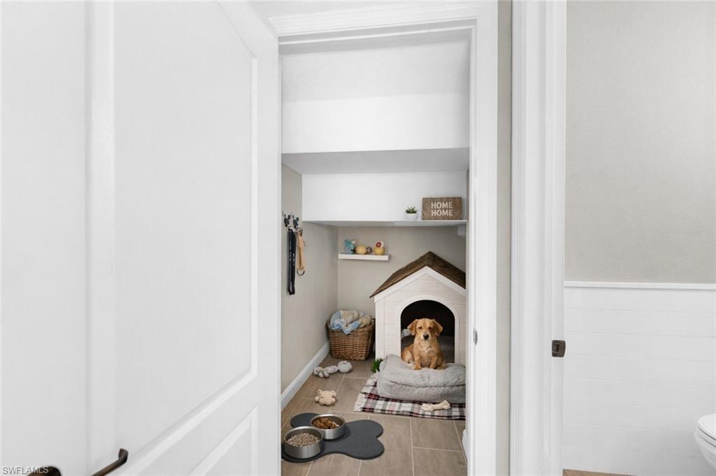 The FIRST-FLOOR EN SUITE BEDROOM gives you true flexibility — guest space, HOME OFFICE, or multi-purpose room — with direct lanai access so it can double as a pool bath. You’ll also find a LARGE STORAGE CLOSET UNDER THE STAIRS and a centrally located DEDICATED LAUNDRY ROOM with WASHER AND DRYER plus adjacent storage.