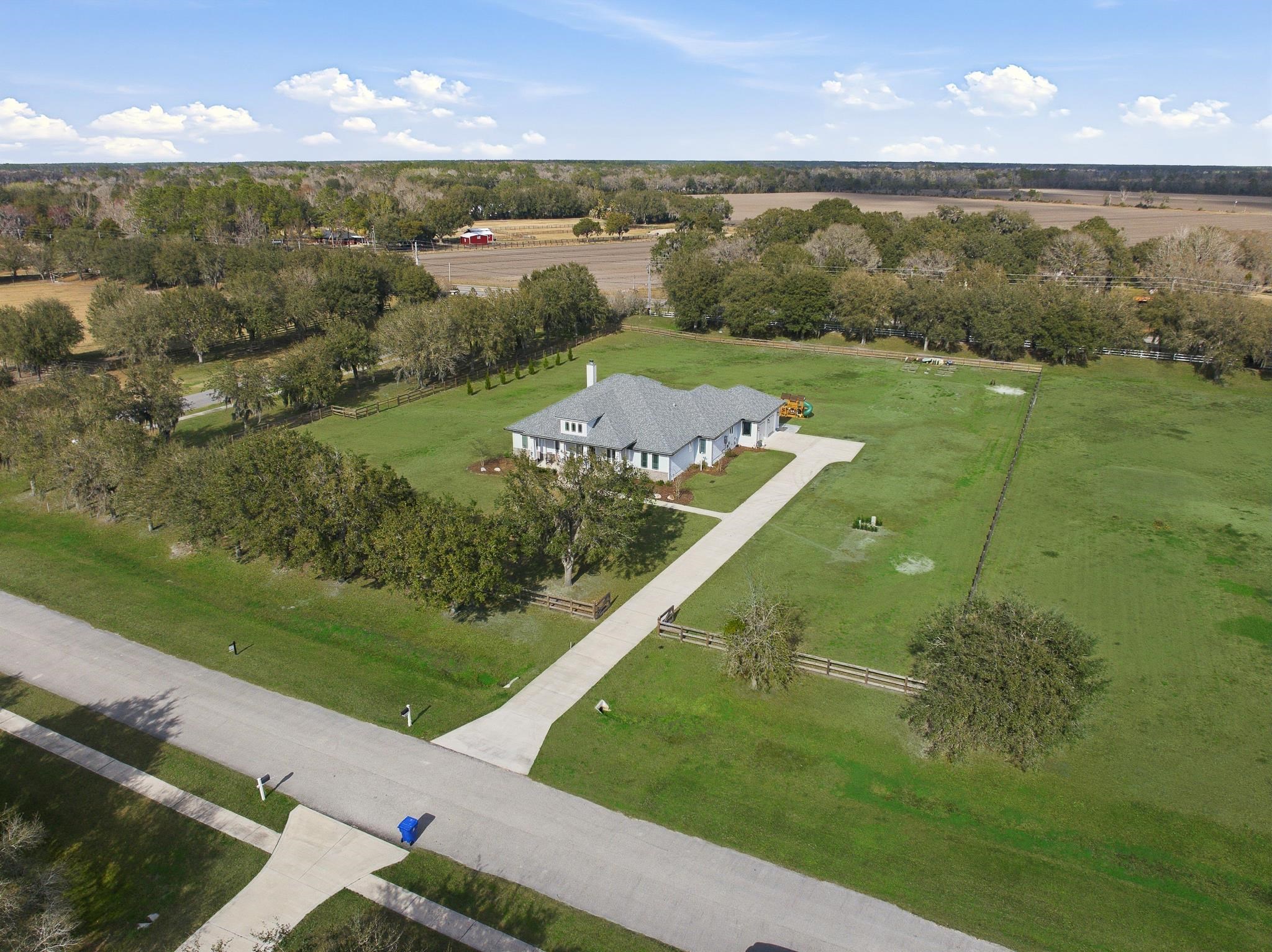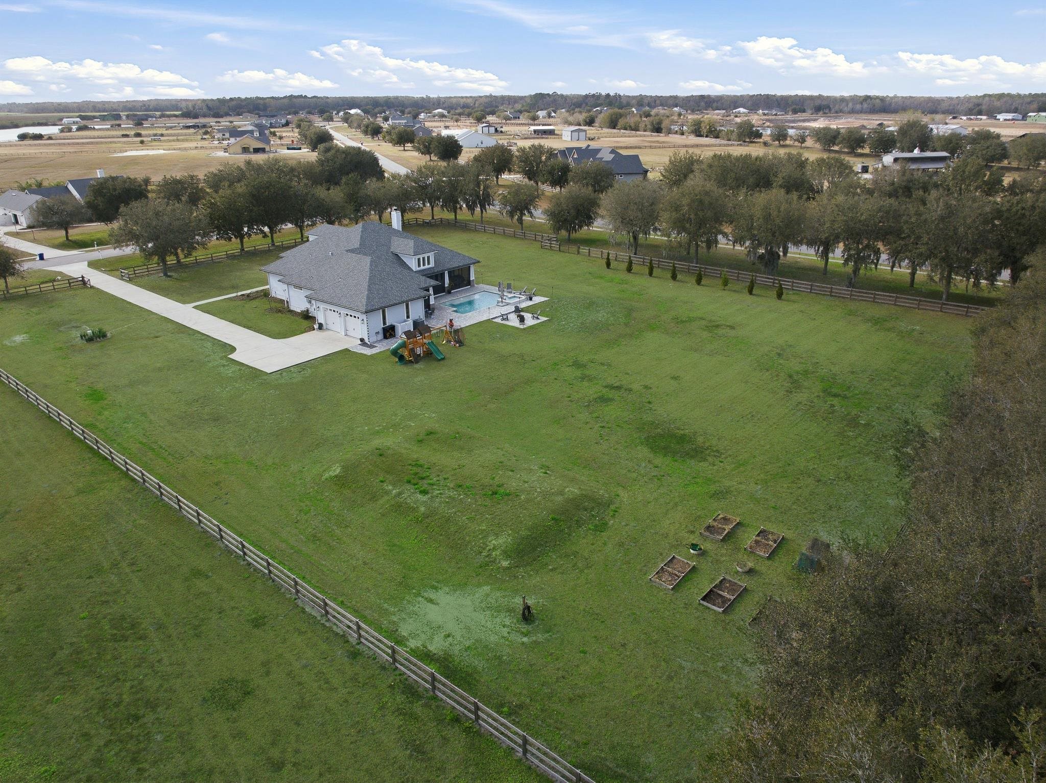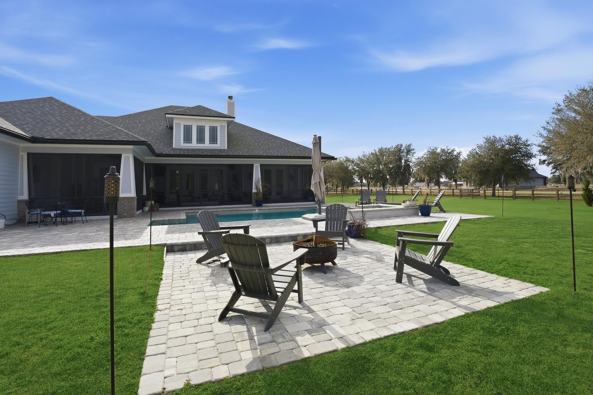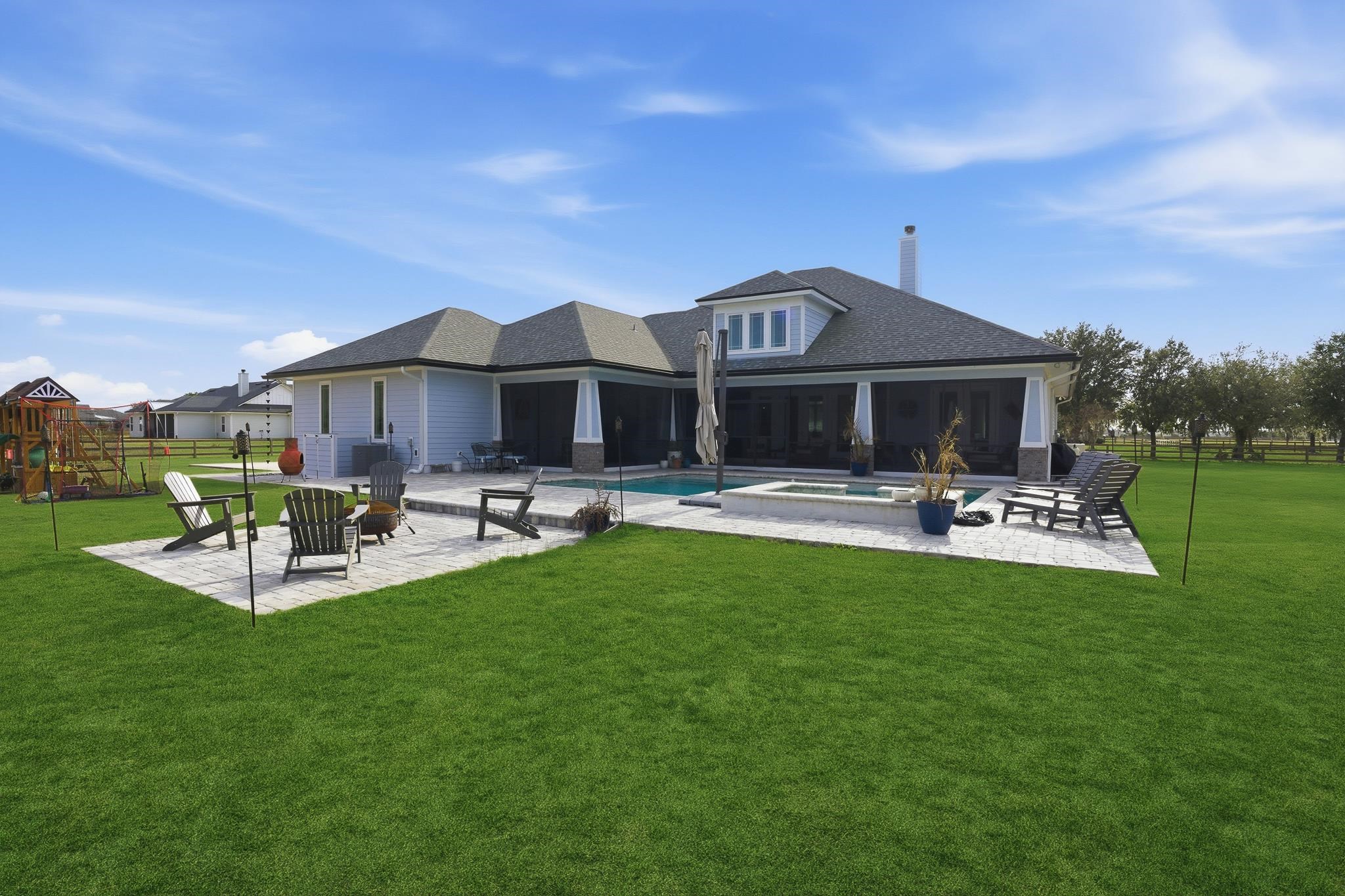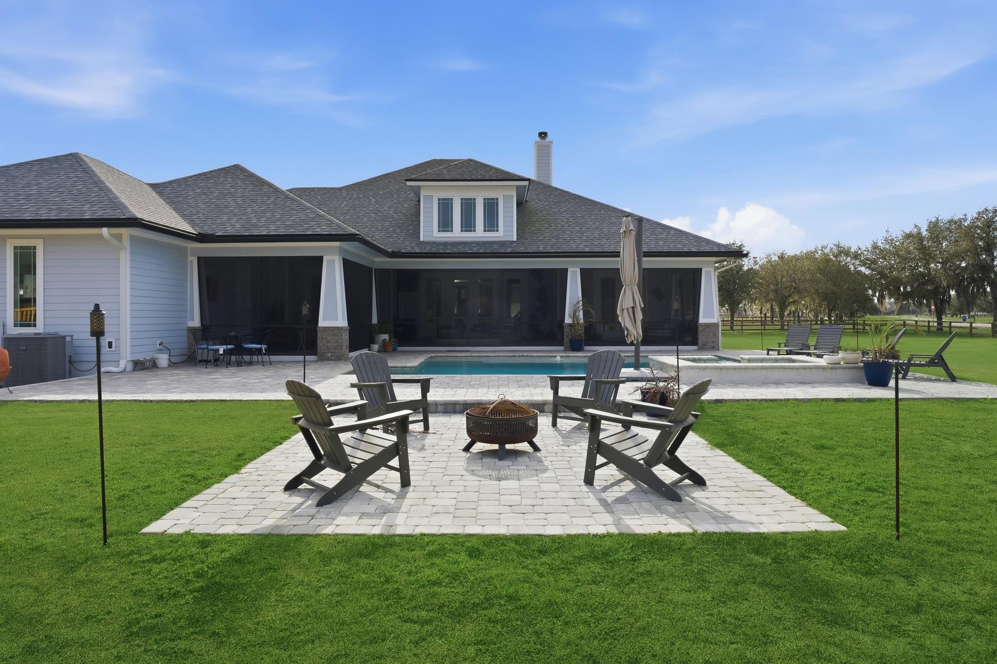 Experience refined country living in this luxury custom-built Modern Farmhouse with timeless Craftsman influences, gracefully positioned on just under three private acres in Bartram Farms. Designed with both elegance and comfort in mind, the residence showcases soaring ceilings, upgraded designer wood trim, custom cabinetry and premium luxury vinyl plank flooring throughout. At the heart of the home, the gourmet chef’s kitchen impresses with LG Studio high-end appliances, an expansive island with seating, an oversized single-basin sink, Quartz countertops, subway tile backsplash and a sunlit breakfast area complemented by bar seating, ideal for casual gatherings or morning coffee. Natural light pours into the open living spaces, accentuating the striking fireplace, offering both wood-burning and gas functionality, and creating a warm yet sophisticated focal point. A private flex space with double doors off the main living area is perfectly suited for a luxury home office, studio or library, while the formal dining room off the foyer sets the stage for elevated entertaining. The thoughtfully designed split floorplan ensures privacy, with two secondary bedrooms and baths set apart from the primary suite. The primary retreat offers direct lanai access, dual walk-in closets, double vanities and a beautifully tiled walk-in shower. Outdoors, the estate transforms into a resort-style sanctuary. The expansive screened lanai overlooks a stunning pavered patio featuring a sparkling pool, hot tub and fire pit lounge, crafted for unforgettable evenings and effortless entertaining. A separate dining area inside the lanai and gas line for a future outdoor kitchen is perfect for outdoor entertaining. Additional highlights include a fully wood-fenced perimeter with mechanical gate, a 2-car garage with high ceilings and extra storage and an oversized laundry suite with sink, custom cabinetry, abundant storage and natural light. Energy-efficient enhancements such as spray foam insulation and LED lighting complete this exceptional offering, where luxury, privacy and modern farmhouse charm meet in perfect balance. Bartram Farms is a dedicated equestrian community offering six miles of scenic riding trails. Barns, horses, and other livestock—including cows, goats, and chickens—are welcome. The area is also supported by several nearby farms and stables, providing added potential for expanded boarding and riding opportunities. Experience the space and seclusion of country living while still being only 20–30 minutes from the beaches, restaurants, and vibrant lifestyle of St. Augustine. If wide-open land and a quieter pace are what you’ve been missing, this is where you’ll find it.