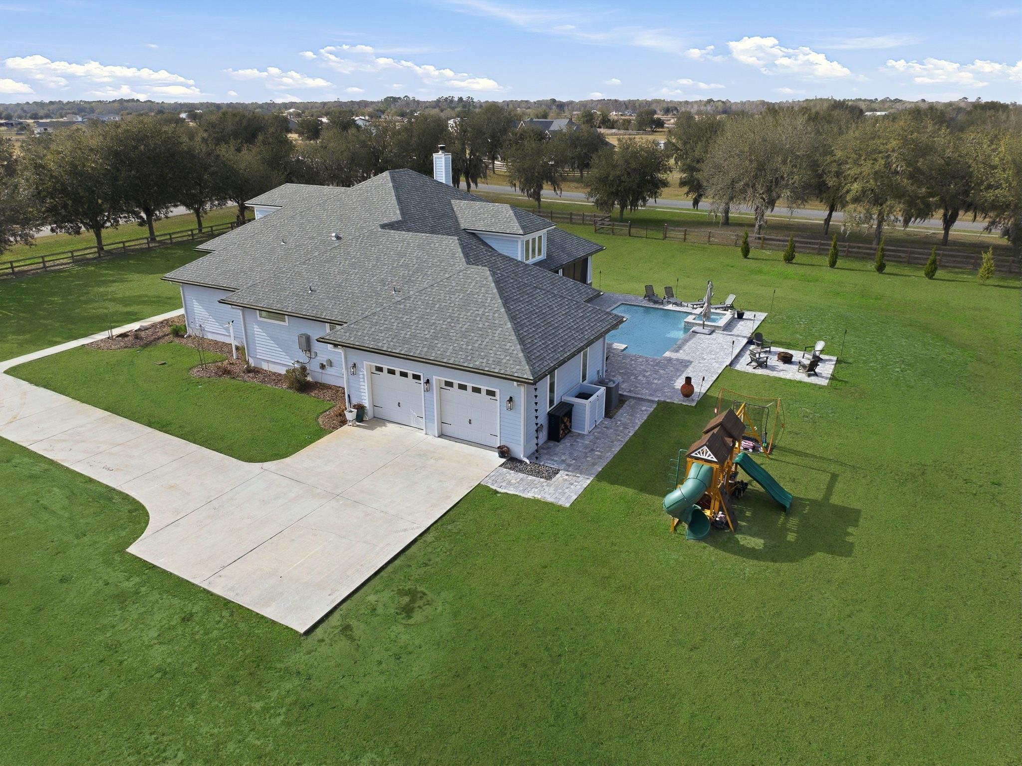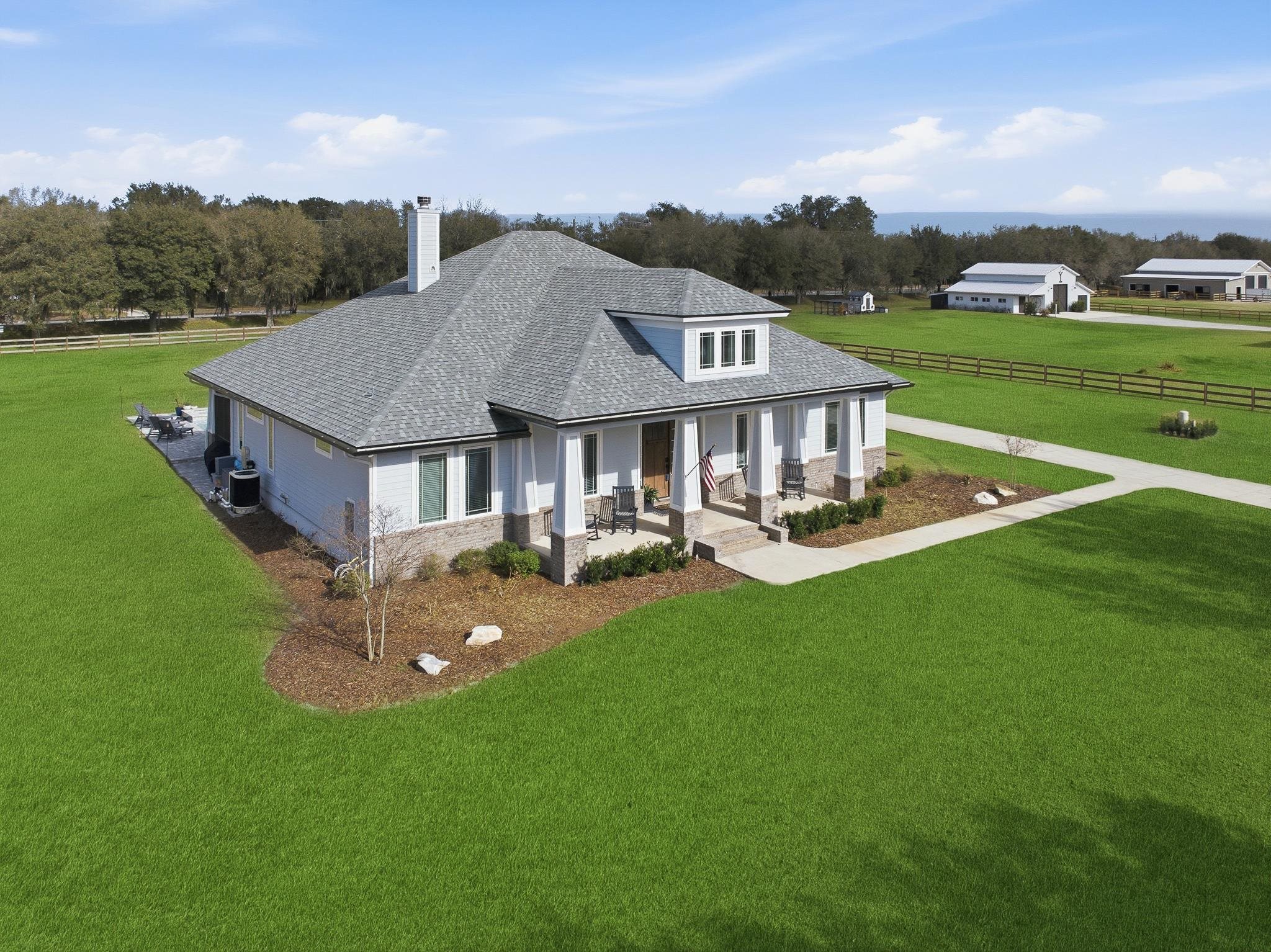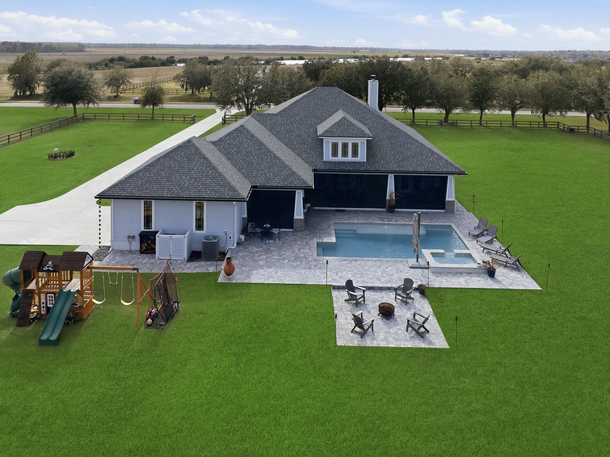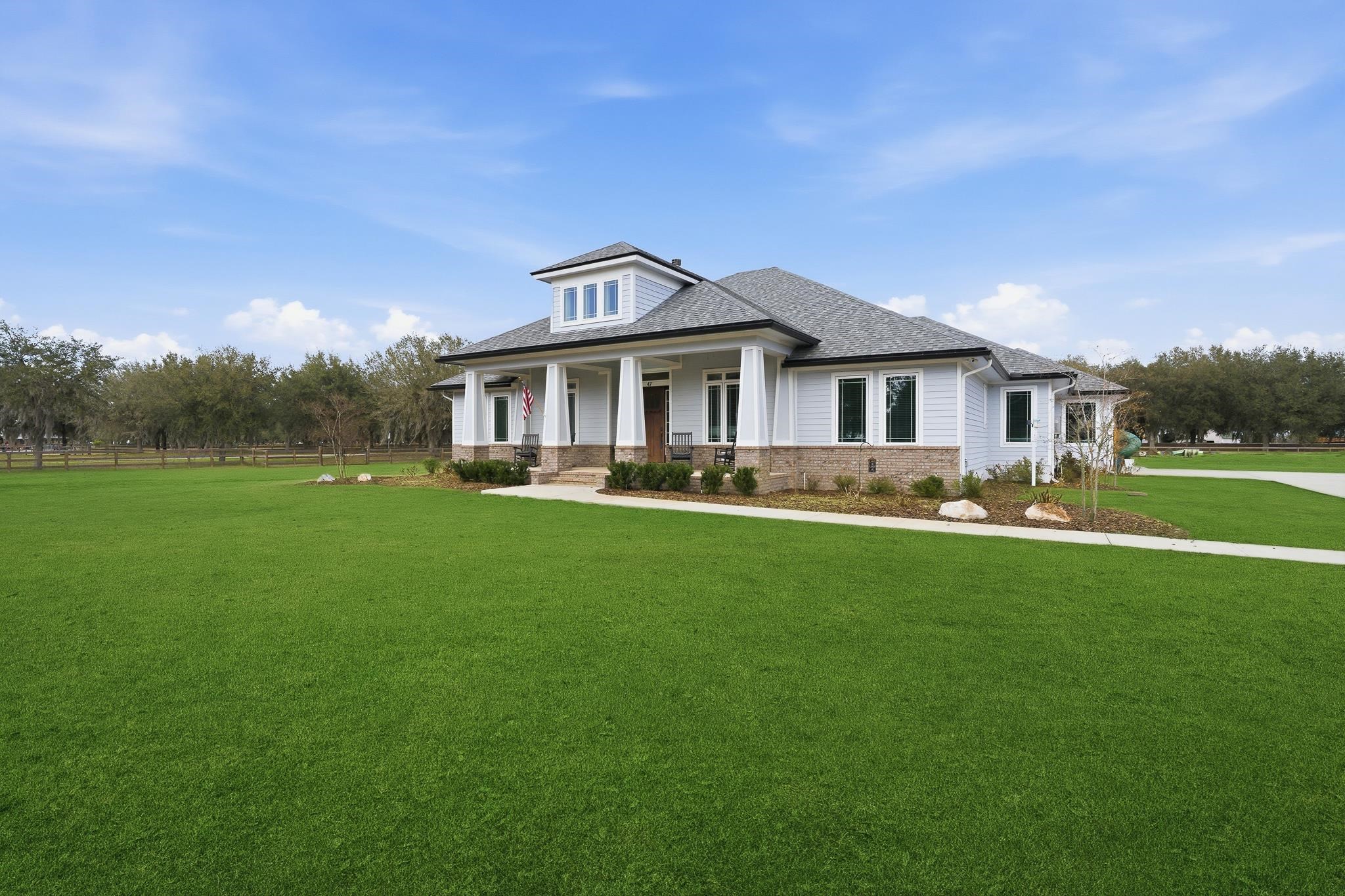 Experience refined country living in this luxury custom-built Modern Farmhouse with timeless Craftsman influences, gracefully positioned on just under three private acres in Bartram Farms. Designed with both elegance and comfort in mind, the residence showcases soaring ceilings, upgraded designer wood trim, custom cabinetry and premium luxury vinyl plank flooring throughout. At the heart of the home, the gourmet chef’s kitchen impresses with LG Studio high-end appliances, an expansive island with seating, an oversized single-basin sink, Quartz countertops, subway tile backsplash and a sunlit breakfast area complemented by bar seating, ideal for casual gatherings or morning coffee. Natural light pours into the open living spaces, accentuating the striking fireplace, offering both wood-burning and gas functionality, and creating a warm yet sophisticated focal point. A private flex space with double doors off the main living area is perfectly suited for a luxury home office, studio or library, while the formal dining room off the foyer sets the stage for elevated entertaining. The thoughtfully designed split floorplan ensures privacy, with two secondary bedrooms and baths set apart from the primary suite. The primary retreat offers direct lanai access, dual walk-in closets, double vanities and a beautifully tiled walk-in shower. Outdoors, the estate transforms into a resort-style sanctuary. The expansive screened lanai overlooks a stunning pavered patio featuring a sparkling pool, hot tub and fire pit lounge, crafted for unforgettable evenings and effortless entertaining. A separate dining area inside the lanai and gas line for a future outdoor kitchen is perfect for outdoor entertaining. Additional highlights include a fully wood-fenced perimeter with mechanical gate, a 2-car garage with high ceilings and extra storage and an oversized laundry suite with sink, custom cabinetry, abundant storage and natural light. Energy-efficient enhancements such as spray foam insulation and LED lighting complete this exceptional offering, where luxury, privacy and modern farmhouse charm meet in perfect balance. Bartram Farms is a dedicated equestrian community offering six miles of scenic riding trails. Barns, horses, and other livestock—including cows, goats, and chickens—are welcome. The area is also supported by several nearby farms and stables, providing added potential for expanded boarding and riding opportunities. Experience the space and seclusion of country living while still being only 20–30 minutes from the beaches, restaurants, and vibrant lifestyle of St. Augustine. If wide-open land and a quieter pace are what you’ve been missing, this is where you’ll find it.