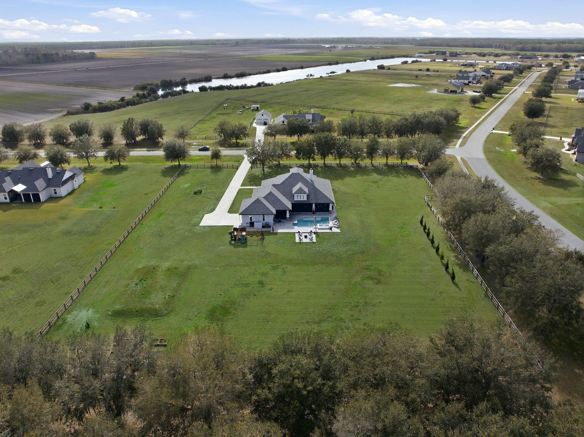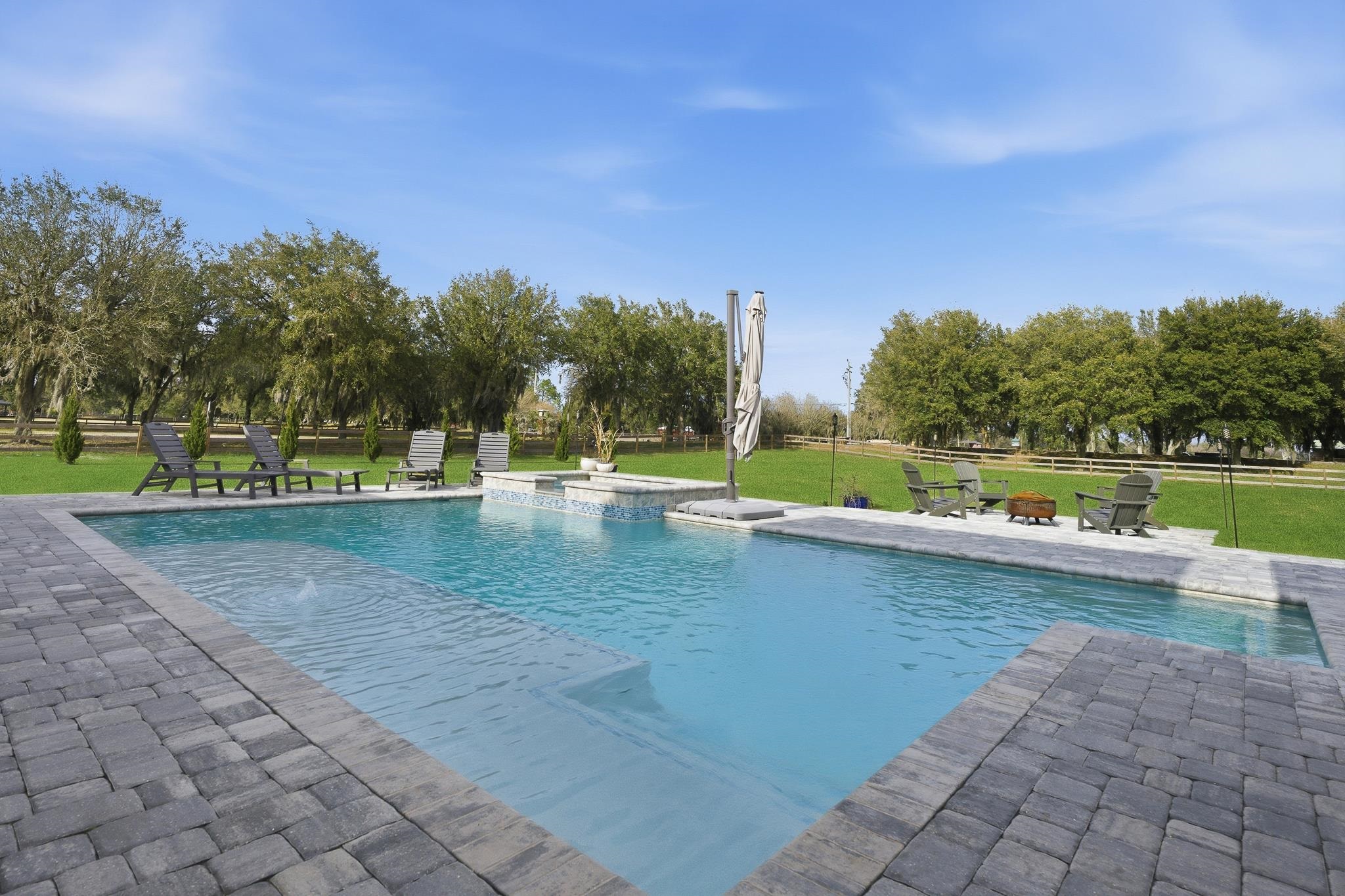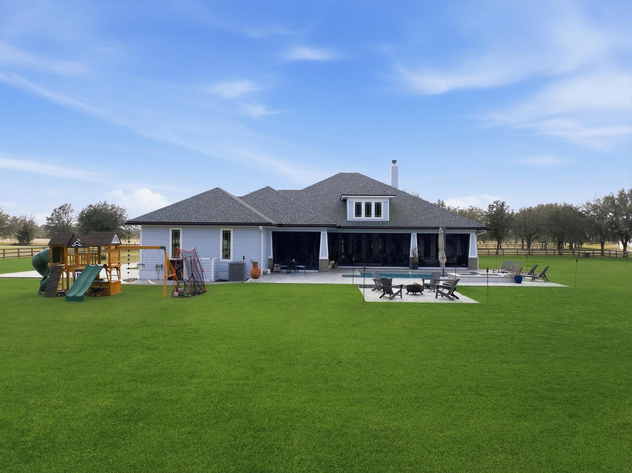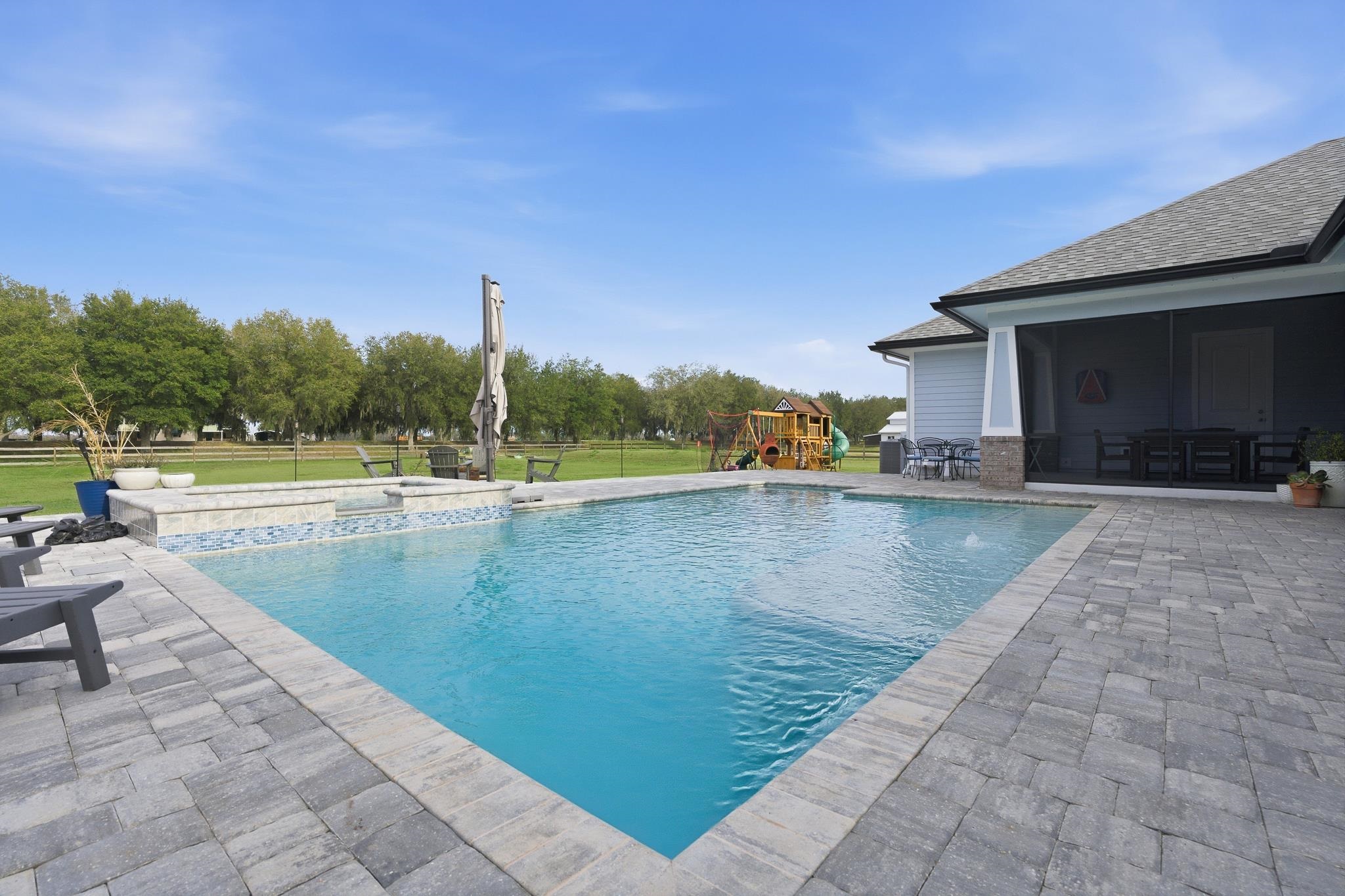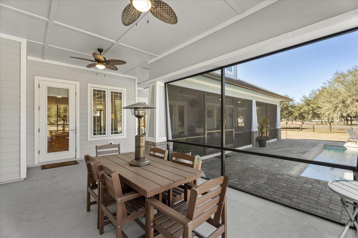 Experience refined country living in this luxury custom-built Modern Farmhouse with timeless Craftsman influences, gracefully positioned on just under three private acres in Bartram Farms. Designed with both elegance and comfort in mind, the residence showcases soaring ceilings, upgraded designer wood trim, custom cabinetry and premium luxury vinyl plank flooring throughout. At the heart of the home, the gourmet chef’s kitchen impresses with LG Studio high-end appliances, an expansive island with seating, an oversized single-basin sink, Quartz countertops, subway tile backsplash and a sunlit breakfast area complemented by bar seating, ideal for casual gatherings or morning coffee. Natural light pours into the open living spaces, accentuating the striking fireplace, offering both wood-burning and gas functionality, and creating a warm yet sophisticated focal point. A private flex space with double doors off the main living area is perfectly suited for a luxury home office, studio or library, while the formal dining room off the foyer sets the stage for elevated entertaining. The thoughtfully designed split floorplan ensures privacy, with two secondary bedrooms and baths set apart from the primary suite. The primary retreat offers direct lanai access, dual walk-in closets, double vanities and a beautifully tiled walk-in shower. Outdoors, the estate transforms into a resort-style sanctuary. The expansive screened lanai overlooks a stunning pavered patio featuring a sparkling pool, hot tub and fire pit lounge, crafted for unforgettable evenings and effortless entertaining. A separate dining area inside the lanai and gas line for a future outdoor kitchen is perfect for outdoor entertaining. Additional highlights include a fully wood-fenced perimeter with mechanical gate, a 2-car garage with high ceilings and extra storage and an oversized laundry suite with sink, custom cabinetry, abundant storage and natural light. Energy-efficient enhancements such as spray foam insulation and LED lighting complete this exceptional offering, where luxury, privacy and modern farmhouse charm meet in perfect balance. Bartram Farms is a dedicated equestrian community offering six miles of scenic riding trails. Barns, horses, and other livestock—including cows, goats, and chickens—are welcome. The area is also supported by several nearby farms and stables, providing added potential for expanded boarding and riding opportunities. Experience the space and seclusion of country living while still being only 20–30 minutes from the beaches, restaurants, and vibrant lifestyle of St. Augustine. If wide-open land and a quieter pace are what you’ve been missing, this is where you’ll find it.