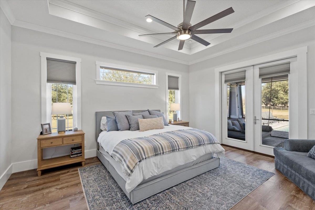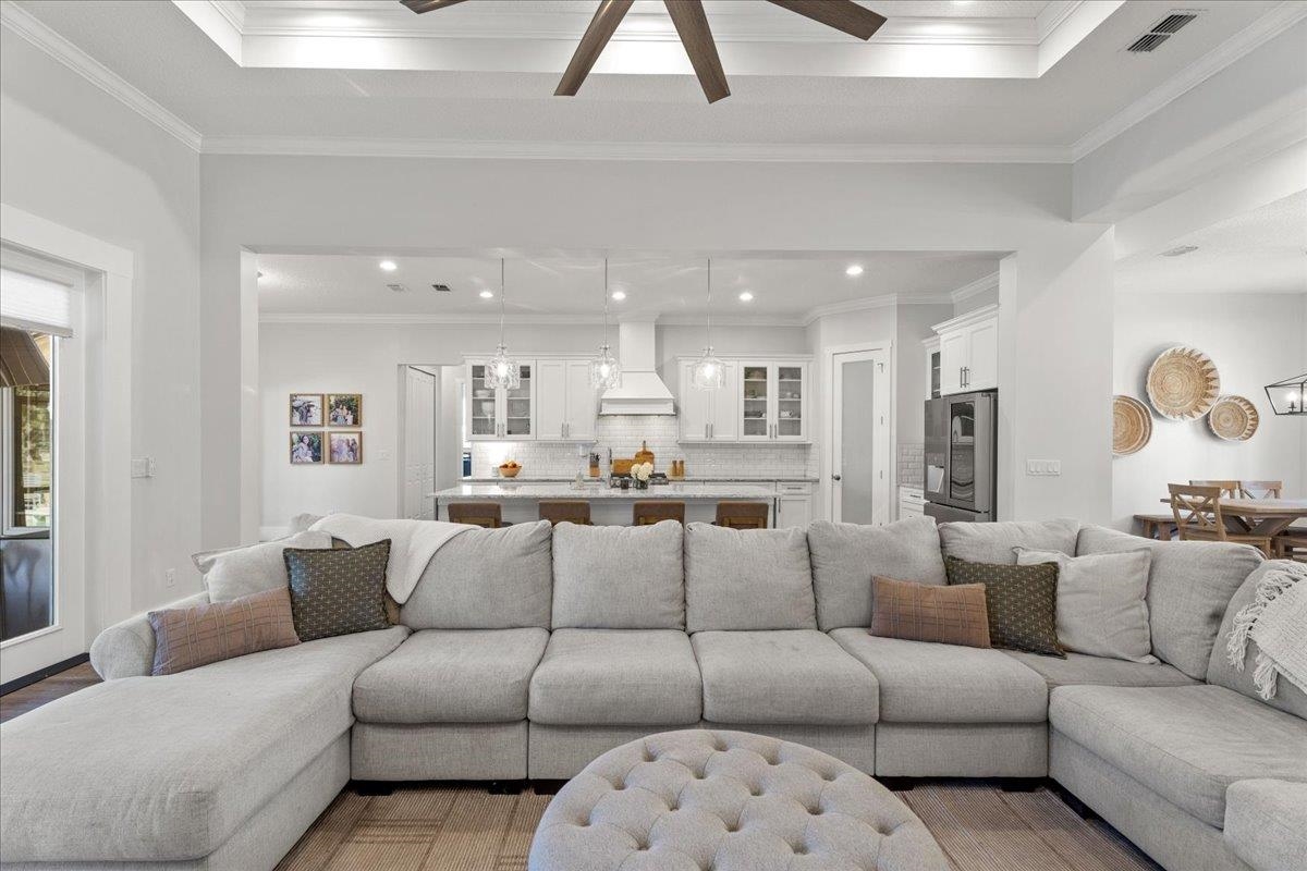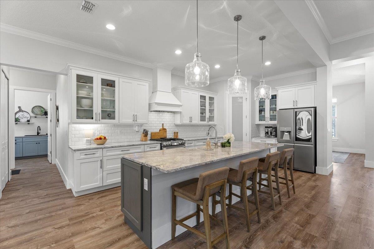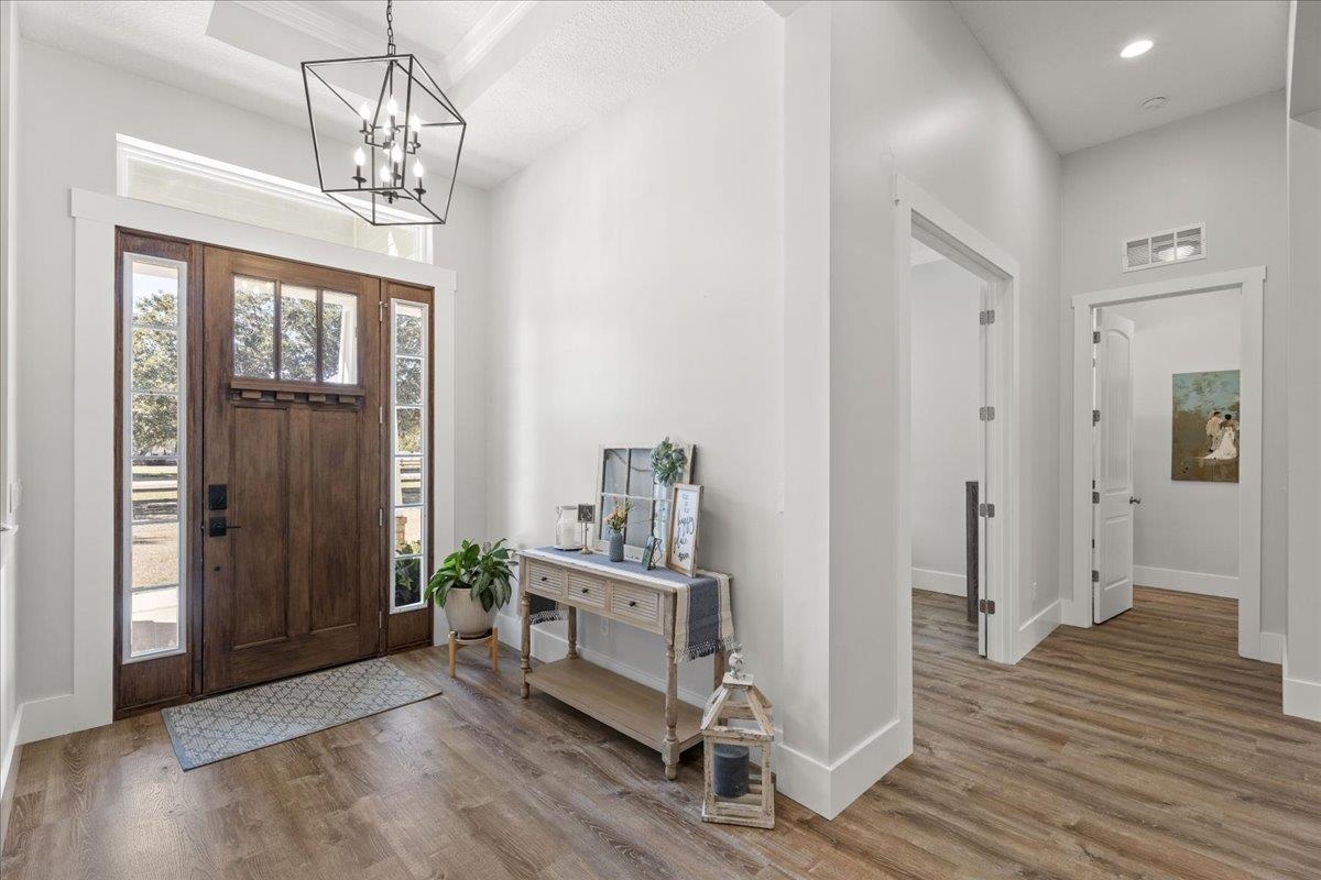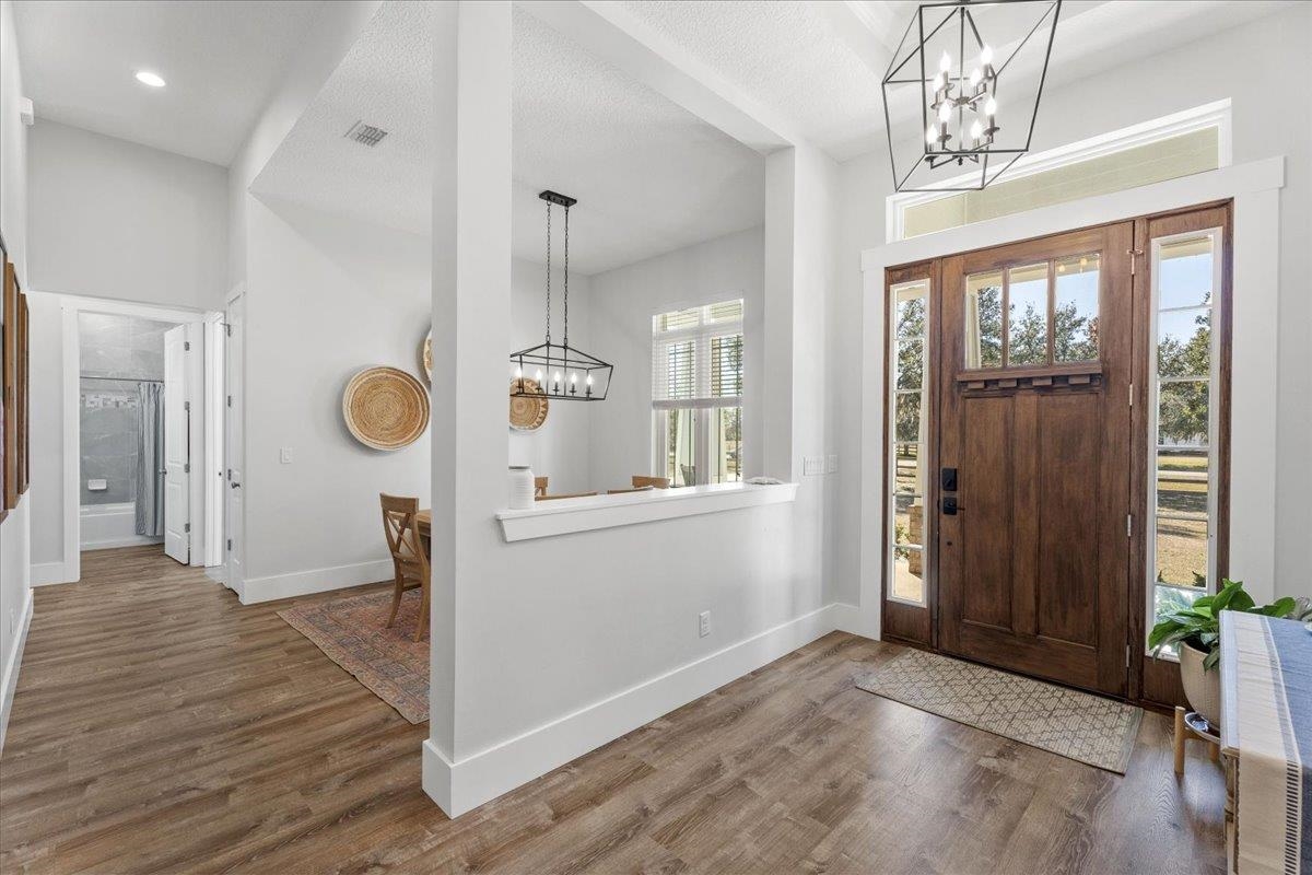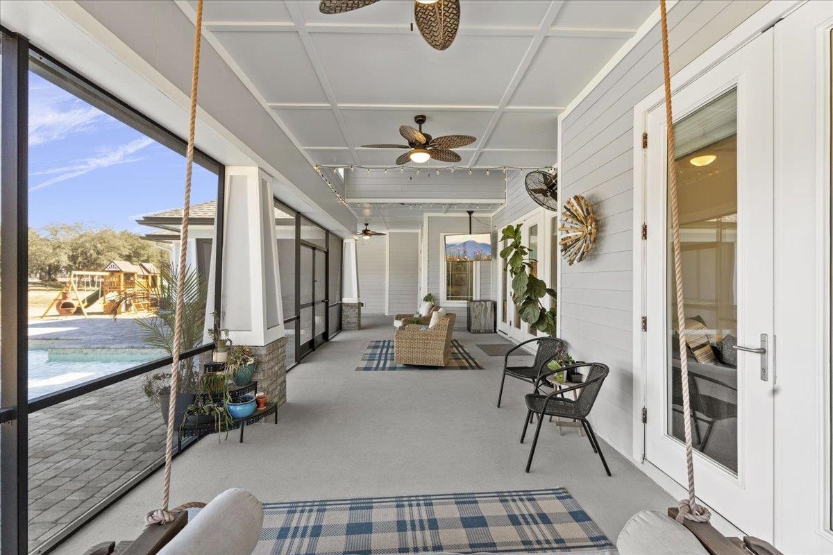 Experience refined country living in this luxury custom-built Modern Farmhouse with timeless Craftsman influences, gracefully positioned on just under three private acres in Bartram Farms. Designed with both elegance and comfort in mind, the residence showcases soaring ceilings, upgraded designer wood trim, custom cabinetry and premium luxury vinyl plank flooring throughout. At the heart of the home, the gourmet chef’s kitchen impresses with LG Studio high-end appliances, an expansive island with seating, an oversized single-basin sink, Quartz countertops, subway tile backsplash and a sunlit breakfast area complemented by bar seating, ideal for casual gatherings or morning coffee. Natural light pours into the open living spaces, accentuating the striking fireplace, offering both wood-burning and gas functionality, and creating a warm yet sophisticated focal point. A private flex space with double doors off the main living area is perfectly suited for a luxury home office, studio or library, while the formal dining room off the foyer sets the stage for elevated entertaining. The thoughtfully designed split floorplan ensures privacy, with two secondary bedrooms and baths set apart from the primary suite. The primary retreat offers direct lanai access, dual walk-in closets, double vanities and a beautifully tiled walk-in shower. Outdoors, the estate transforms into a resort-style sanctuary. The expansive screened lanai overlooks a stunning pavered patio featuring a sparkling pool, hot tub and fire pit lounge, crafted for unforgettable evenings and effortless entertaining. A separate dining area inside the lanai and gas line for a future outdoor kitchen is perfect for outdoor entertaining. Additional highlights include a fully wood-fenced perimeter with mechanical gate, a 2-car garage with high ceilings and extra storage and an oversized laundry suite with sink, custom cabinetry, abundant storage and natural light. Energy-efficient enhancements such as spray foam insulation and LED lighting complete this exceptional offering, where luxury, privacy and modern farmhouse charm meet in perfect balance. Bartram Farms is a dedicated equestrian community offering six miles of scenic riding trails. Barns, horses, and other livestock—including cows, goats, and chickens—are welcome. The area is also supported by several nearby farms and stables, providing added potential for expanded boarding and riding opportunities. Experience the space and seclusion of country living while still being only 20–30 minutes from the beaches, restaurants, and vibrant lifestyle of St. Augustine. If wide-open land and a quieter pace are what you’ve been missing, this is where you’ll find it.