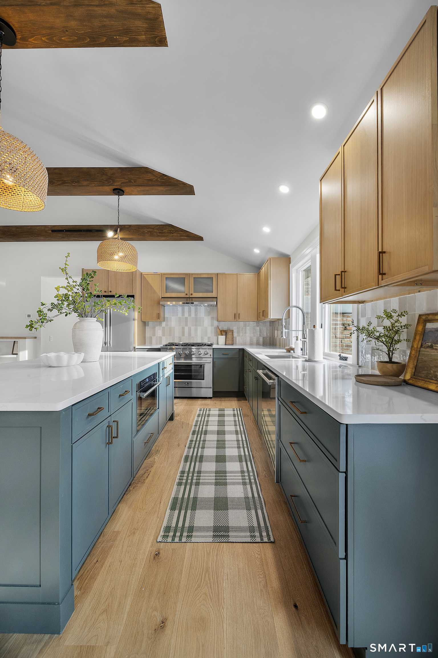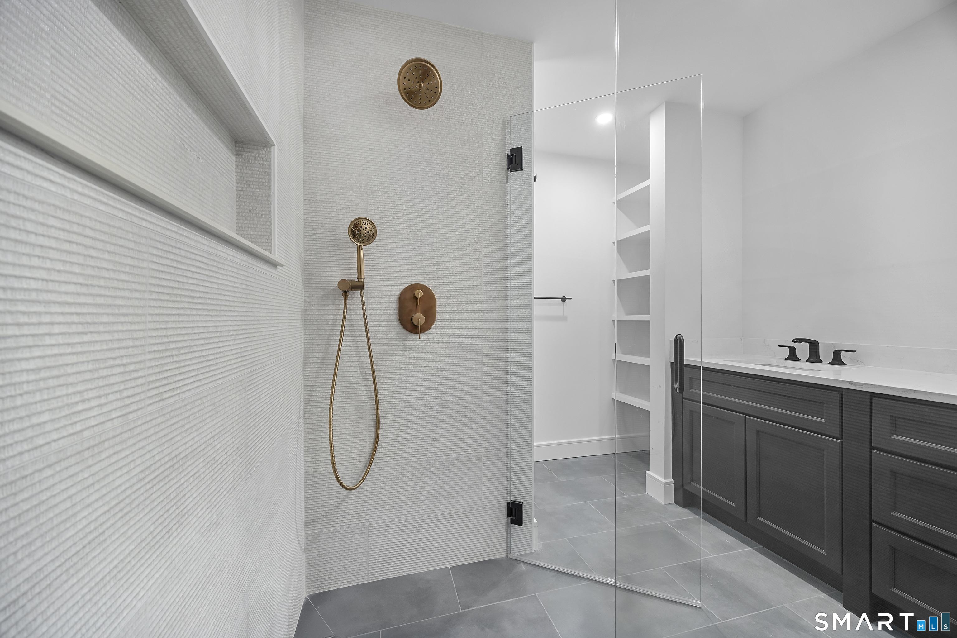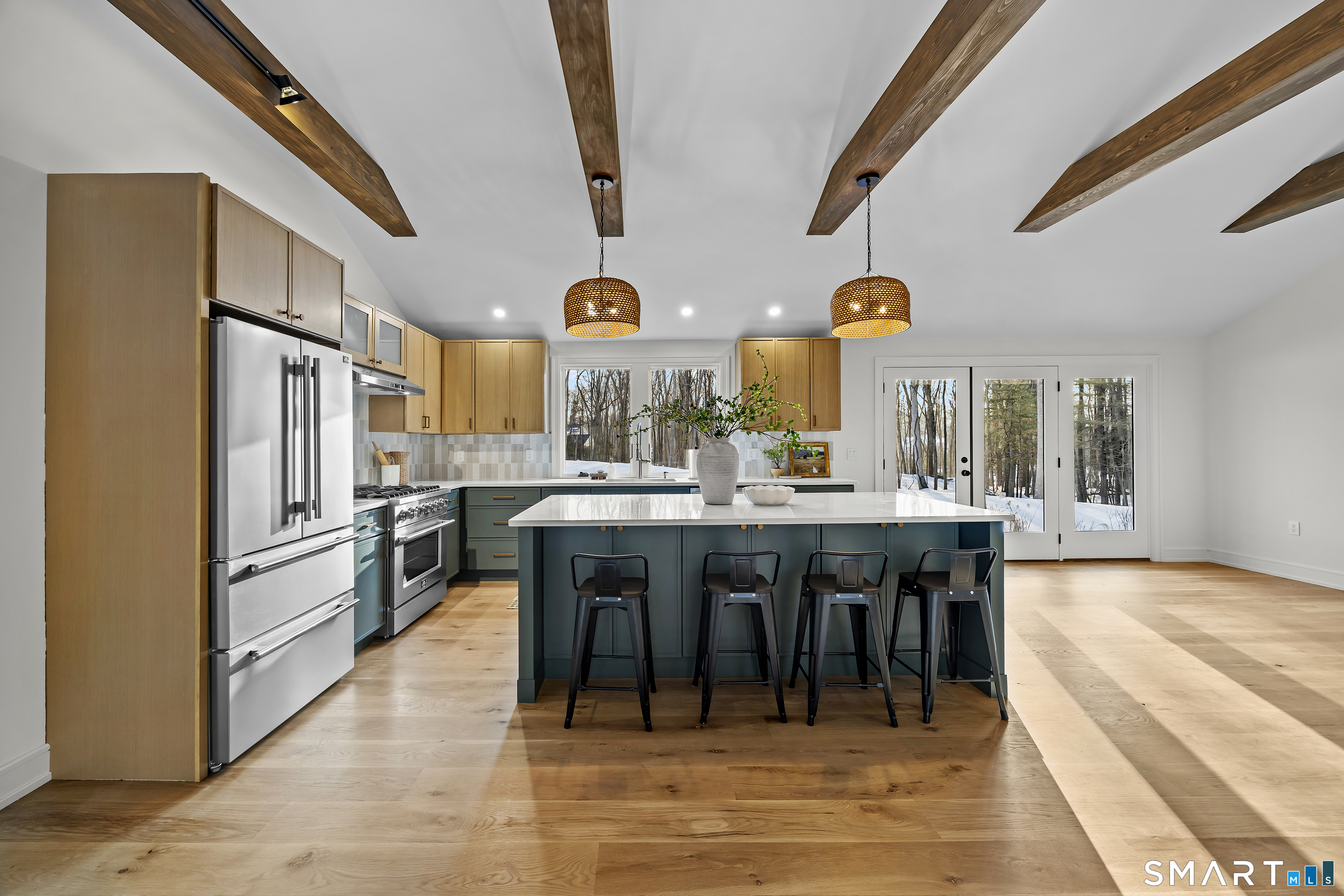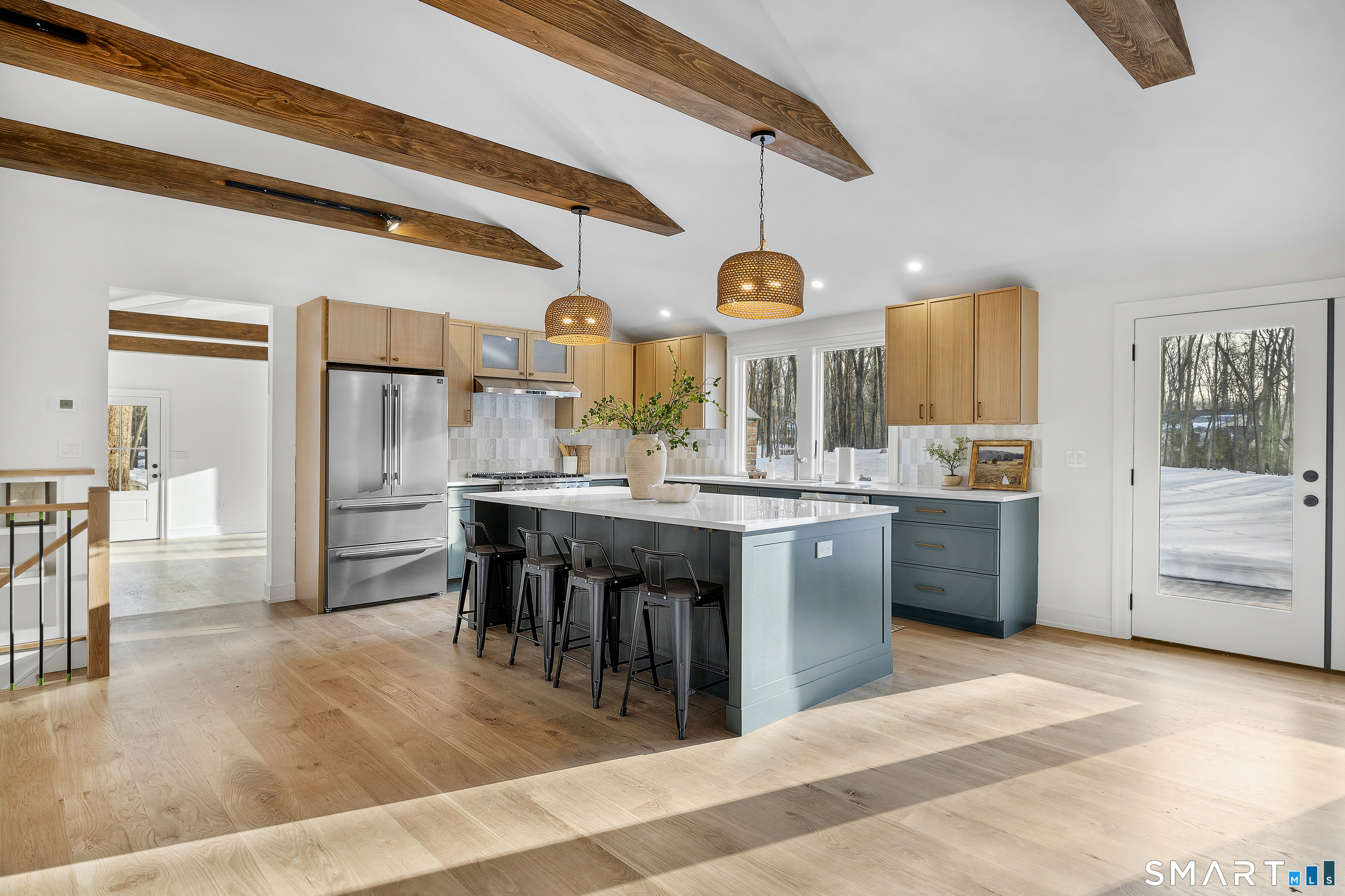 Completely reimagined from the studs up, this stunning home showcases uncompromising quality throughout. The exterior is finished w/ new Hardie Board siding, Pella windows, ODL doors, & a 30-yr architectural roof. All HVAC systems are new, incl dual natural gas furnaces & AC units, a LL ductless split system, on-demand tankless HW, & spray foam insulation across the above-grade living space for exceptional efficiency. Inside, wide-plank 8" white oak floors finished in Bona Natural set a refined tone. The custom kitchen is both striking & functional, featuring bespoke cabinetry w/ a dark green 8' island, natural uppers, quartz counters, & a premium Forno SS appliance suite incl a 36" gas range, French-door fridge/freezer, & microwave drawer. The main living area serves as the architectural centerpiece, highlighted by soaring ceilings & exposed pine beams. The primary suite offers vaulted ceilings, custom detailing, a walk-in closet w/ built-ins, & a spa-inspired bath w/ curbless glass shower, textured tile, & Moen fixtures. Two add'l BRs feature custom closets. A mudroom connects to a spacious laundry rm. The finished walk-out LL adds versatile living space & a full bath. Outdoor living shines w/ a herringbone brick patio, fireplace, & covered bluestone porch overlooking expansive grounds. This home delivers the comfort and efficiency of new construction paired with one-level living, a rare opportunity not to be missed.
