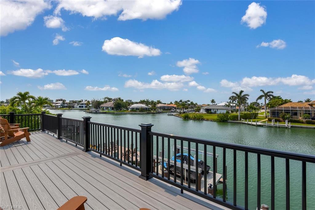 The open-concept kitchen, complete with a breakfast bar, overlooks the main living room and comes fully stocked with everything you need to prepare and serve meals. Upgraded with a water softener and a whole-home reverse osmosis water system, Mariana Court ensures top-tier water quality throughout. In the main living room, you'll find soaring double-height ceilings and a massive 72" flat-screen TV—perfect for cozy movie nights after sun-soaked days by the water. Step outside to the spacious lanai, where a waterfront heated pool awaits, complete with chaise lounges for sunbathing, a gas grill, and a dining table for six—ideal for al fresco dining with views of the canal. Both of the upstairs bedrooms open to a beautiful porch overlooking the canal. Perfect for coffee in the morning and beautiful sunsets in the evening.