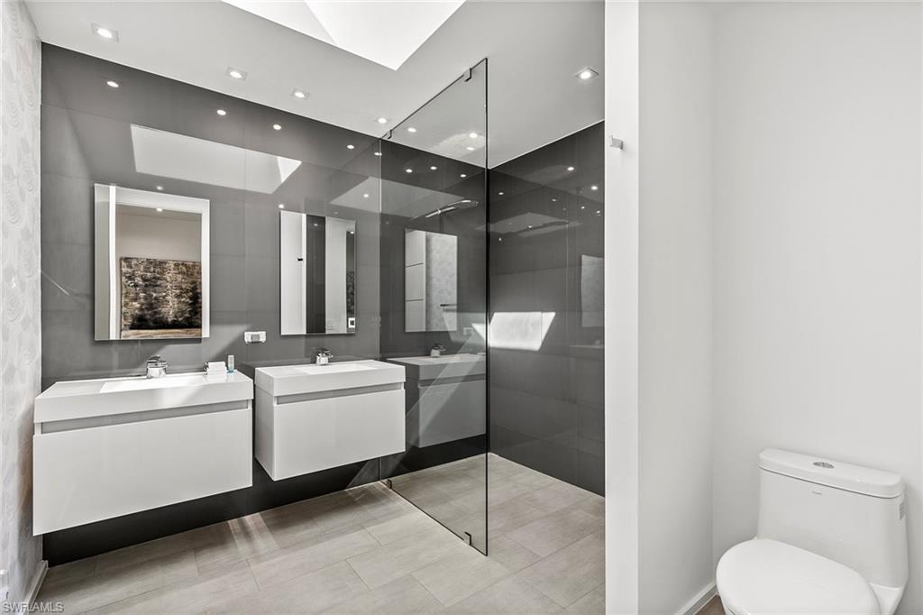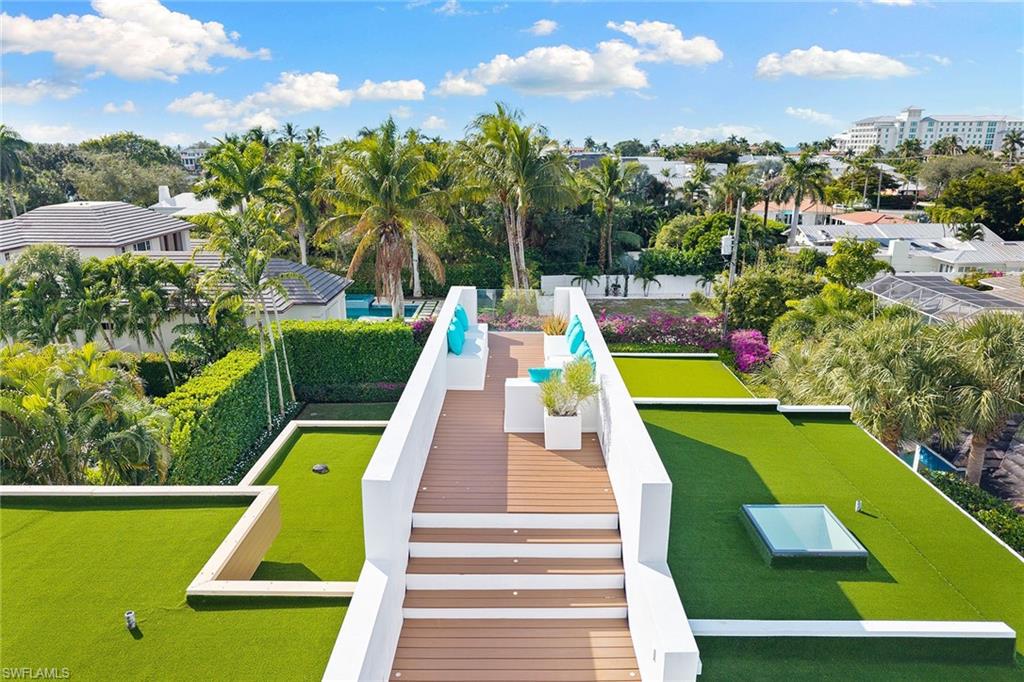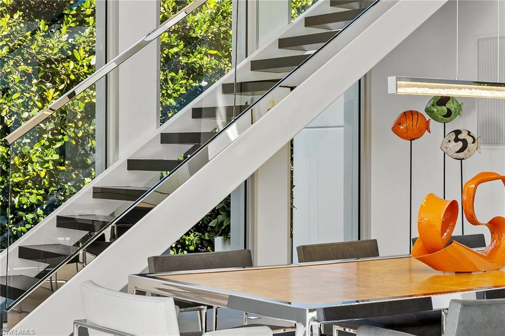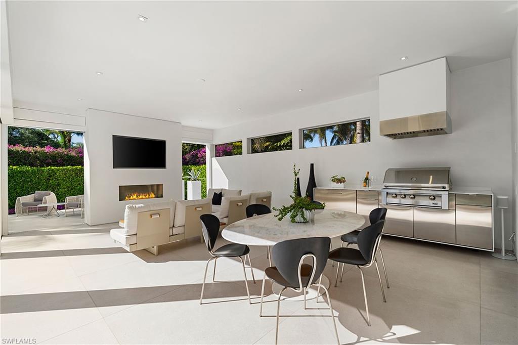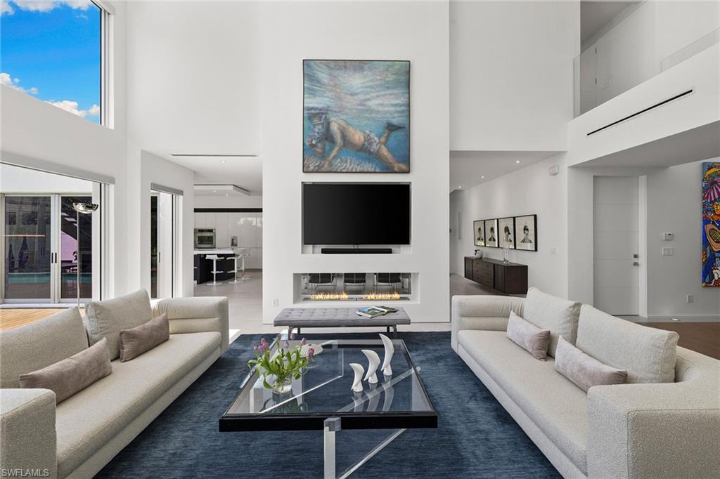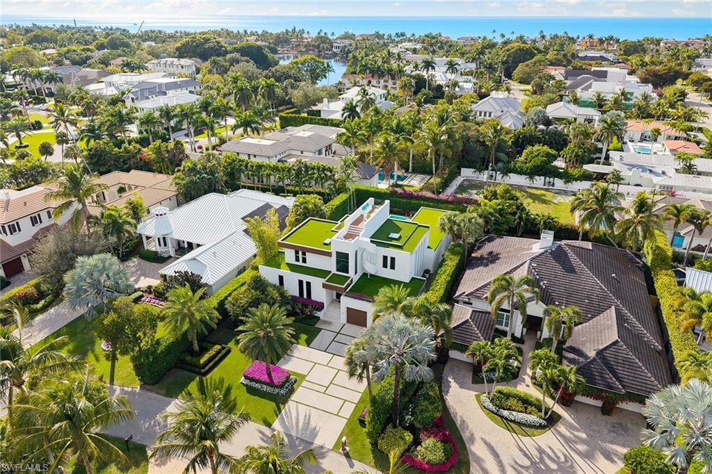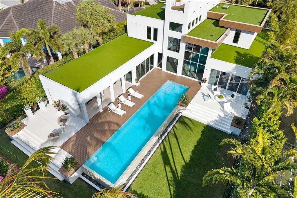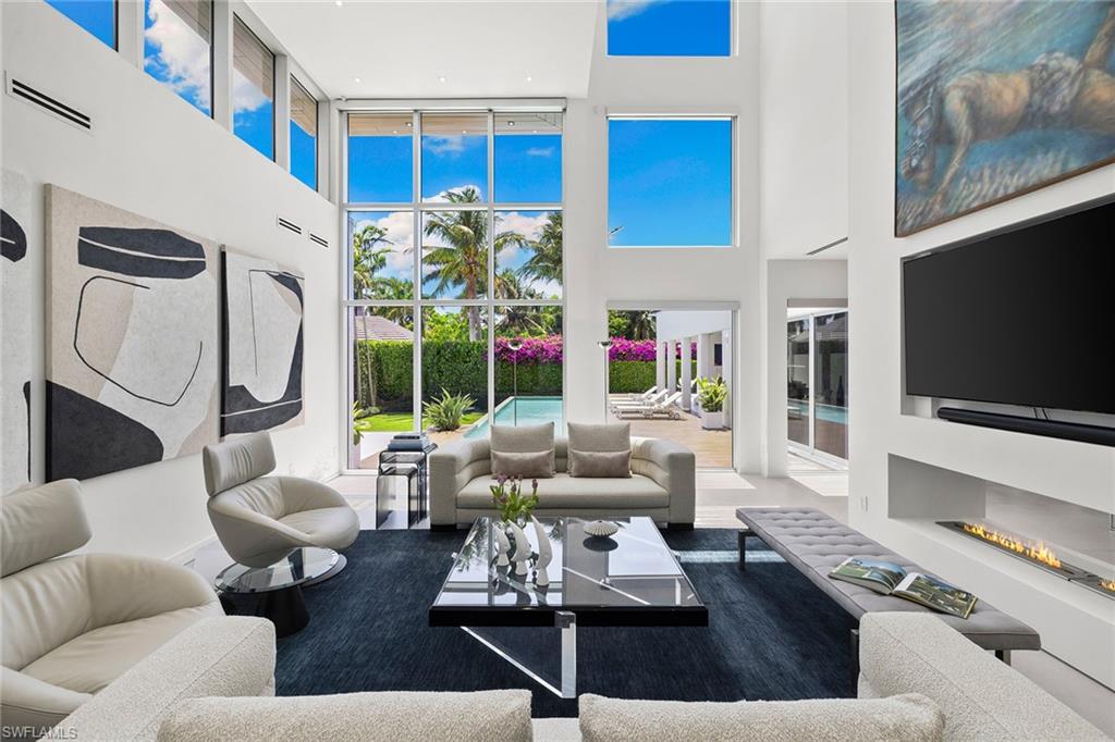 A striking custom contemporary residence ideally positioned in one of downtown Naples’ most sought-after neighborhoods, just a short stroll to the beach and the new Four Seasons Naples Beach Resort. Set on an expansive and private 0. 30-acre west facing homesite and built 3 feet above FEMA’s current level with no water close to property or a garage level during any hurricane. This exceptional pool home offers the rare combination of architectural presence, refined interiors, fine craftsmanship with extraordinary attention to details, luxury finishes in a premier coastal location in the very heart of Naples. Built in 2013 and designer renovated in 2023, the home offers 3, 843 SF under air and 7, 576 total, featured in "Florida Design" and “Gulf Shore Life” design magazines, the home welcomes you through an inviting double door entrance and foyer with 22ft soaring ceilings. Thoughtfully designed for both elegant entertaining and everyday living, the main level features a private study with custom built-in cabinetry, a spacious primary suite with a spa-inspired bathroom including a soaking tub, separate shower, a generous walk-in closet, and a conveniently located laundry room. Sliding glass doors lead to an open sitting area overlooking the private garden and 50 foot double infinity edge pool. The light-filled great room is the centerpiece of the home, showcasing dramatic 18ft ceiling height, a linear double-sided fireplace and a stunning a floor to ceiling wall of glass that frames views of the private oversized backyard, pool and decks. Adjacent is the dining area and a chef’s gourmet kitchen, oversized island with quartz countertops, and imported custom cabinetry, all with picturesque pool and garden views. Sliding glass doors open to a covered lanai designed for year-round enjoyment, complete with a linear fireplace, brand new outdoor kitchen and grill, electric screened enclosure with surrounding lounge decks and pool that creates a serene and private outdoor retreat. The second level presents two generously sized en-suite guest bedrooms, a second-floor laundry, and access, via a sculptural feature spiral staircase, to an open rooftop deck—an extraordinary vantage point to entertain and enjoy sweeping city and sneek Gulf views and exceptional sunsets. Additional highlights include a two-car garage, a custom grass paver driveway and beautiful landscaping. Ideally located just minutes from Fifth Avenue South’s renowned fine dining, boutique shopping, galleries, and cultural venues. Never previously offered to the market, this represents an opportunity to own this exceptional designer residence.