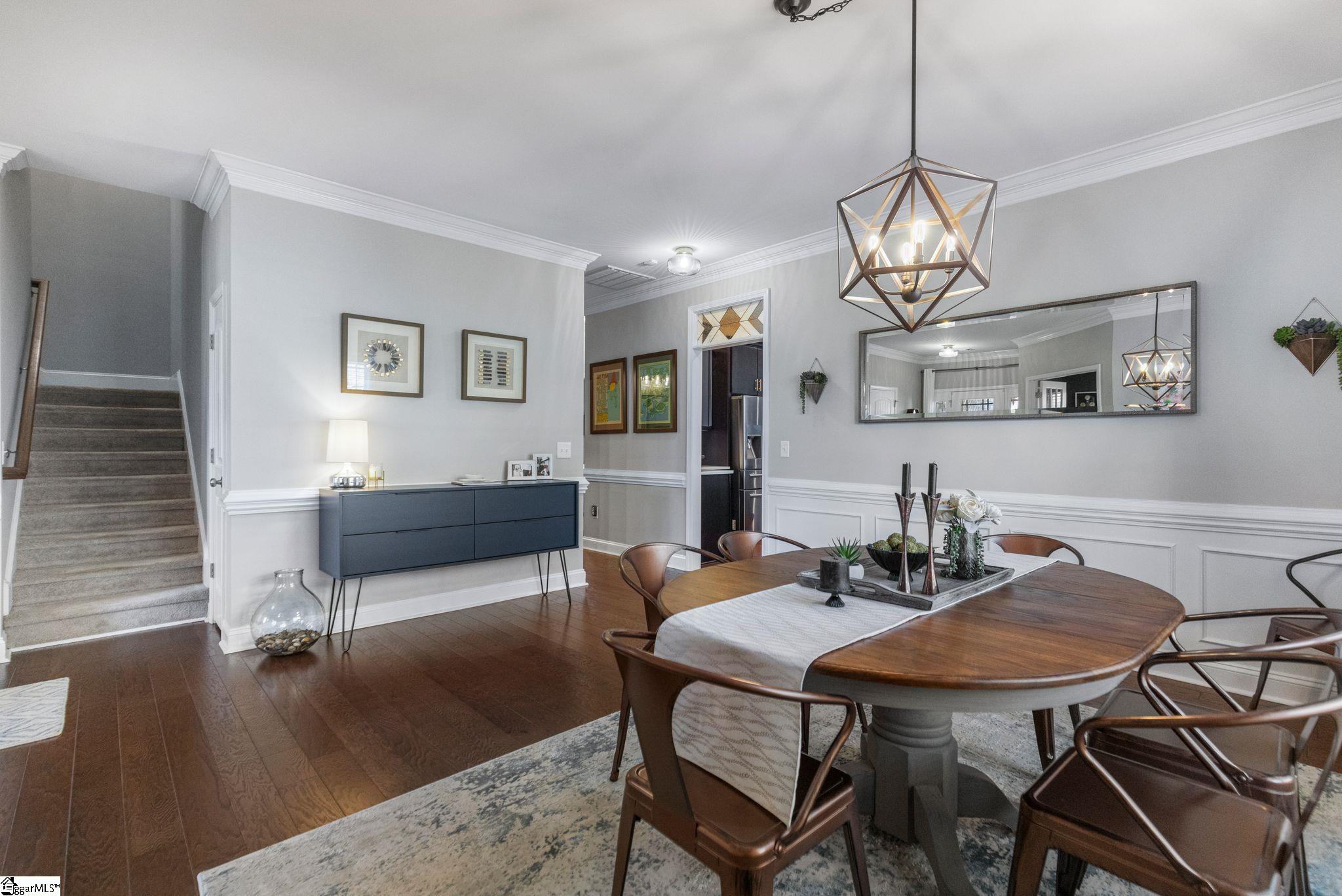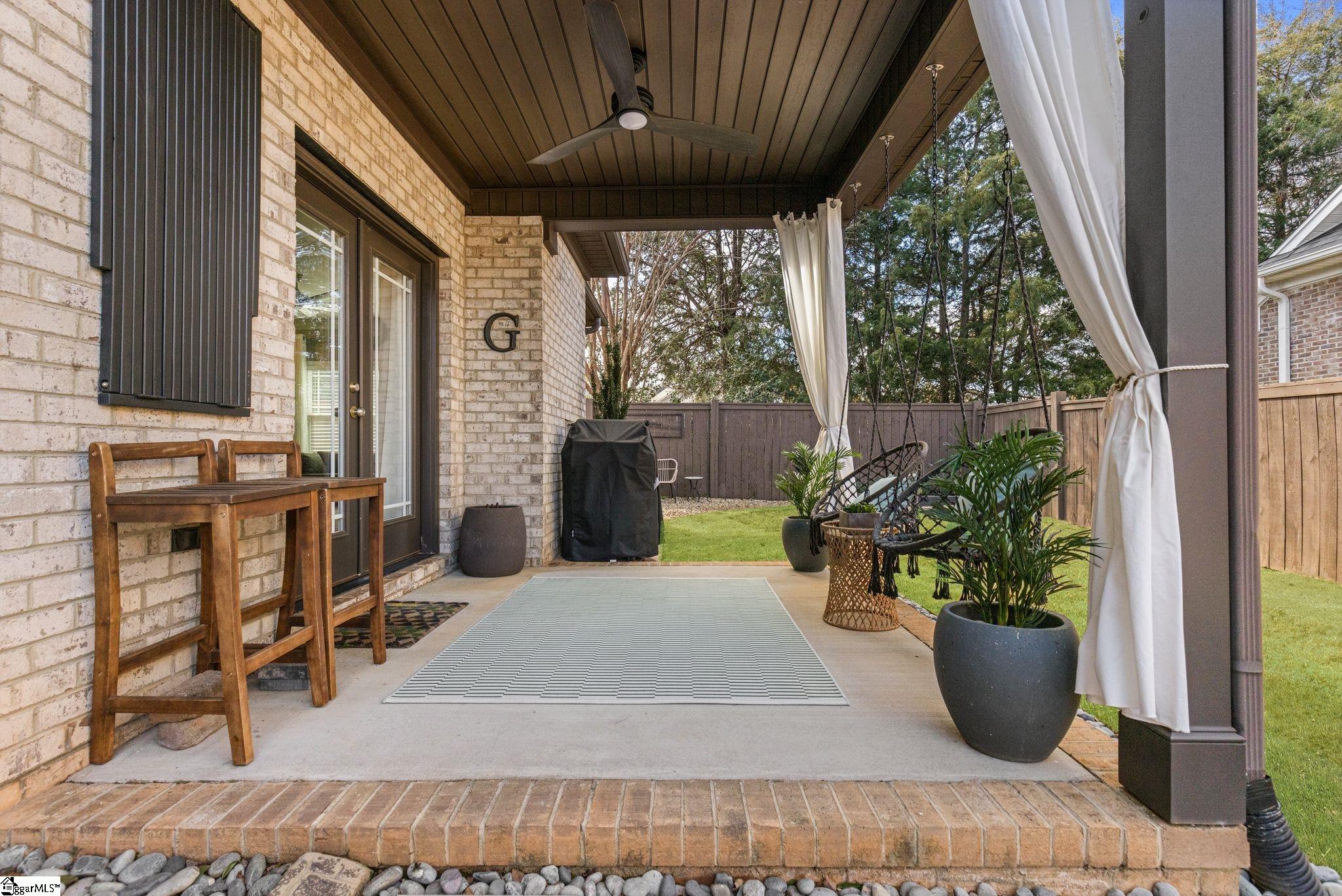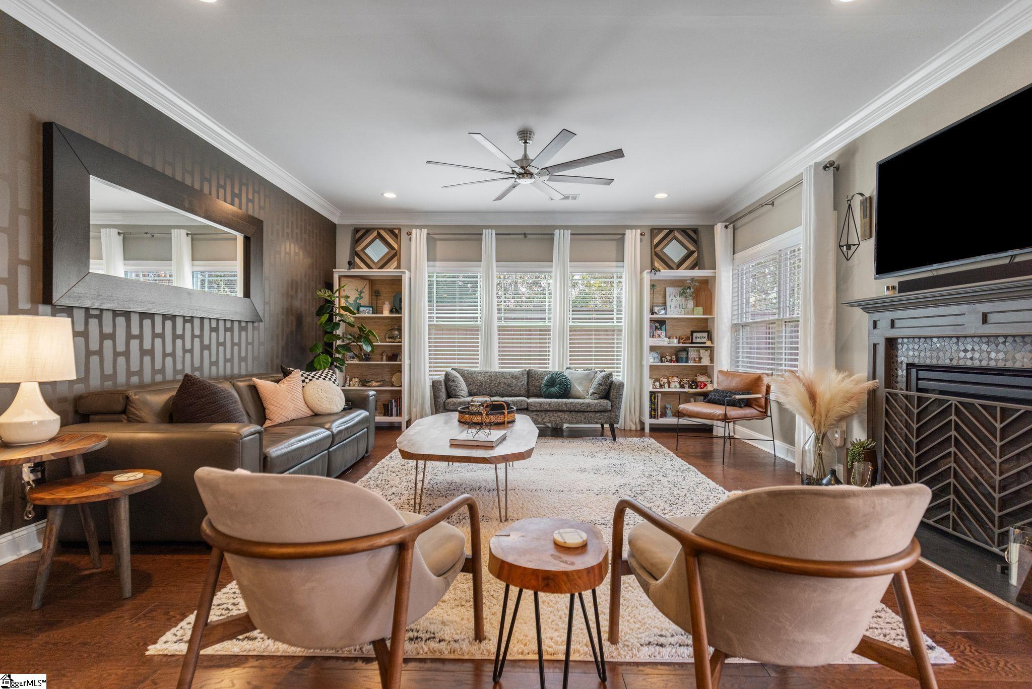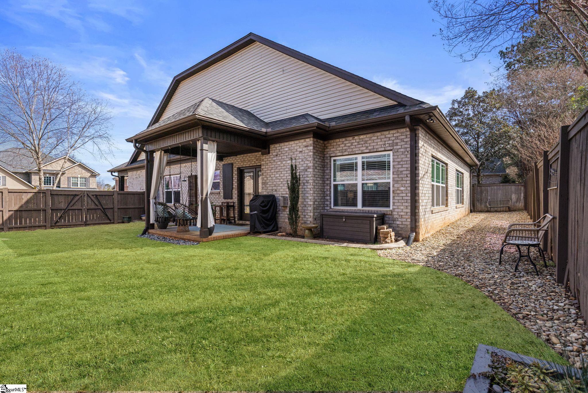 This beautiful Five Forks home is an all-brick 3 bedroom, 2 full bathroom home with over 2, 300 sqft of living space including a bonus room that could easily be a 4th bedroom and versatile flex space being used as an office. The inviting covered front porch features custom wood shutters and an impressive brick inlay, setting the tone for the quality and care found throughout. Inside, the easy-to-navigate floor plan showcases gleaming hardwood floors, crown molding, and detailed millwork across the foyer, office, dining area, kitchen, living room, and primary bedroom. The open-concept living area is bright and welcoming with abundant natural light, a gas log fireplace, accent wall, and large ceiling fan. The kitchen is designed for both style and function, featuring quartz countertops, stainless steel appliances, marble tile backsplash, recessed lighting, ornate cabinetry with glass corner accents, rubbed brass hardware, a deep single-basin sink, custom pantry shelving, and a spacious island with bar seating. The main-level primary suite offers a ceiling fan, tray ceiling, and a large walk-in closet with a custom storage system. The private primary bathroom includes quartz countertops, dual sinks, brushed nickel fixtures, vaulted ceiling, tile flooring, linen closet, and a tiled walk-in shower with glass door. Two additional bedrooms on the main level feature carpet, ceiling fans, and spacious closets, while the secondary bath includes quartz countertops, tile flooring, an accent wall, and a tub/shower combination. A flex room mentioned earlier or home office near the foyer provides a quiet workspace with French double doors, chair rails, and crown molding. The dining area is open and airy with updated lighting, wainscoting, chair rails, crown molding, and those beautiful hardwood floors. The main-level laundry room offers cabinetry for added storage and a clean, organized feel. Upstairs, the spacious bonus room includes carpet, ceiling fan, a large closet, and access to attic storage with additional flooring and a radiant barrier. As mentioned previously this versatile space could easily serve as a fourth bedroom, media room, or playroom. Enjoy outdoor living on the 10x10 covered back porch complete with porch swings, ceiling fan, privacy curtains, outdoor shower, and a built-in folding tabletop. The home also features a fully fenced backyard, raised flower bed, extensive landscaping and a full yard irrigation system. Additional features include remote-controlled ceiling fans, gas water heater with leak detection system, insulated garage door with My Q smart garage system, and AT&T fiber internet. Located in Asheton Lakes, residents enjoy exclusive access to a community pool, clubhouse, three private lakes stocked with fish, and scenic walking trails. Convenient to top-rated schools including Southside Christian, shopping, and dining, this home offers the perfect blend of comfort, efficiency, and lifestyle. Schedule your private tour today!