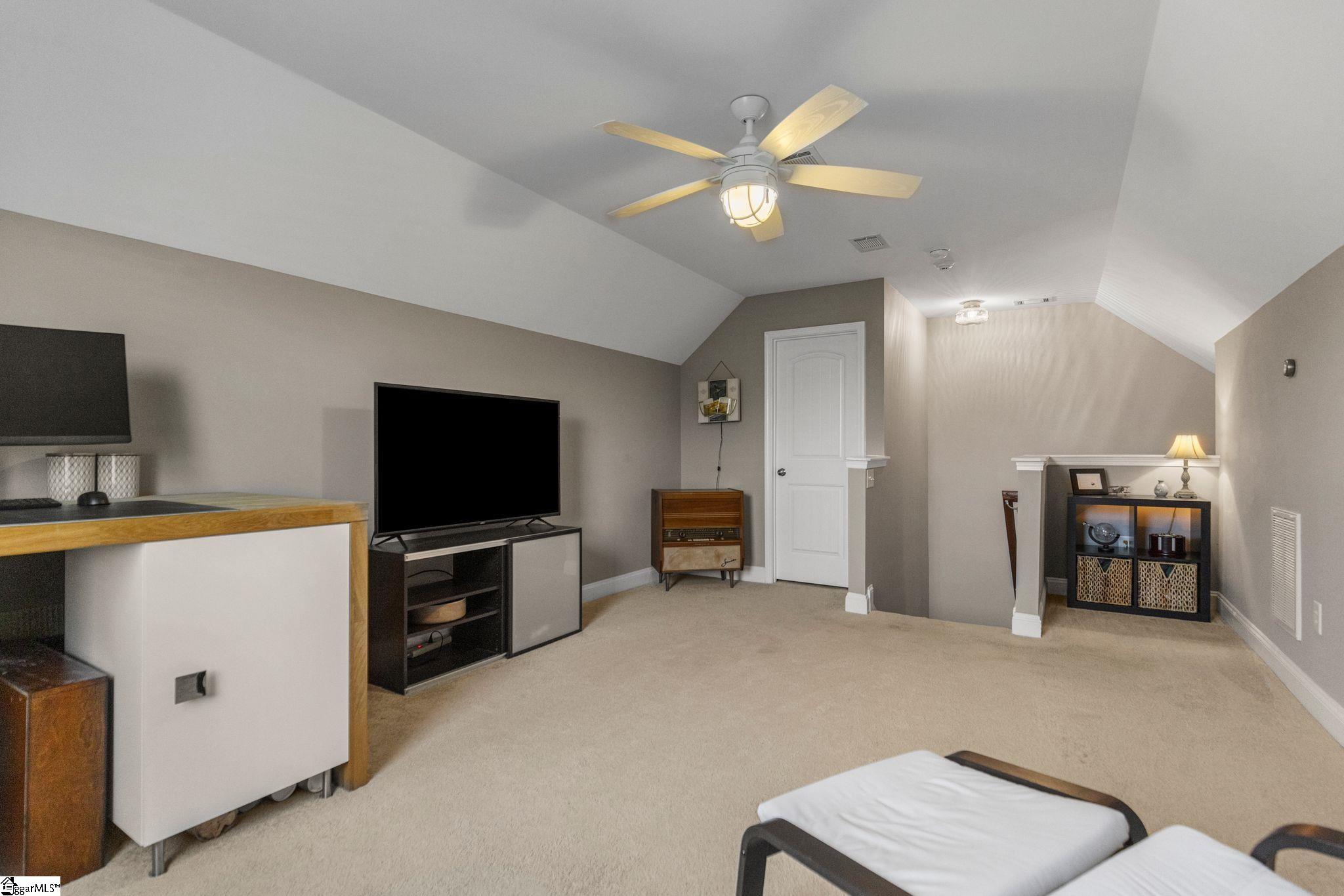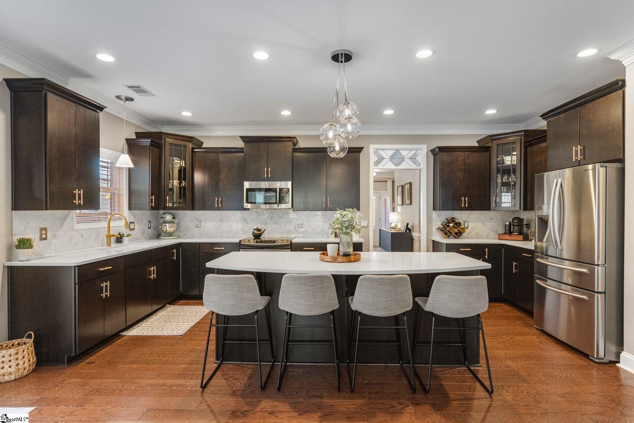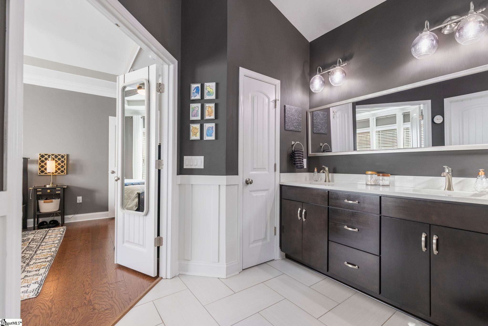 This beautiful Five Forks home is an all-brick 3 bedroom, 2 full bathroom home with over 2, 300 sqft of living space including a bonus room that could easily be a 4th bedroom and versatile flex space being used as an office. The inviting covered front porch features custom wood shutters and an impressive brick inlay, setting the tone for the quality and care found throughout. Inside, the easy-to-navigate floor plan showcases gleaming hardwood floors, crown molding, and detailed millwork across the foyer, office, dining area, kitchen, living room, and primary bedroom. The open-concept living area is bright and welcoming with abundant natural light, a gas log fireplace, accent wall, and large ceiling fan. The kitchen is designed for both style and function, featuring quartz countertops, stainless steel appliances, marble tile backsplash, recessed lighting, ornate cabinetry with glass corner accents, rubbed brass hardware, a deep single-basin sink, custom pantry shelving, and a spacious island with bar seating. The main-level primary suite offers a ceiling fan, tray ceiling, and a large walk-in closet with a custom storage system. The private primary bathroom includes quartz countertops, dual sinks, brushed nickel fixtures, vaulted ceiling, tile flooring, linen closet, and a tiled walk-in shower with glass door. Two additional bedrooms on the main level feature carpet, ceiling fans, and spacious closets, while the secondary bath includes quartz countertops, tile flooring, an accent wall, and a tub/shower combination. A flex room mentioned earlier or home office near the foyer provides a quiet workspace with French double doors, chair rails, and crown molding. The dining area is open and airy with updated lighting, wainscoting, chair rails, crown molding, and those beautiful hardwood floors. The main-level laundry room offers cabinetry for added storage and a clean, organized feel. Upstairs, the spacious bonus room includes carpet, ceiling fan, a large closet, and access to attic storage with additional flooring and a radiant barrier. As mentioned previously this versatile space could easily serve as a fourth bedroom, media room, or playroom. Enjoy outdoor living on the 10x10 covered back porch complete with porch swings, ceiling fan, privacy curtains, outdoor shower, and a built-in folding tabletop. The home also features a fully fenced backyard, raised flower bed, extensive landscaping and a full yard irrigation system. Additional features include remote-controlled ceiling fans, gas water heater with leak detection system, insulated garage door with My Q smart garage system, and AT&T fiber internet. Located in Asheton Lakes, residents enjoy exclusive access to a community pool, clubhouse, three private lakes stocked with fish, and scenic walking trails. Convenient to top-rated schools including Southside Christian, shopping, and dining, this home offers the perfect blend of comfort, efficiency, and lifestyle. Schedule your private tour today!