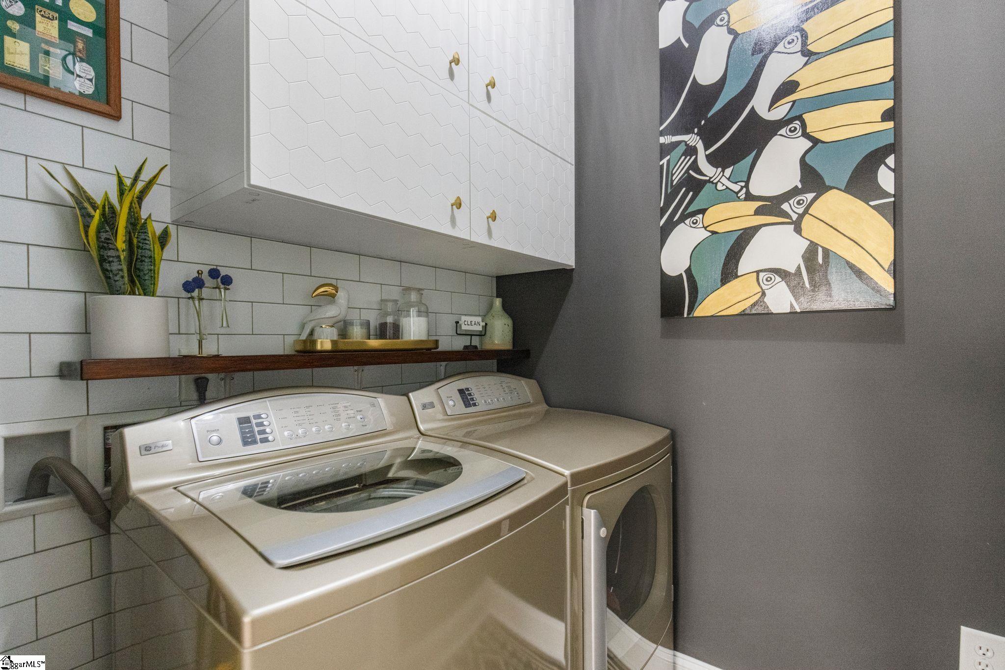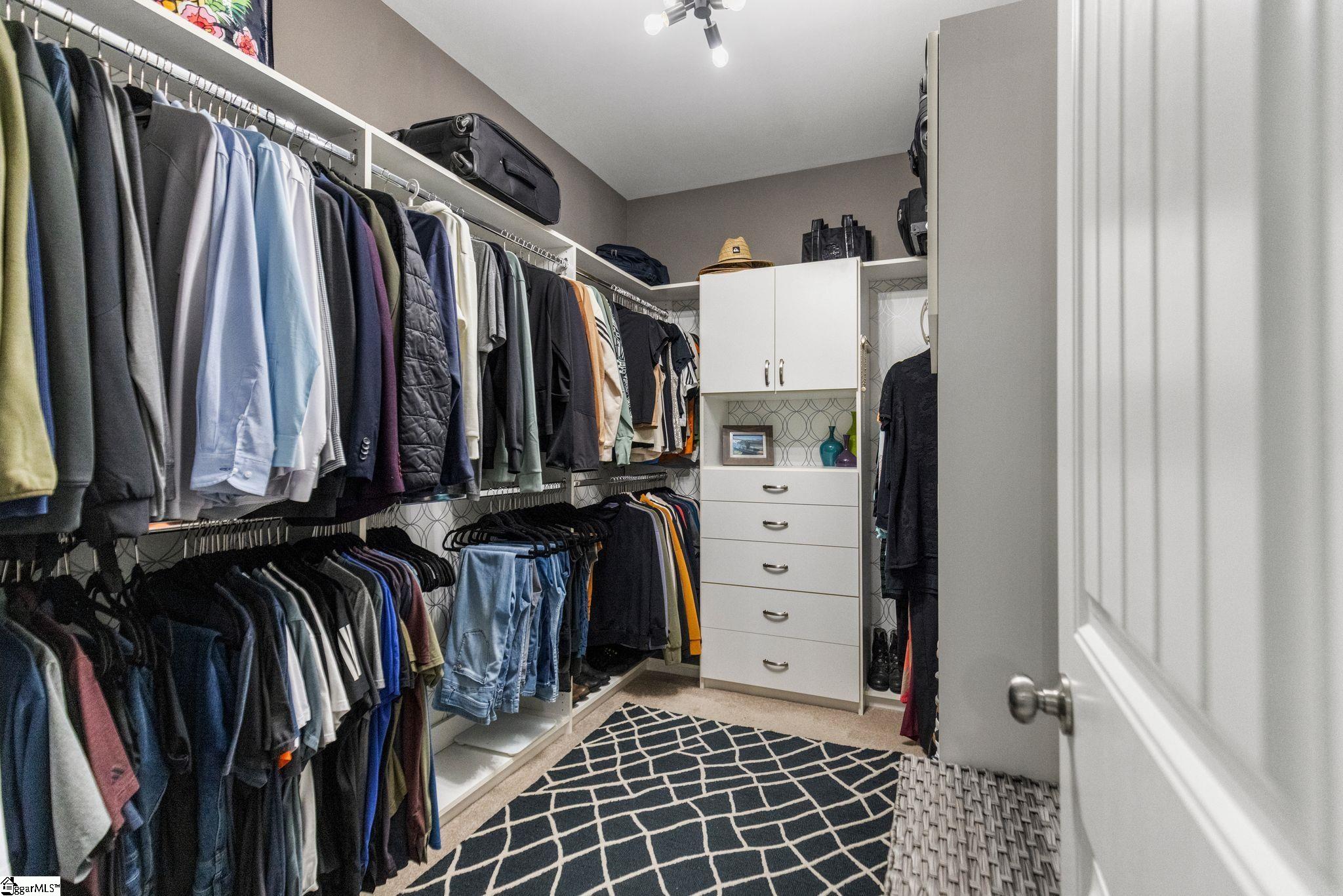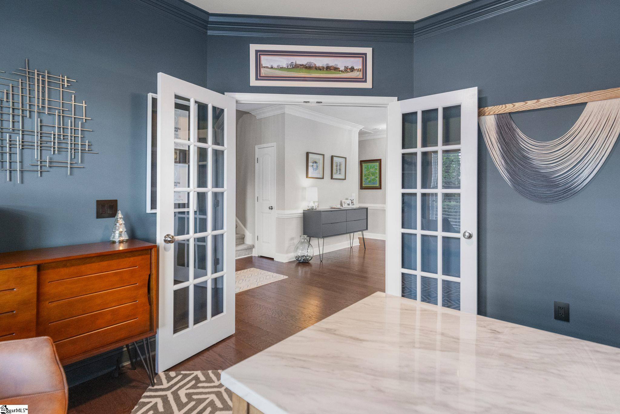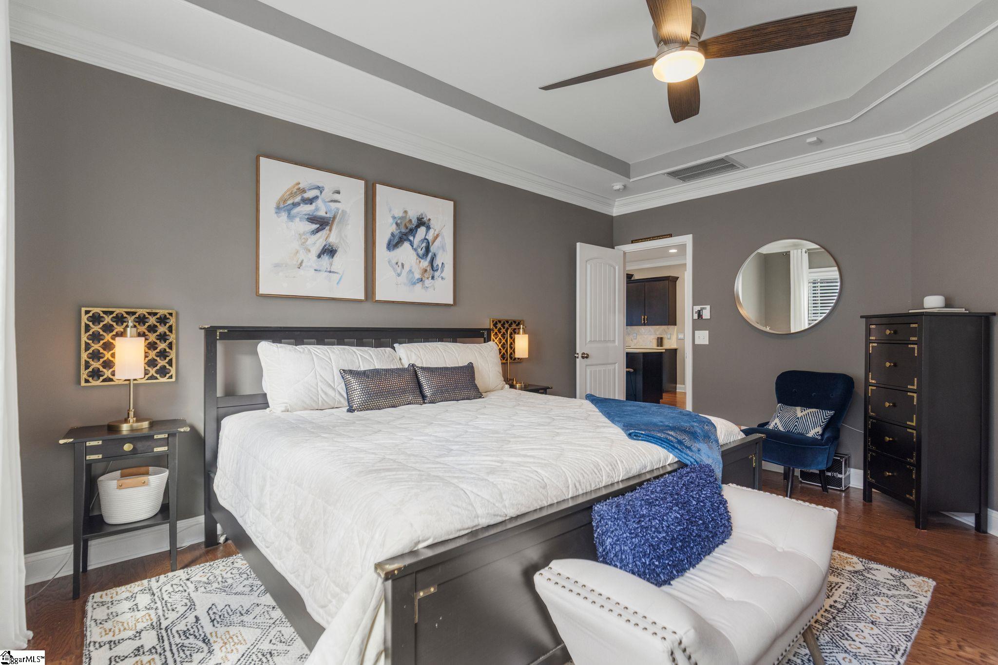This beautiful Five Forks home is an all-brick 3 bedroom, 2 full bathroom home with over 2, 300 sqft of living space including a bonus room that could easily be a 4th bedroom and versatile flex space being used as an office. The inviting covered front porch features custom wood shutters and an impressive brick inlay, setting the tone for the quality and care found throughout. Inside, the easy-to-navigate floor plan showcases gleaming hardwood floors, crown molding, and detailed millwork across the foyer, office, dining area, kitchen, living room, and primary bedroom. The open-concept living area is bright and welcoming with abundant natural light, a gas log fireplace, accent wall, and large ceiling fan. The kitchen is designed for both style and function, featuring quartz countertops, stainless steel appliances, marble tile backsplash, recessed lighting, ornate cabinetry with glass corner accents, rubbed brass hardware, a deep single-basin sink, custom pantry shelving, and a spacious island with bar seating. The main-level primary suite offers a ceiling fan, tray ceiling, and a large walk-in closet with a custom storage system. The private primary bathroom includes quartz countertops, dual sinks, brushed nickel fixtures, vaulted ceiling, tile flooring, linen closet, and a tiled walk-in shower with glass door. Two additional bedrooms on the main level feature carpet, ceiling fans, and spacious closets, while the secondary bath includes quartz countertops, tile flooring, an accent wall, and a tub/shower combination. A flex room mentioned earlier or home office near the foyer provides a quiet workspace with French double doors, chair rails, and crown molding. The dining area is open and airy with updated lighting, wainscoting, chair rails, crown molding, and those beautiful hardwood floors. The main-level laundry room offers cabinetry for added storage and a clean, organized feel. Upstairs, the spacious bonus room includes carpet, ceiling fan, a large closet, and access to attic storage with additional flooring and a radiant barrier. As mentioned previously this versatile space could easily serve as a fourth bedroom, media room, or playroom. Enjoy outdoor living on the 10x10 covered back porch complete with porch swings, ceiling fan, privacy curtains, outdoor shower, and a built-in folding tabletop. The home also features a fully fenced backyard, raised flower bed, extensive landscaping and a full yard irrigation system. Additional features include remote-controlled ceiling fans, gas water heater with leak detection system, insulated garage door with My Q smart garage system, and AT&T fiber internet. Located in Asheton Lakes, residents enjoy exclusive access to a community pool, clubhouse, three private lakes stocked with fish, and scenic walking trails. Convenient to top-rated schools including Southside Christian, shopping, and dining, this home offers the perfect blend of comfort, efficiency, and lifestyle. Schedule your private tour today!
