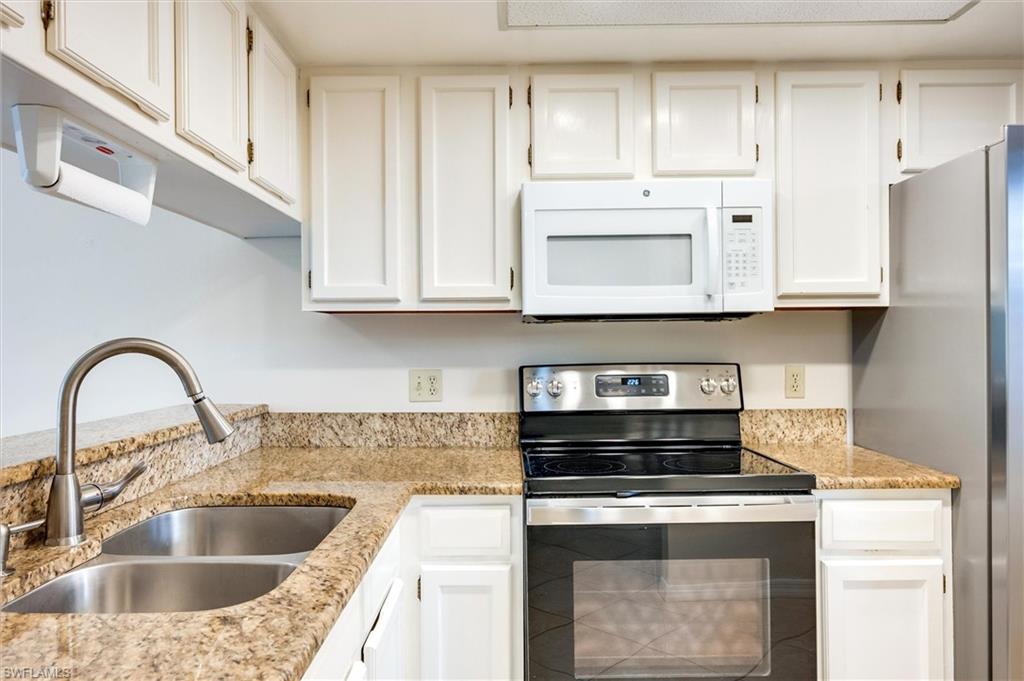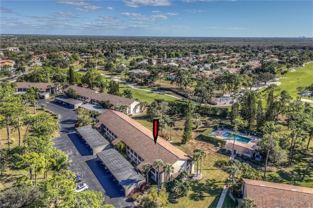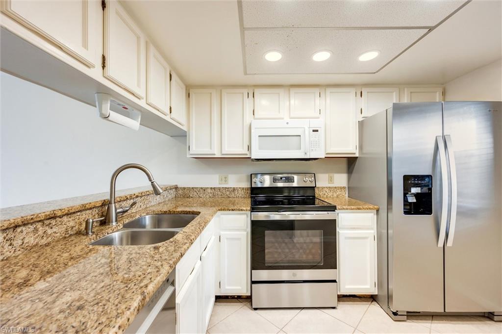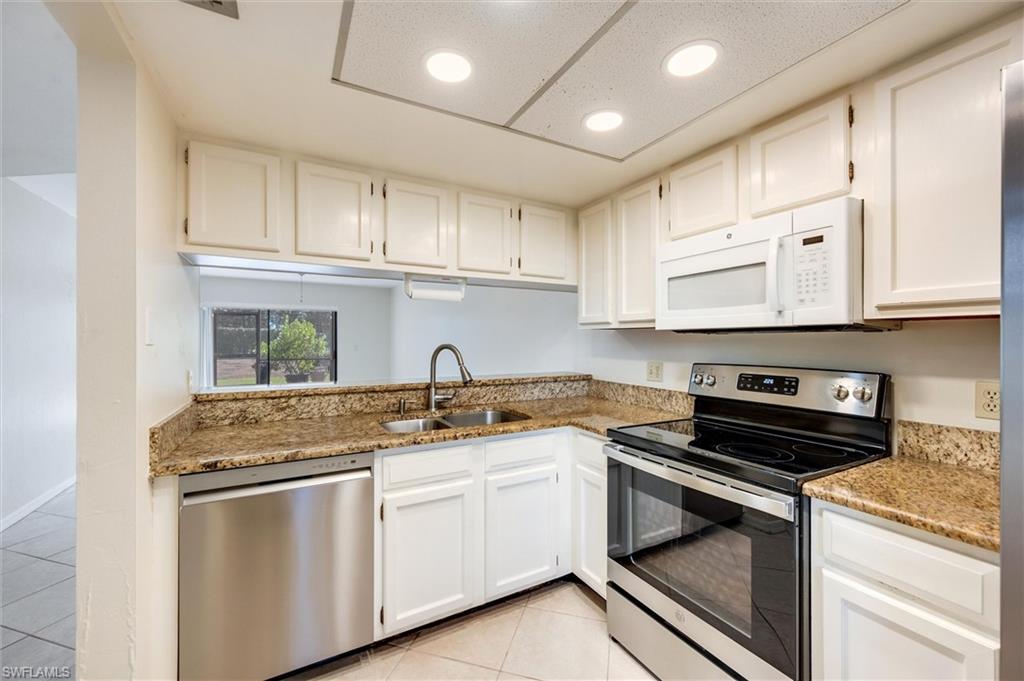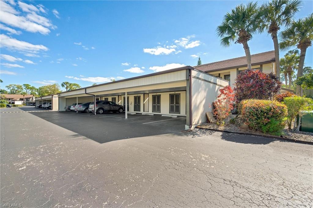 Perfect 1st floor location for easy access from carport to front door! New AC with 10 year warranty. Excellent South Naples location close to so many conveniences. This south facing condo overlooks green space, mature landscaping and is just steps from the pool. Covered carport and extra storage included. Two bedrooms and two baths. Updated master bath with dual vanities. Tile through out and granite kitchen counters. New refrigerator, stove and dishwasher and also NEW AC. Will be freshly painted early January. The buildings have a newer roof and have been freshly painted. Just minutes to downtown Naples, beaches, & Bayshore art district. This condo has never flooded.