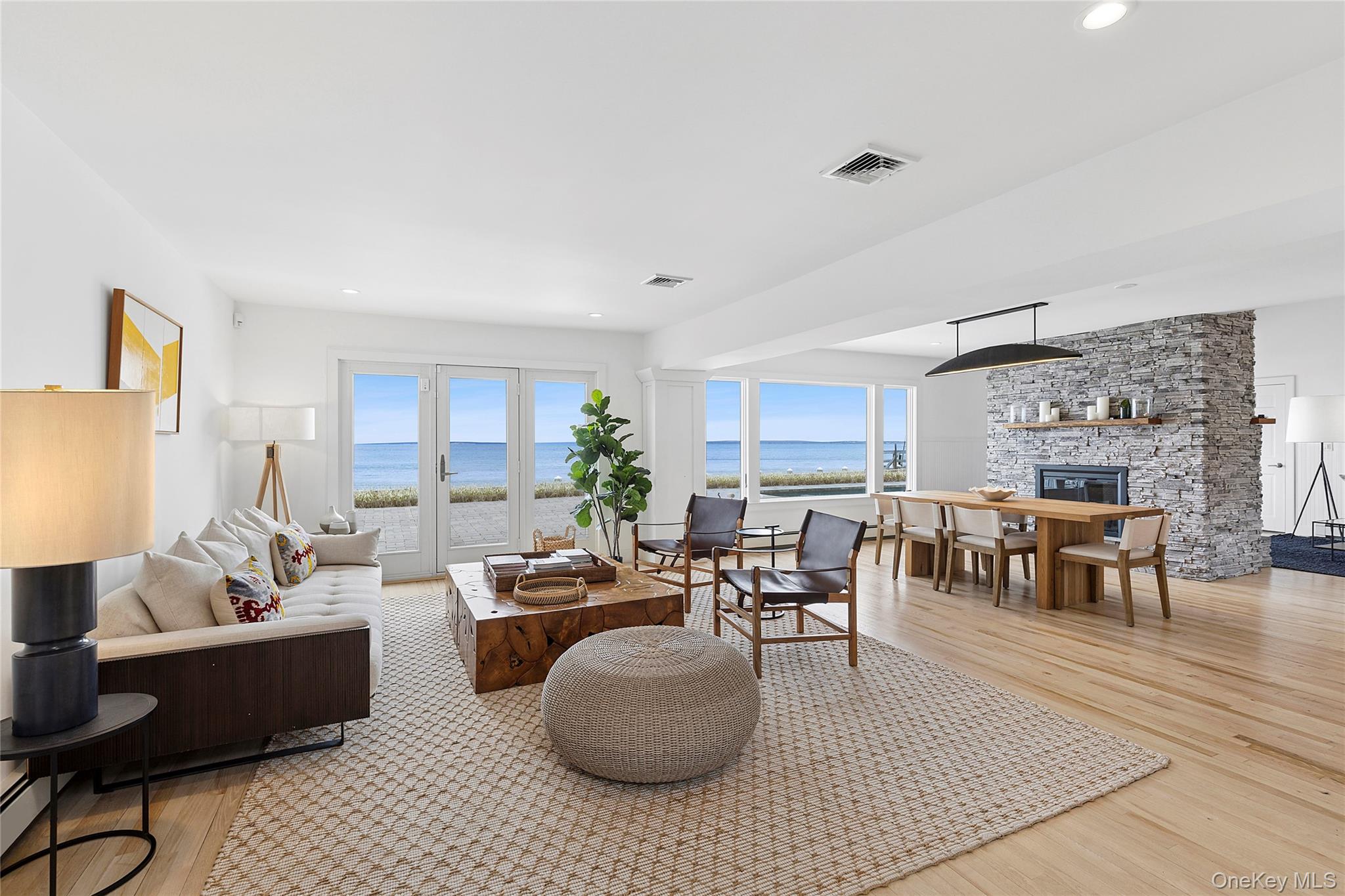 Recently expanded and renovated with a fresh, modern coastal aesthetic by Hyphen & Co. , this charming Cape Cod beach house with breathtaking views of the Peconic Bay that span to Robin's Island can be your Hampton's escape! With approx. 120 feet of bulkheading and a sprawling private sandy beach below, this 4-bedroom, 5-bath waterfront home in a private community, is the perfect summer get-away for those looking for an elegant and secluded beach home. The meticulously maintained house is inviting and gracious, with an open floor plan that emphasizes the panoramic water views from the living room, modern chef's kitchen, dining area, and den, with a double-sided stone fireplace. Two guest bedrooms, 2 full bathrooms, and a laundry/mudroom complete the first floor. Upstairs, the primary suite with balcony offers a serene retreat with a luxurious bath, offering double-vanity sinks, walk-in shower, deep soaking tub, and separate water closet. An additional guest bedroom and full bath complete the second floor. A finished and permitted lower level with a recreation space and wine room, along with a two-car garage, are rare for this type of waterfront property and provide exceptional space and amenities. Above the garage, a spacious rec room with stunning views adds even more versatile bonus space. Outside, the new heated gunite pool and spa couldn't be closer to the sparkling waters of Peconic Bay with the sugar sand beach bayside below. Centrally located with ease of access to Southampton and points east, North Fork vineyards and farm stands, and 90 miles from NYC.