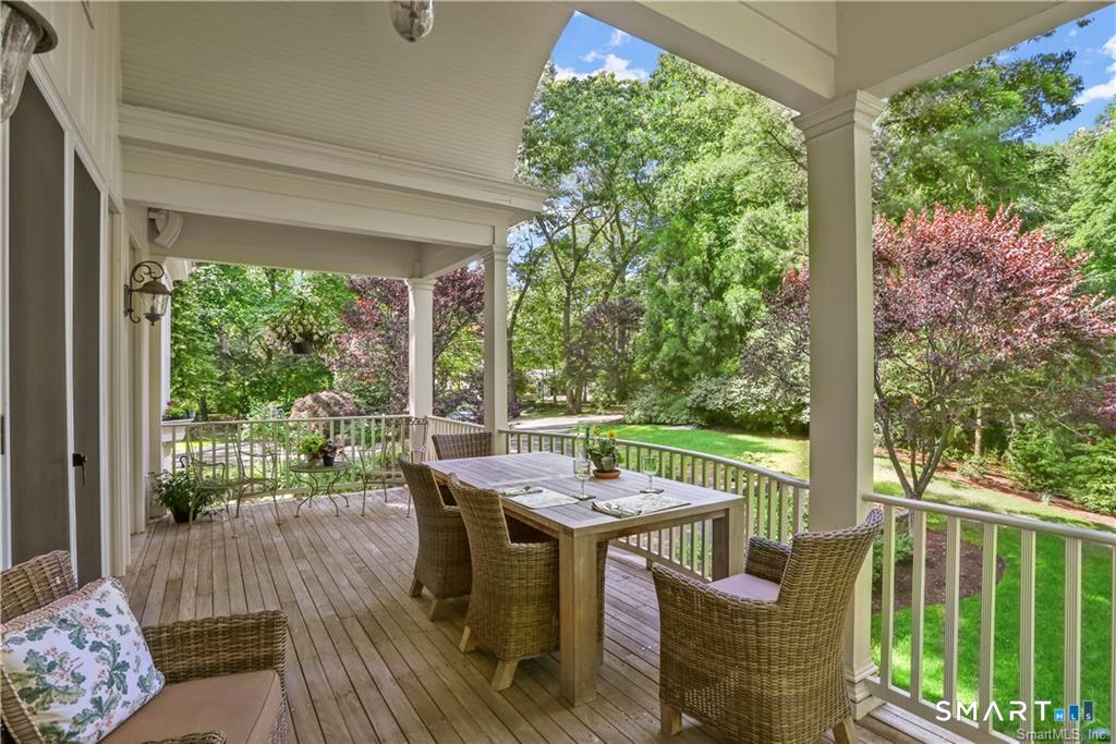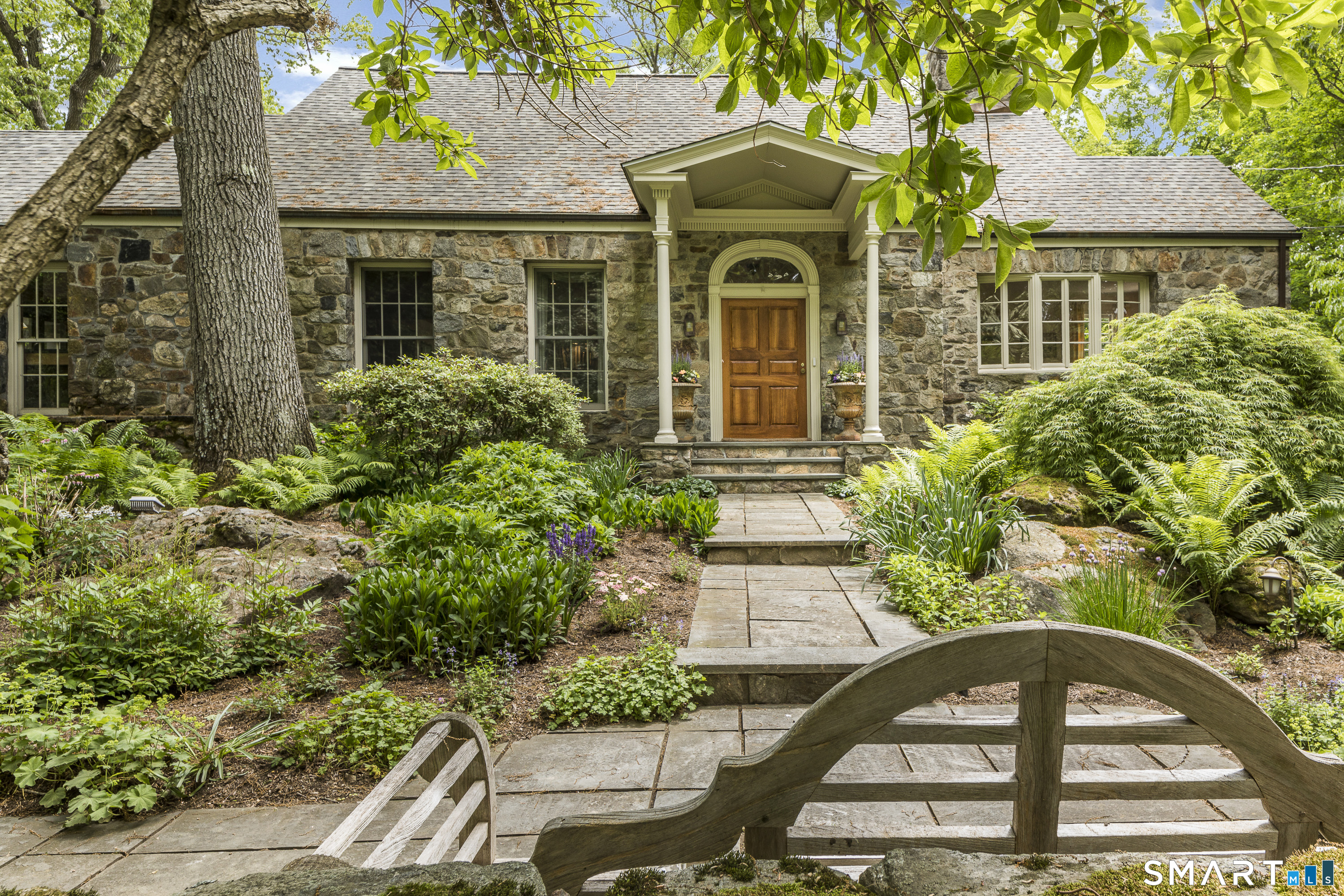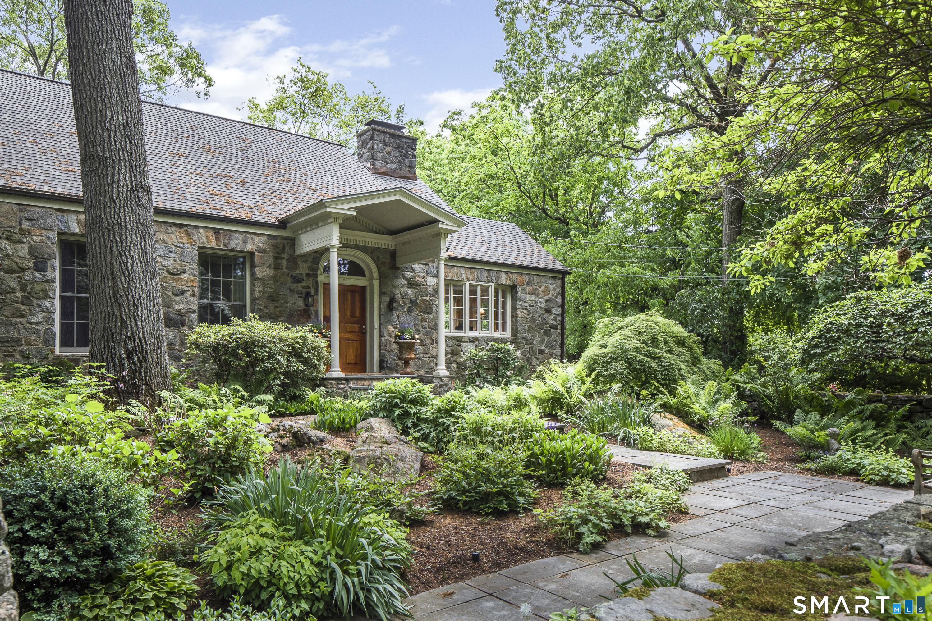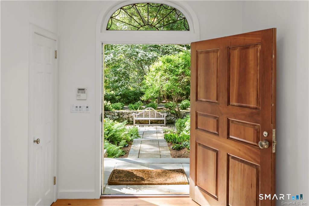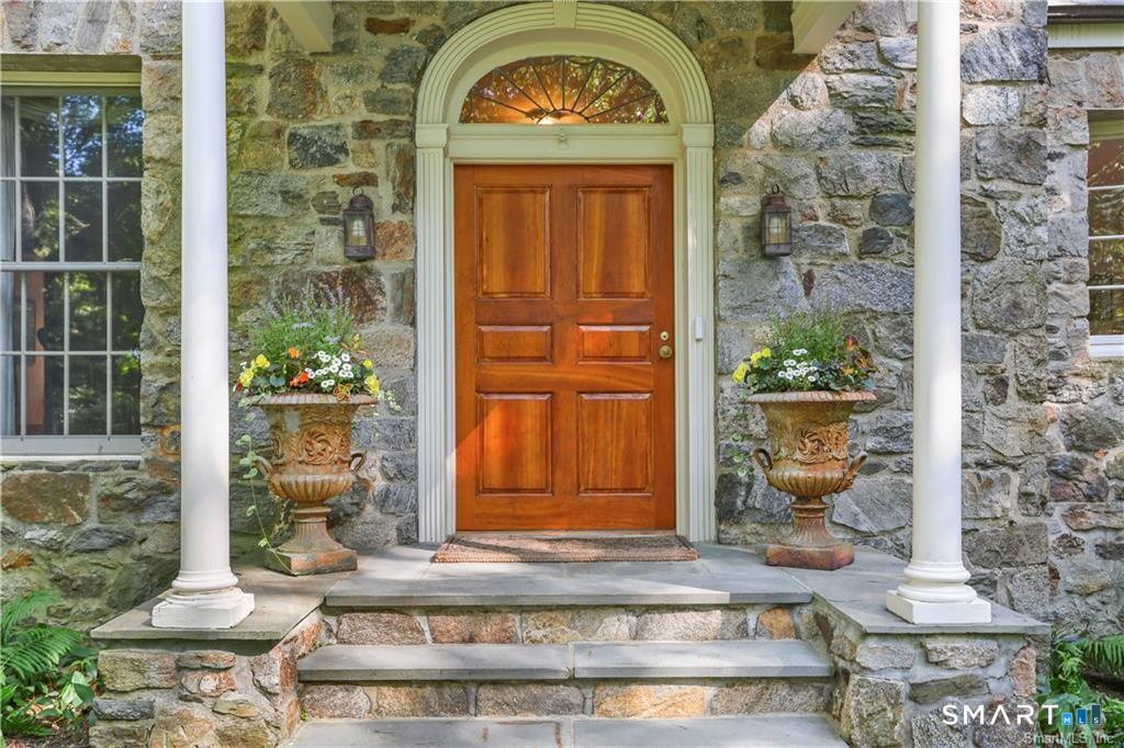 A rare opportunity to live on Topping Lane, a private wooded enclave Rowayton adjacent. Set atop a gentle rise on 1. 35 bucolic acres, this gracious stone-and-shingle residence offers five bedrooms and three and one-half baths in a serene, storybook setting defined by privacy, craftsmanship, and natural beauty. A circular drive winds through mature perennial gardens and English-style plantings to a substantial cherry front door, opening into an elegant foyer with wide-plank wood floors. The main level features a formal living room with fireplace, a formal dining room, a cherry-paneled library with fireplace, and a music room that anchors the home with warmth and character. At the heart of the residence is a spectacular kitchen-family room combination, renovated in the 1990s, unified by custom cherry millwork and soaring, chapel-like ceilings-ideal for both everyday living and entertaining. The chef's kitchen is exceptionally well equipped with Sub-Zero refrigeration, a commercial walk-in, a 60-inch Viking range, dual convection ovens, two dishwashers, and a convenient dumbwaiter to the garage. French doors open to a vaulted deck overlooking wooded grounds, ravine, and brook beyond. The primary suite occupies a private ground-level position, featuring warm maple finishes and a recently renovated spa-like bath with an oversized shower, soaking tub, and expansive alabaster countertops. A truly special offering in one of Norwalk's most coveted locations!