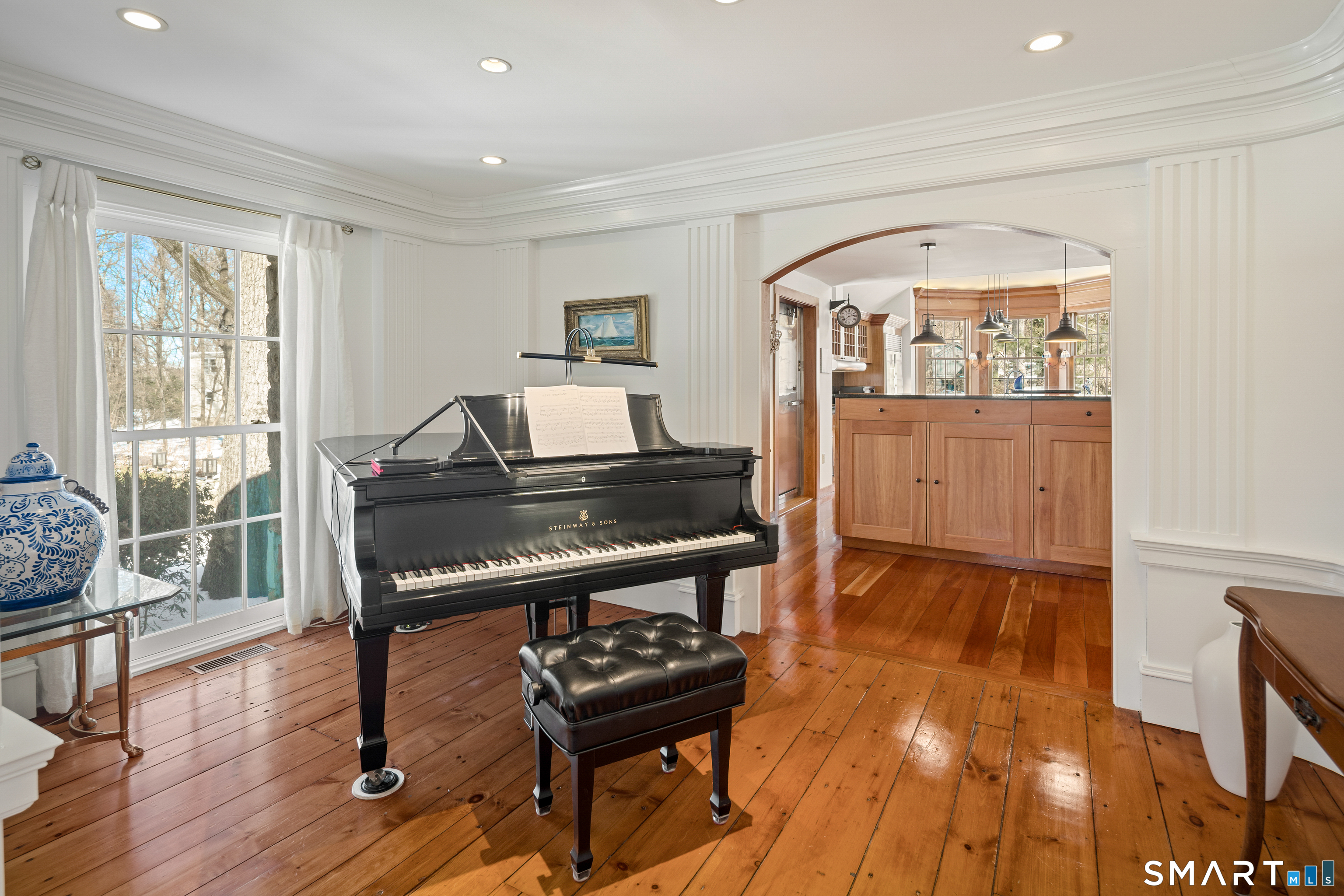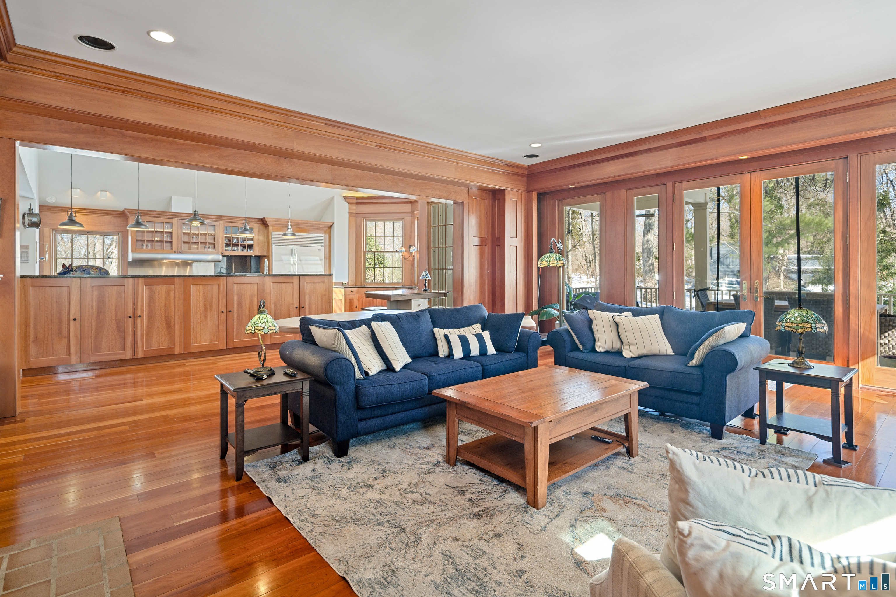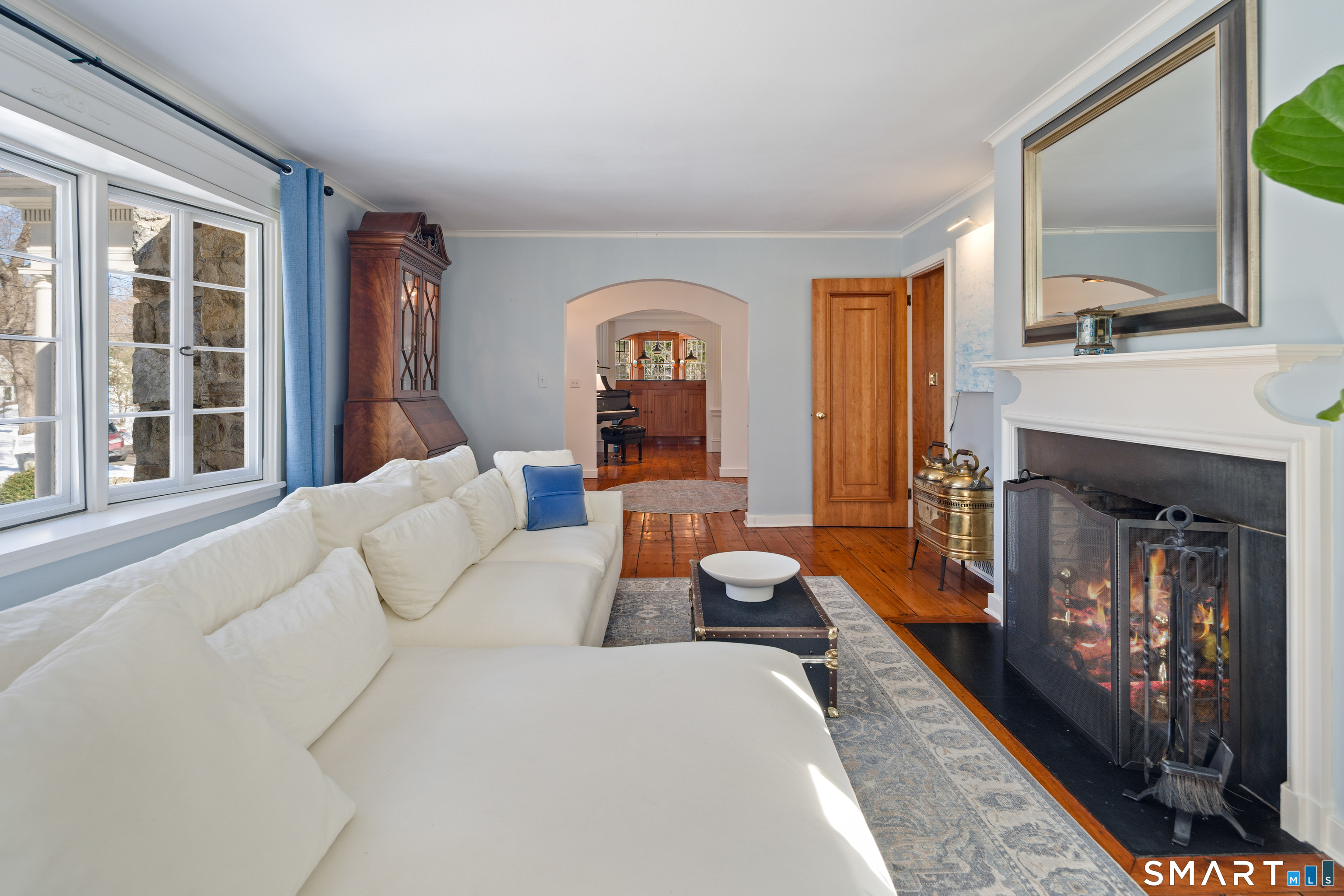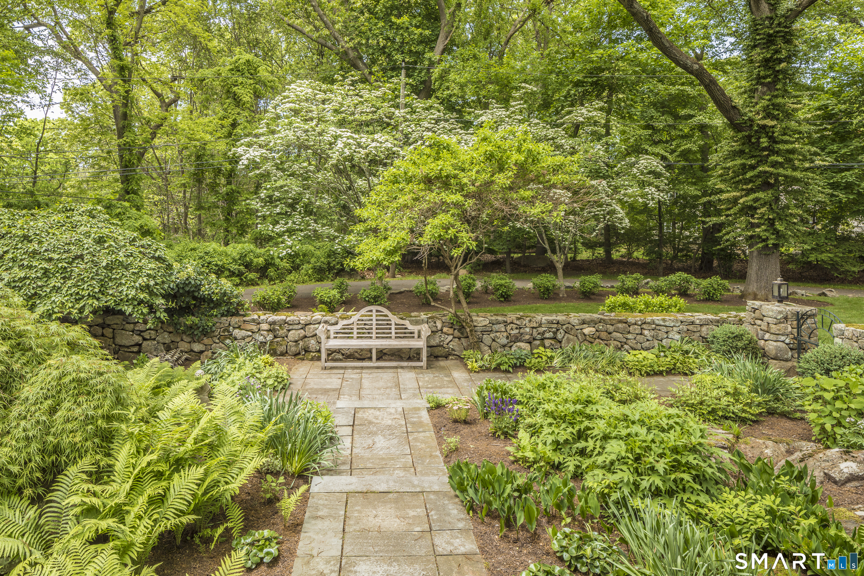 A rare opportunity to live on Topping Lane, a private wooded enclave Rowayton adjacent. Set atop a gentle rise on 1. 35 bucolic acres, this gracious stone-and-shingle residence offers five bedrooms and three and one-half baths in a serene, storybook setting defined by privacy, craftsmanship, and natural beauty. A circular drive winds through mature perennial gardens and English-style plantings to a substantial cherry front door, opening into an elegant foyer with wide-plank wood floors. The main level features a formal living room with fireplace, a formal dining room, a cherry-paneled library with fireplace, and a music room that anchors the home with warmth and character. At the heart of the residence is a spectacular kitchen-family room combination, renovated in the 1990s, unified by custom cherry millwork and soaring, chapel-like ceilings-ideal for both everyday living and entertaining. The chef's kitchen is exceptionally well equipped with Sub-Zero refrigeration, a commercial walk-in, a 60-inch Viking range, dual convection ovens, two dishwashers, and a convenient dumbwaiter to the garage. French doors open to a vaulted deck overlooking wooded grounds, ravine, and brook beyond. The primary suite occupies a private ground-level position, featuring warm maple finishes and a recently renovated spa-like bath with an oversized shower, soaking tub, and expansive alabaster countertops. A truly special offering in one of Norwalk's most coveted locations!