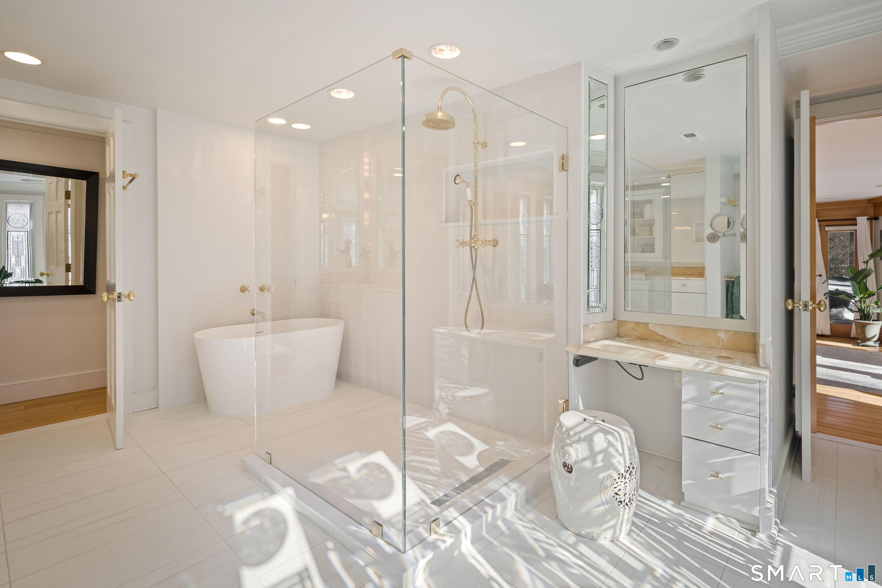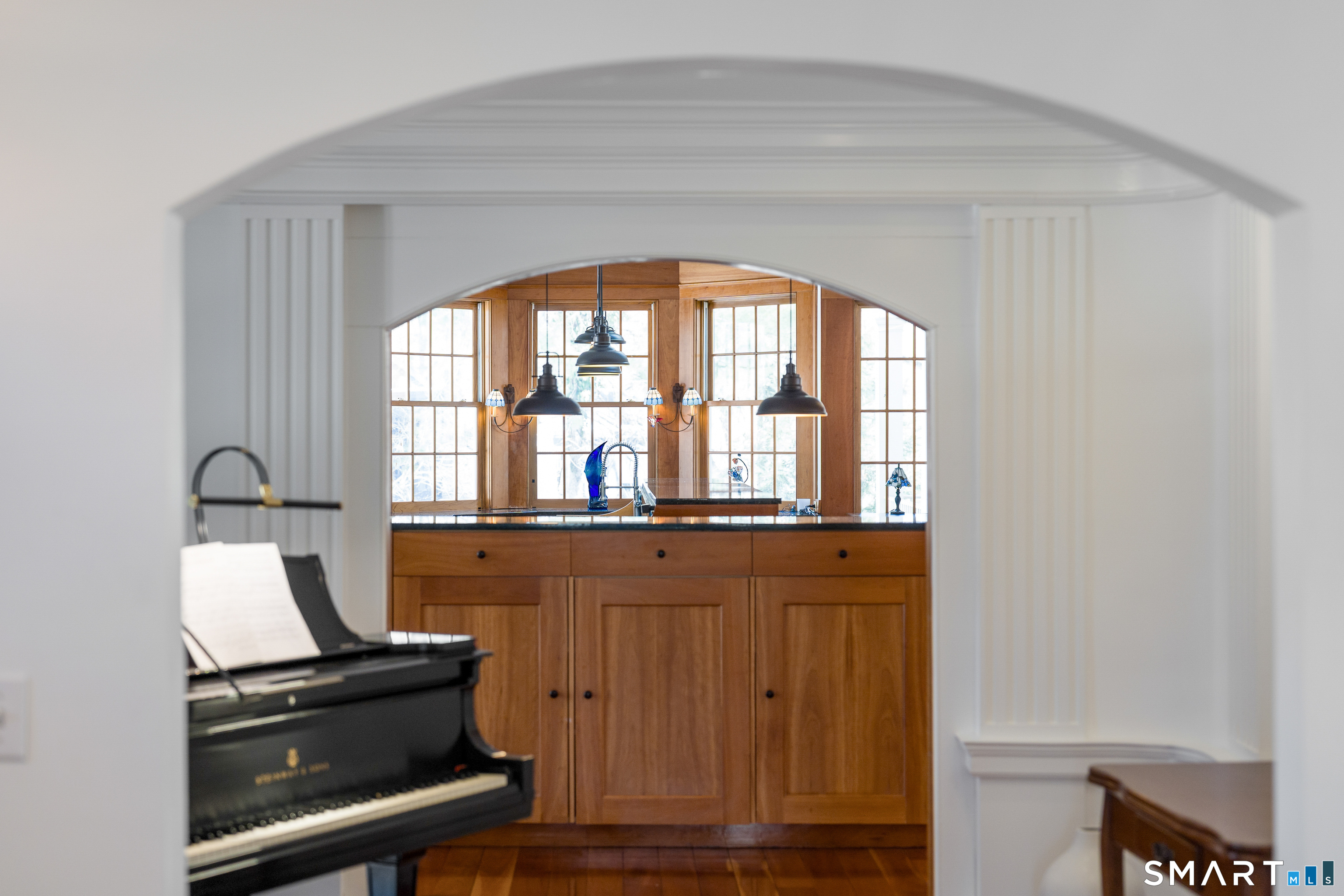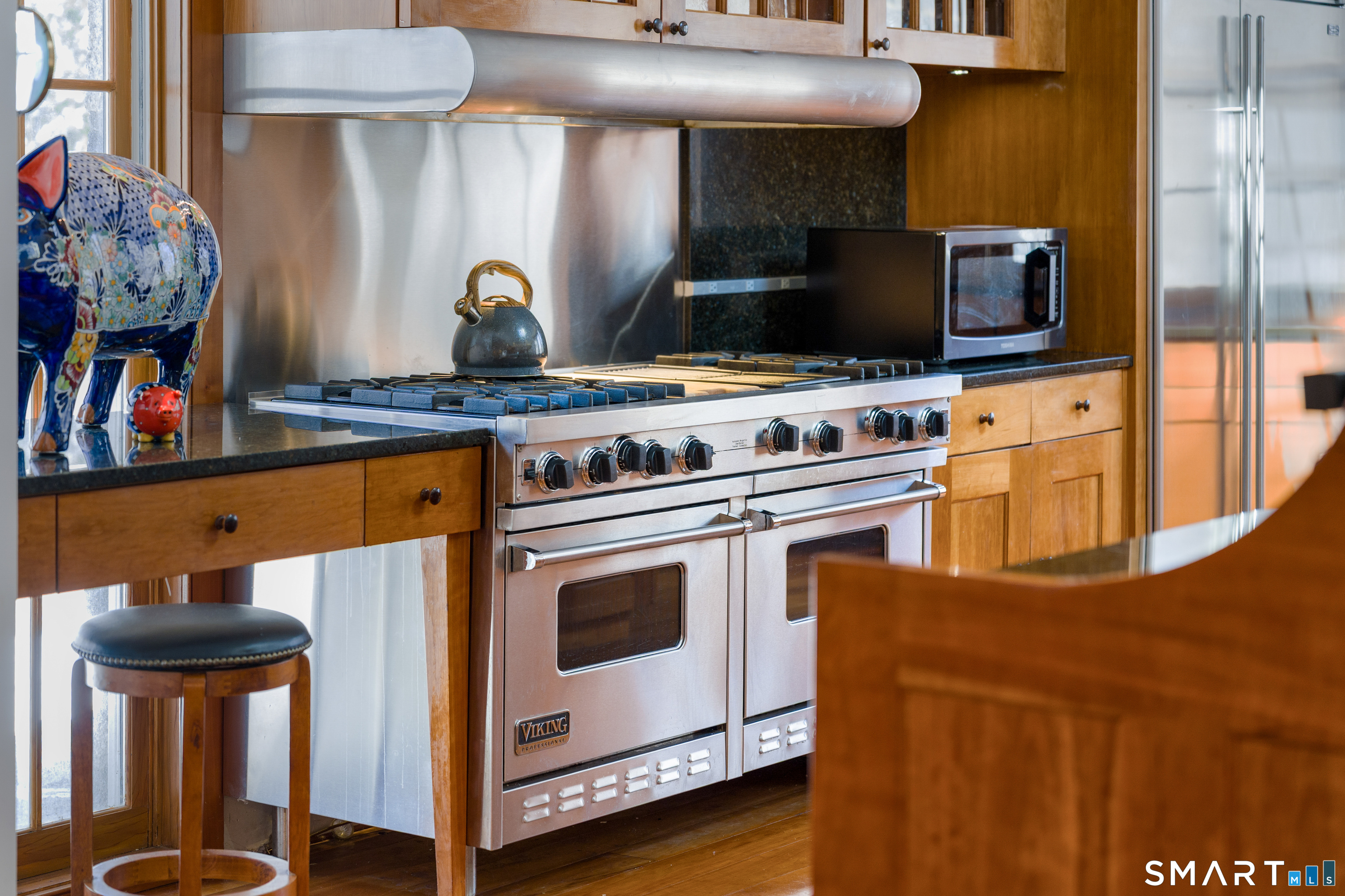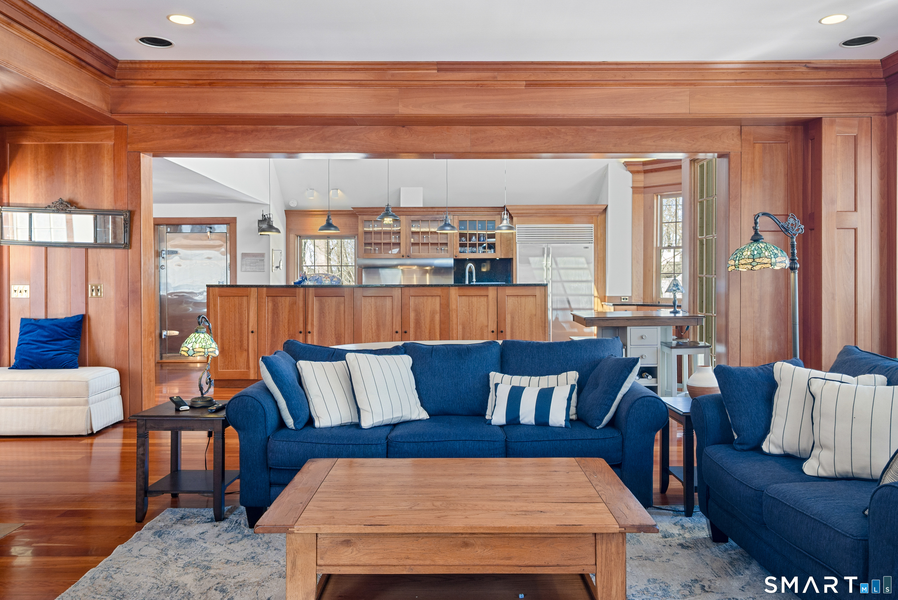 A rare opportunity to live on Topping Lane, a private wooded enclave Rowayton adjacent. Set atop a gentle rise on 1. 35 bucolic acres, this gracious stone-and-shingle residence offers five bedrooms and three and one-half baths in a serene, storybook setting defined by privacy, craftsmanship, and natural beauty. A circular drive winds through mature perennial gardens and English-style plantings to a substantial cherry front door, opening into an elegant foyer with wide-plank wood floors. The main level features a formal living room with fireplace, a formal dining room, a cherry-paneled library with fireplace, and a music room that anchors the home with warmth and character. At the heart of the residence is a spectacular kitchen-family room combination, renovated in the 1990s, unified by custom cherry millwork and soaring, chapel-like ceilings-ideal for both everyday living and entertaining. The chef's kitchen is exceptionally well equipped with Sub-Zero refrigeration, a commercial walk-in, a 60-inch Viking range, dual convection ovens, two dishwashers, and a convenient dumbwaiter to the garage. French doors open to a vaulted deck overlooking wooded grounds, ravine, and brook beyond. The primary suite occupies a private ground-level position, featuring warm maple finishes and a recently renovated spa-like bath with an oversized shower, soaking tub, and expansive alabaster countertops. A truly special offering in one of Norwalk's most coveted locations!