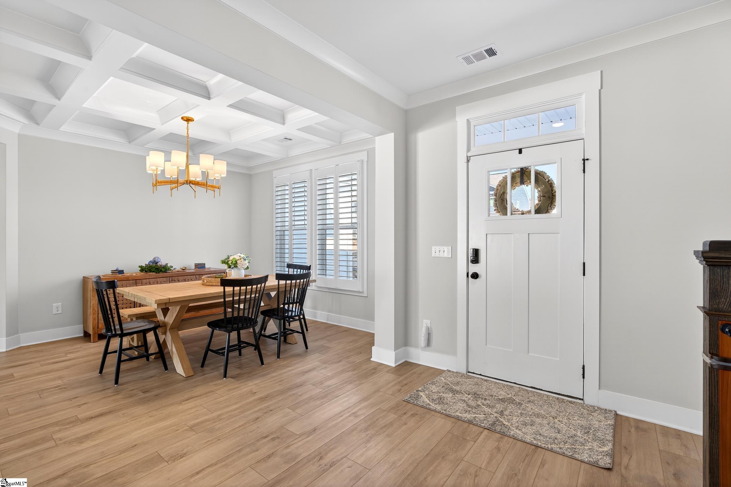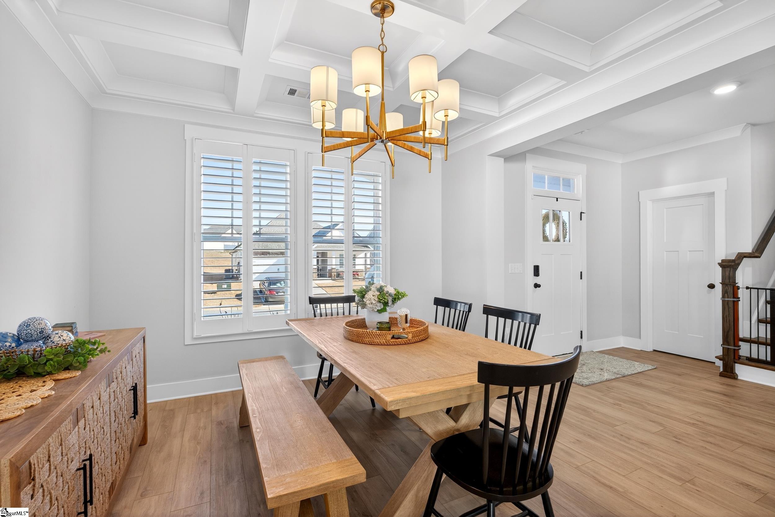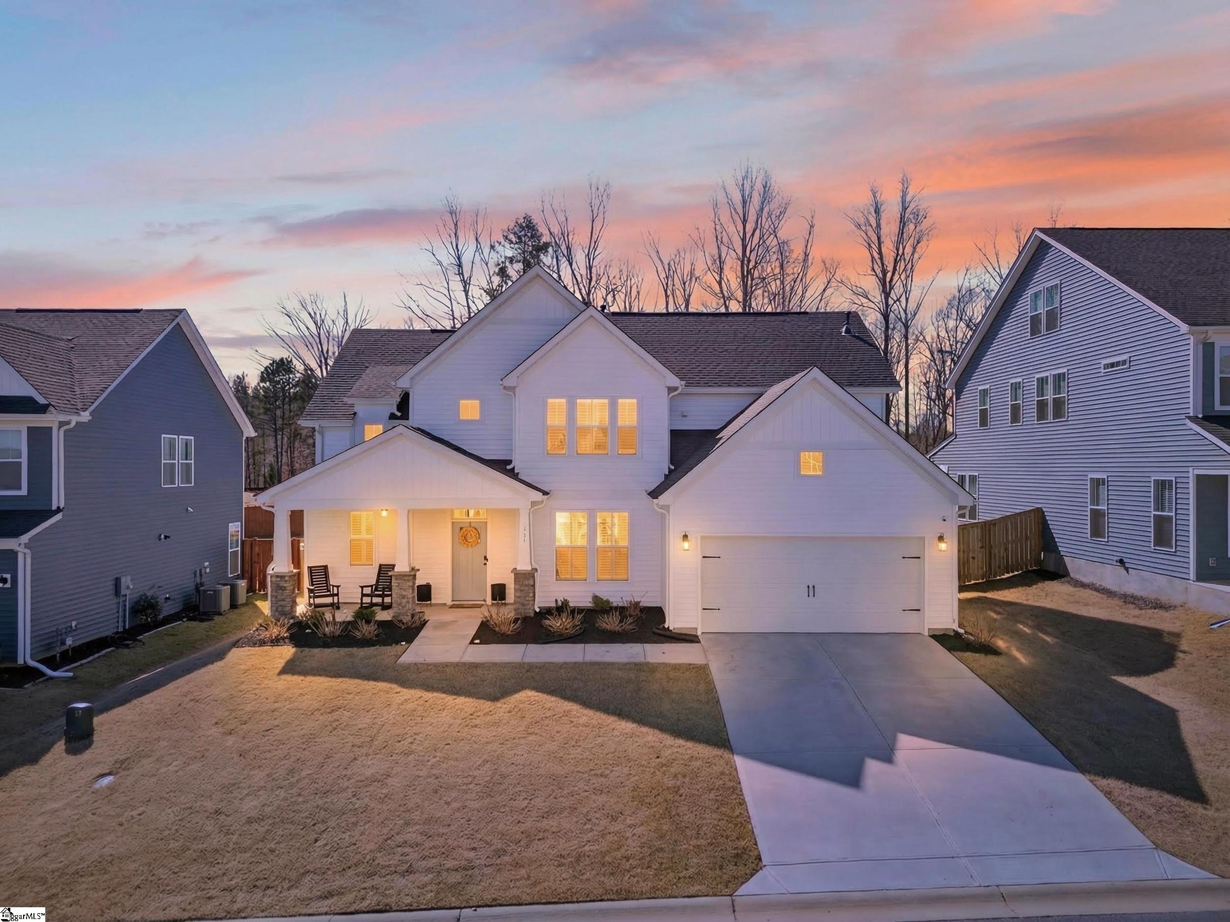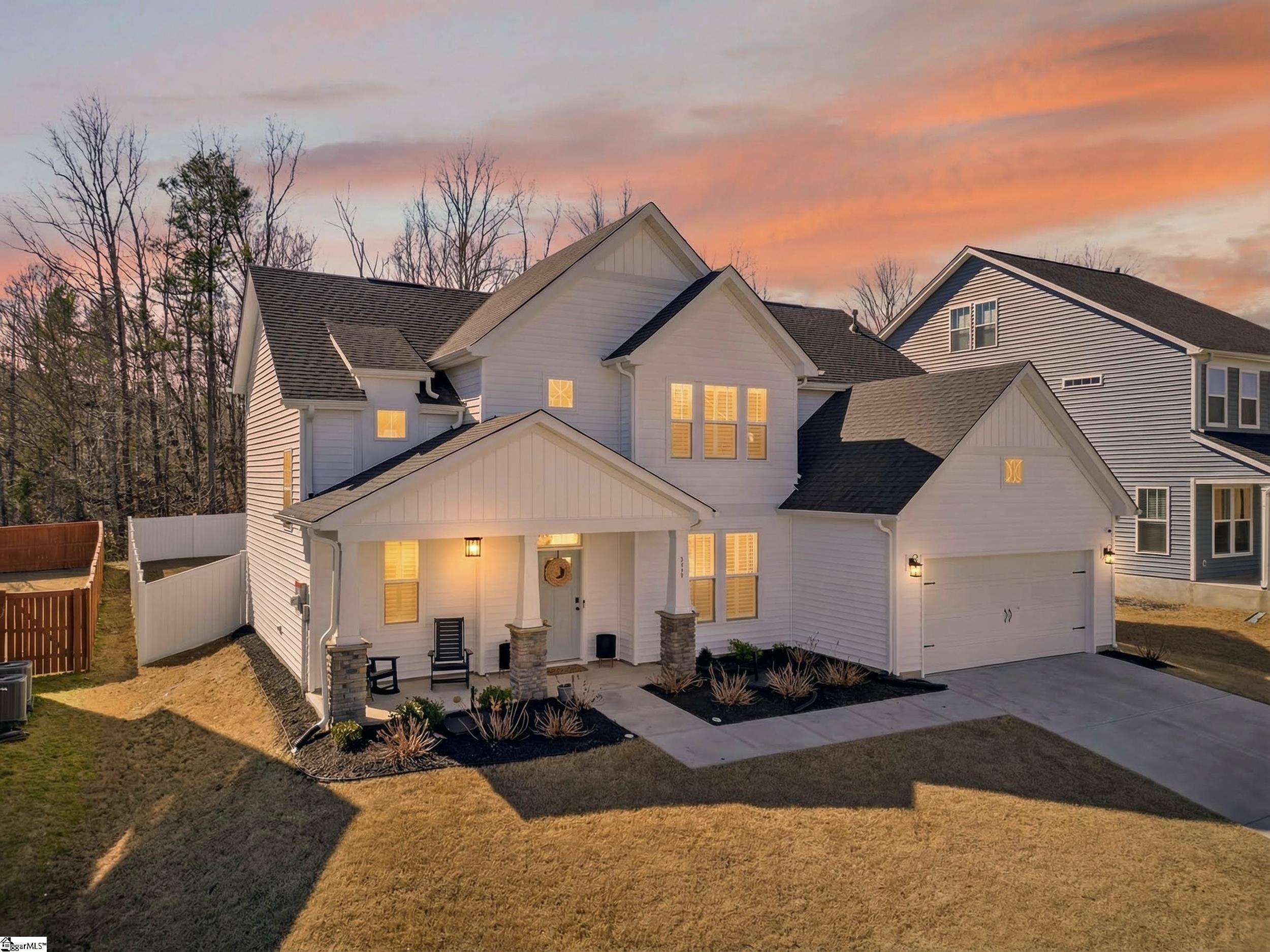 PRICE IMPROVEMENT: Built in 2023, this DRB Homes "Arlington" plan in Anderson Grant feels better than new with over $20, 000 in upgrades that today's buyers value. A covered front porch welcomes you into a formal dining room with coffered ceilings, setting the tone for the thoughtful layout. The main level opens into a spacious great room that flows seamlessly to the covered rear porch, creating an easy indoor-outdoor connection for relaxing or entertaining. At the heart of the home, the kitchen shines with granite countertops, beautiful cabinetry, pantry, stainless-steel appliances, and a gas range, along with a breakfast area for everyday meals. A flex space just off the living area adds versatility—ideal for a home office, playroom, or second sitting room. Upstairs, a generous loft creates a second living zone, while the owner’s suite serves as a private retreat with double vanities, a walk-in closet, and a Roman-tiled shower with dual shower heads and a built-in seat. Two additional bedrooms, a full bath with double sinks, and a convenient upstairs laundry room complete the second level. Throughout the home, you’ll appreciate thoughtful finishes including tilt-out thermal windows paired with custom plantation shutters. Outside, enjoy a level, low-maintenance yard with a 6' white vinyl privacy fence and both covered front and rear porches—and the real standout is the setting: the HOA-owned green space behind the home creates a natural buffer, adding a premium sense of privacy and breathing room you don’t always find in newer neighborhoods. Anderson Grant residents also enjoy neighborhood amenities including a pool and pavilion, pickleball courts, playground, dog park, and fire-pit area. Conveniently located between downtown Greenville and downtown Spartanburg with quick access to Five Forks, Greer, I-26, and I-85, plus proximity to major Upstate employers.