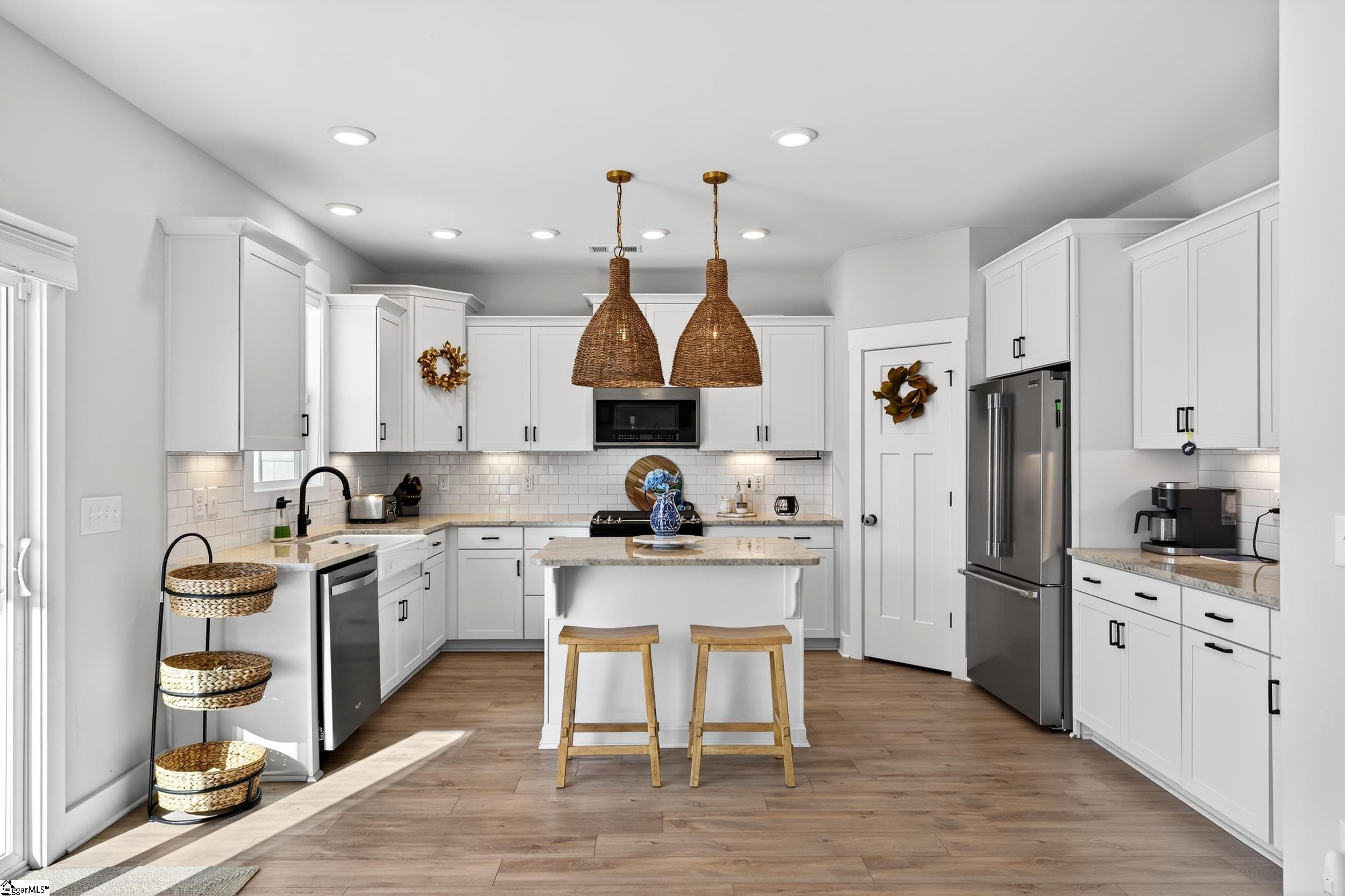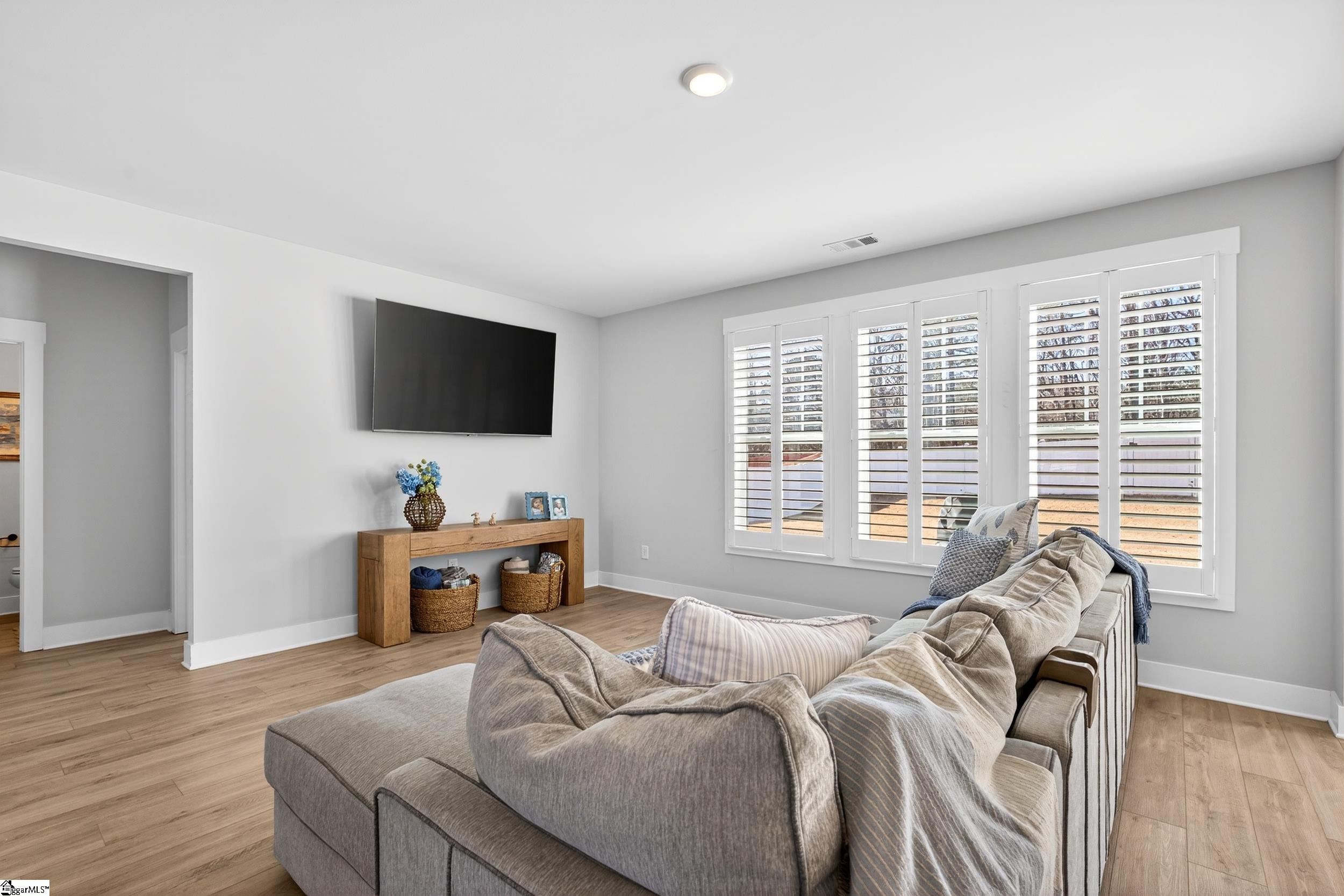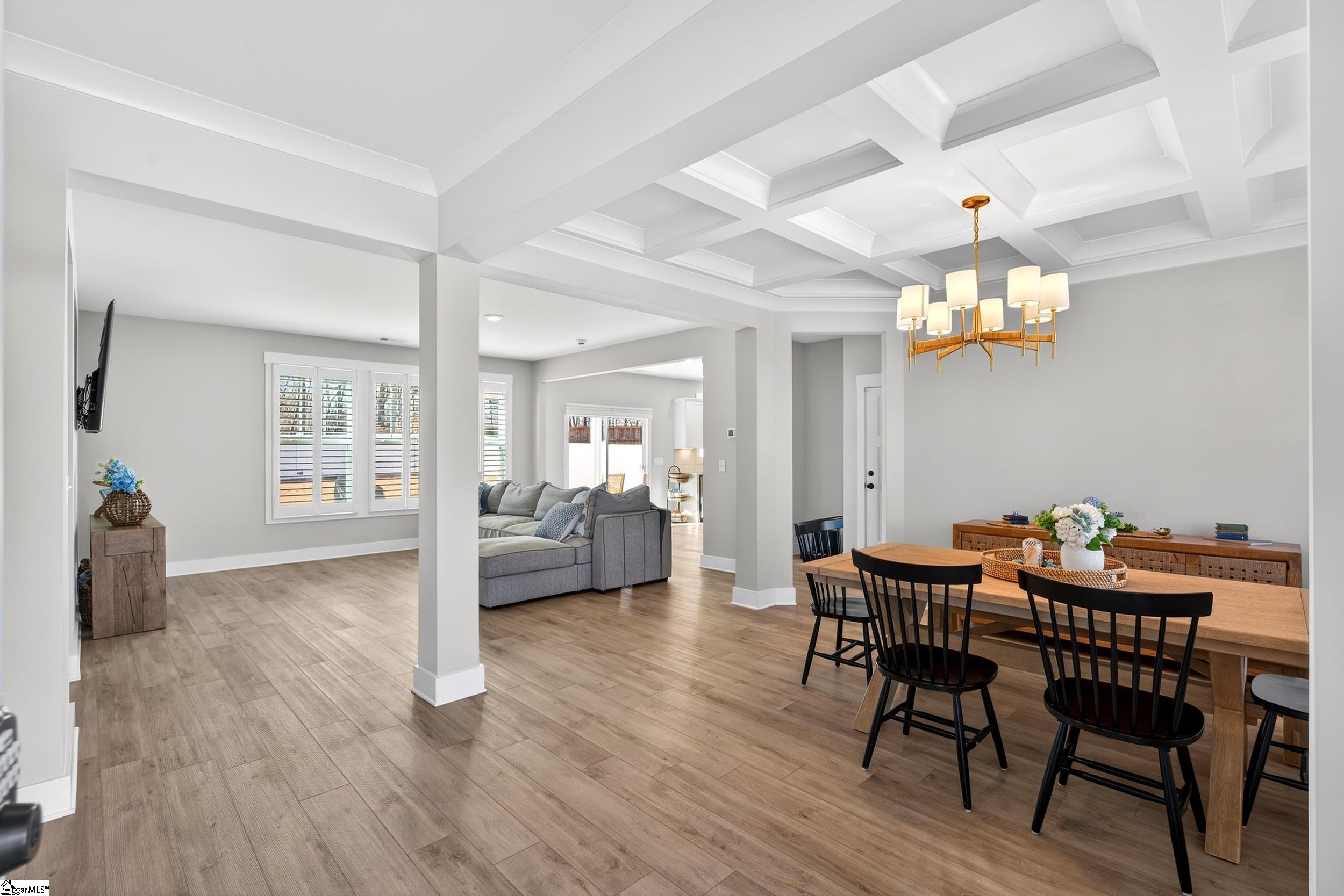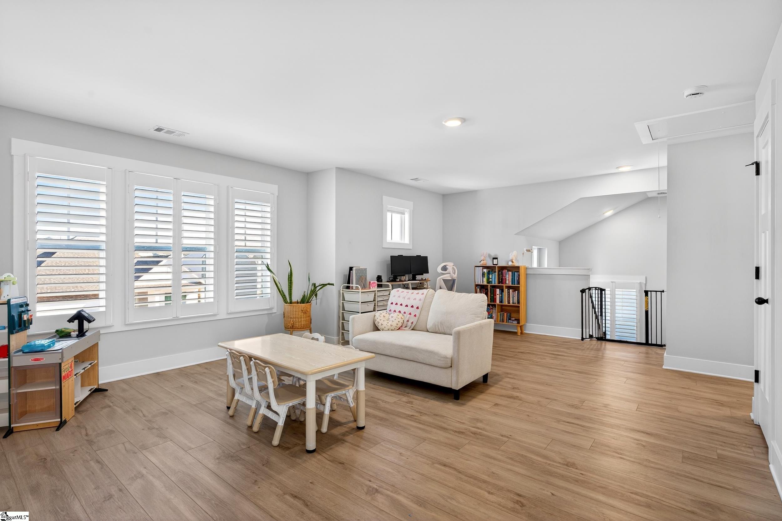 PRICE IMPROVEMENT: Built in 2023, this DRB Homes "Arlington" plan in Anderson Grant feels better than new with over $20, 000 in upgrades that today's buyers value. A covered front porch welcomes you into a formal dining room with coffered ceilings, setting the tone for the thoughtful layout. The main level opens into a spacious great room that flows seamlessly to the covered rear porch, creating an easy indoor-outdoor connection for relaxing or entertaining. At the heart of the home, the kitchen shines with granite countertops, beautiful cabinetry, pantry, stainless-steel appliances, and a gas range, along with a breakfast area for everyday meals. A flex space just off the living area adds versatility—ideal for a home office, playroom, or second sitting room. Upstairs, a generous loft creates a second living zone, while the owner’s suite serves as a private retreat with double vanities, a walk-in closet, and a Roman-tiled shower with dual shower heads and a built-in seat. Two additional bedrooms, a full bath with double sinks, and a convenient upstairs laundry room complete the second level. Throughout the home, you’ll appreciate thoughtful finishes including tilt-out thermal windows paired with custom plantation shutters. Outside, enjoy a level, low-maintenance yard with a 6' white vinyl privacy fence and both covered front and rear porches—and the real standout is the setting: the HOA-owned green space behind the home creates a natural buffer, adding a premium sense of privacy and breathing room you don’t always find in newer neighborhoods. Anderson Grant residents also enjoy neighborhood amenities including a pool and pavilion, pickleball courts, playground, dog park, and fire-pit area. Conveniently located between downtown Greenville and downtown Spartanburg with quick access to Five Forks, Greer, I-26, and I-85, plus proximity to major Upstate employers.