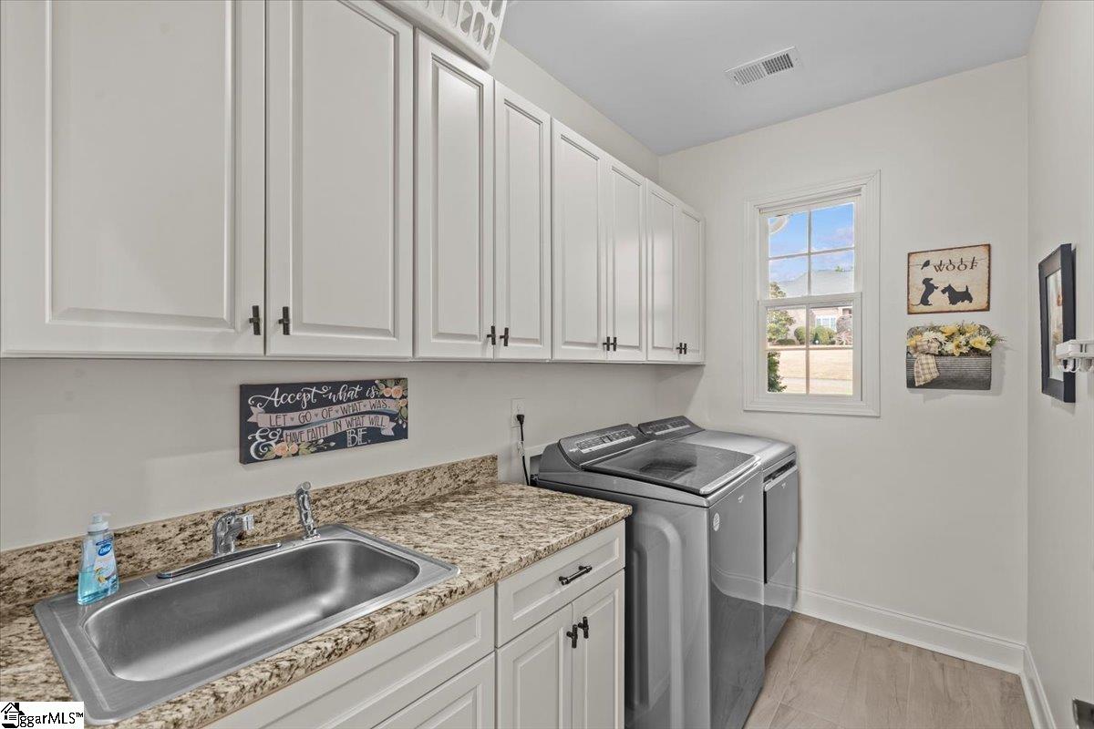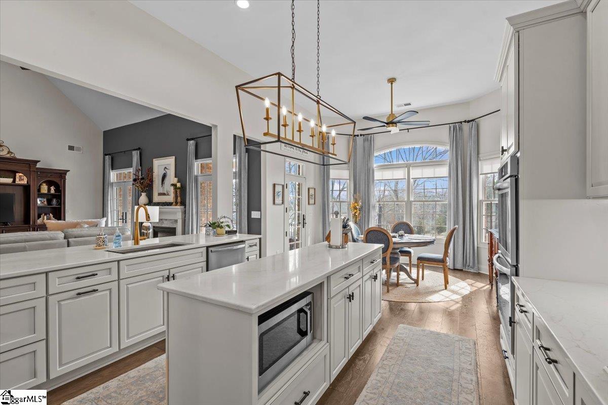 This 3-year-old ALL brick home in the small upscale neighborhood of The Farm (Wren School District) is better than new, complete in every way from inside-out! You must see this CUSTOM home that beautifully speaks style, comfort and class! ****Location: Country feel with easy commute to Greenville via I-85, 12 minutes to Ingles, Publix, Sam's Club, Walmart, etc. , and everything Easley offers. Only 4 minutes to Hunt Meadows Elementary! ****The Exterior: The owners have meticulously styled this home from its low-maintenance, fully landscaped and irrigated yard, replete with a beautiful fenced-in backyard that includes a huge custom, cobble-stoned patio with fire pit! ****The Entrance: Enter through beautiful, double doors with upgraded glass to provide the privacy you want, while still flooding the two-story massive foyer with light. A custom alcove is a special design element. NO CARPET on the first floor (or on 2nd except in upstairs bedrooms)! ****The Foyer opens into a stunning two-story Great Room featuring a gas log fireplace with two sets of double French doors that open onto the covered back porch. Tucked away on the first floor is the primary suite, featuring wood floors, a tray ceiling, another gas log fireplace flanked by tall windows, room for a sitting area and a French door leading to the back porch. His and her walk-in closets and dressing area lead to the master bath with its separate vanities, frameless glass shower, luxurious spa tub, linen closet and water closet. ****The light-filled kitchen, open to the adjacent living area, is a cook's delight! It features extensive, upgraded quartz counter tops, loads of storage in its white cabinetry, center island, gas cooktop with vented, hammered copper hood and double wall ovens. The kitchen is open to a spacious breakfast nook with a wall of windows that look out onto the beauty of the backyard with its shade trees and evergreens. Another French door leads onto the back porch. A special feature is a separate work area with window that leads from the kitchen to a huge walk-in pantry. ****The laundry room is conveniently located across the hall from the kitchen and features granite counters, a sink, its own window and a wall of cabinets for all your supplies. ****From the right of the foyer, a lovely set of stairs with metal railing leads to the second floor (with separate HVAC system and thermostat). The large landing features wood floors, overlooks the great room/living area below and leads to two bedrooms serviced by a full bath. At the end of the hall, an additional enormous room with another full bath, may be used as a fourth bedroom with its own very spacious sitting area, or you may opt to use this as a media room/rec room. Lots of options! Each of the bedrooms upstairs includes exceptionally large walk-in closets and access to the attic in each with some additional floored storage space. ***Three Car Garage (37' x 21'10") features a key pad, side door to exterior and bump out for workshop area. *************************************************************************************** Features added since purchase in 2024: . . . . . . . . . . . . . . . . . . . . . . . . . . . . . . . . . . . . . . . . . . . . . . . . . . . . . . . . . . . . . . . . . . . . . . . . . . . . . . . . . . . . . . Exterior: --Large evergreens and shade trees (including flowering trees - dog woods, cherry trees, crape myrtles, etc. ) professionally installed: $9, 000. Additional landscaping including boulder features, $4, 000. Bronze aluminum fencing: $12, 000. Irrigation System (smart phone controlled): $10, 000. Interior: --Upgraded Entrance with stylish pedestal base and columns, Custom Double Front Doors with Transom and the Alcove feature: $22, 000. Upgraded kitchen quartz counter tops: $9, 000. Master Bedroom (including closets) new matching wood floors: $5, 000. Comfort Loops added to existing tankless hot water heater system: $3000.