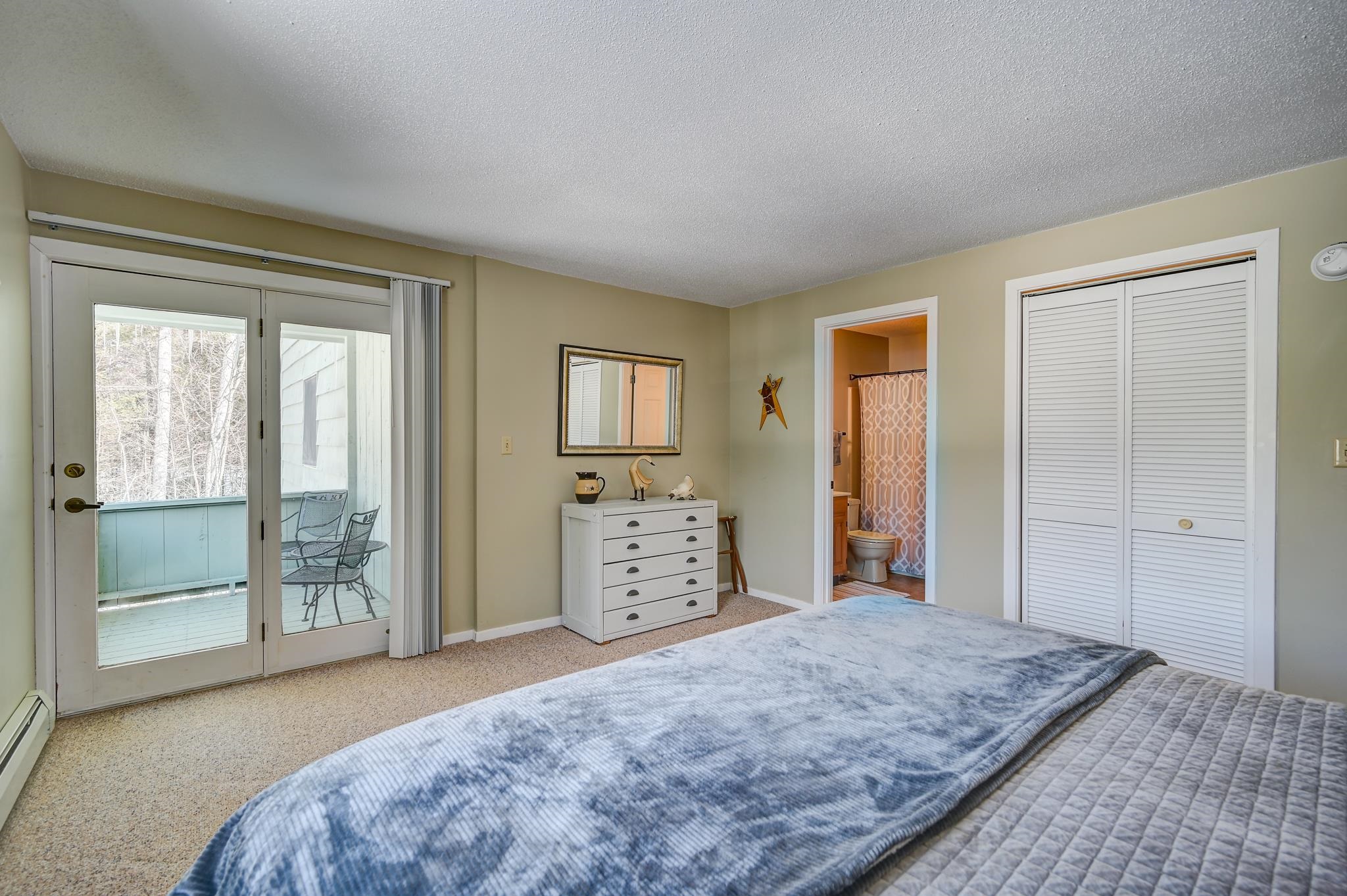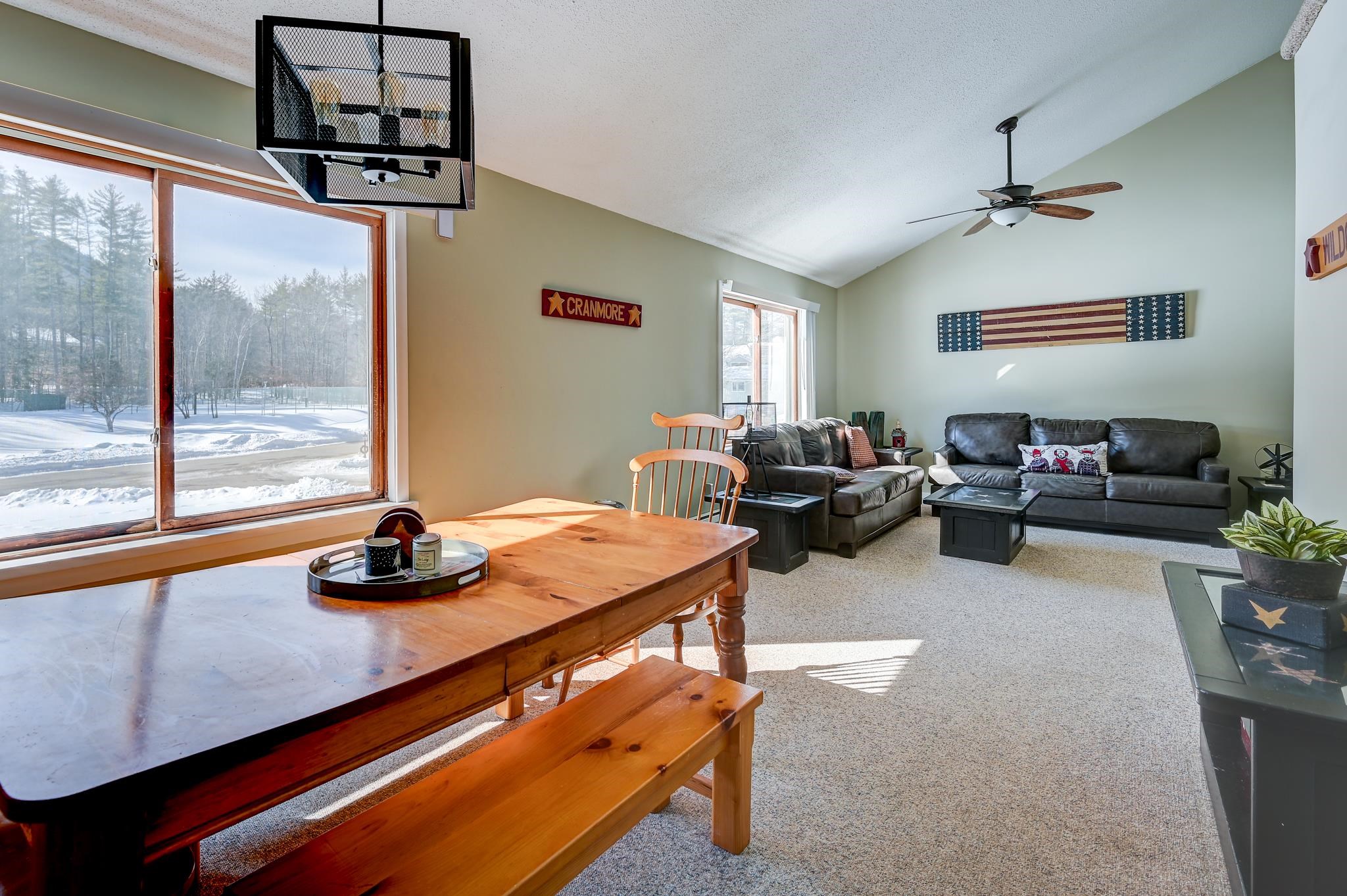 Experience elevated mountain living in this sun-drenched loft unit at The Seasons! This desirable townhouse style condo is ideally positioned to capture the most sunshine, filling the home with warmth and natural light through vaulted ceilings and expansive windows. The thoughtfully designed kitchen flows into the dining area and spacious living room, creating an inviting setting for entertaining or unwinding after a day on the mountain. The primary suite is spacious and has a private full bath with glass sliders leading to a covered deck, perfect for morning coffee or après-ski relaxation. A second bath and in-unit stackable washer and dryer complete the main level. The open loft provides additional sleeping or living space, ideal for kids, guests, a media lounge, or home office. Residents enjoy private locked storage and secure building access, along with a number of amenities: scenic walking trails; tennis, pickleball, and basketball courts; a pond with firepits and gathering areas; grill gazebo; playground; and a clubhouse featuring an indoor pool, hot tub, sauna, fitness area, and game room. Just minutes from Attitash Mountain Resort and 15 minutes to the shops and dining of North Conway Village, this turnkey, fully furnished condo offers a rare opportunity for effortless, year-round enjoyment in the heart of the Mount Washington Valley. Artwork is not included in the sale. On-site rental program available.