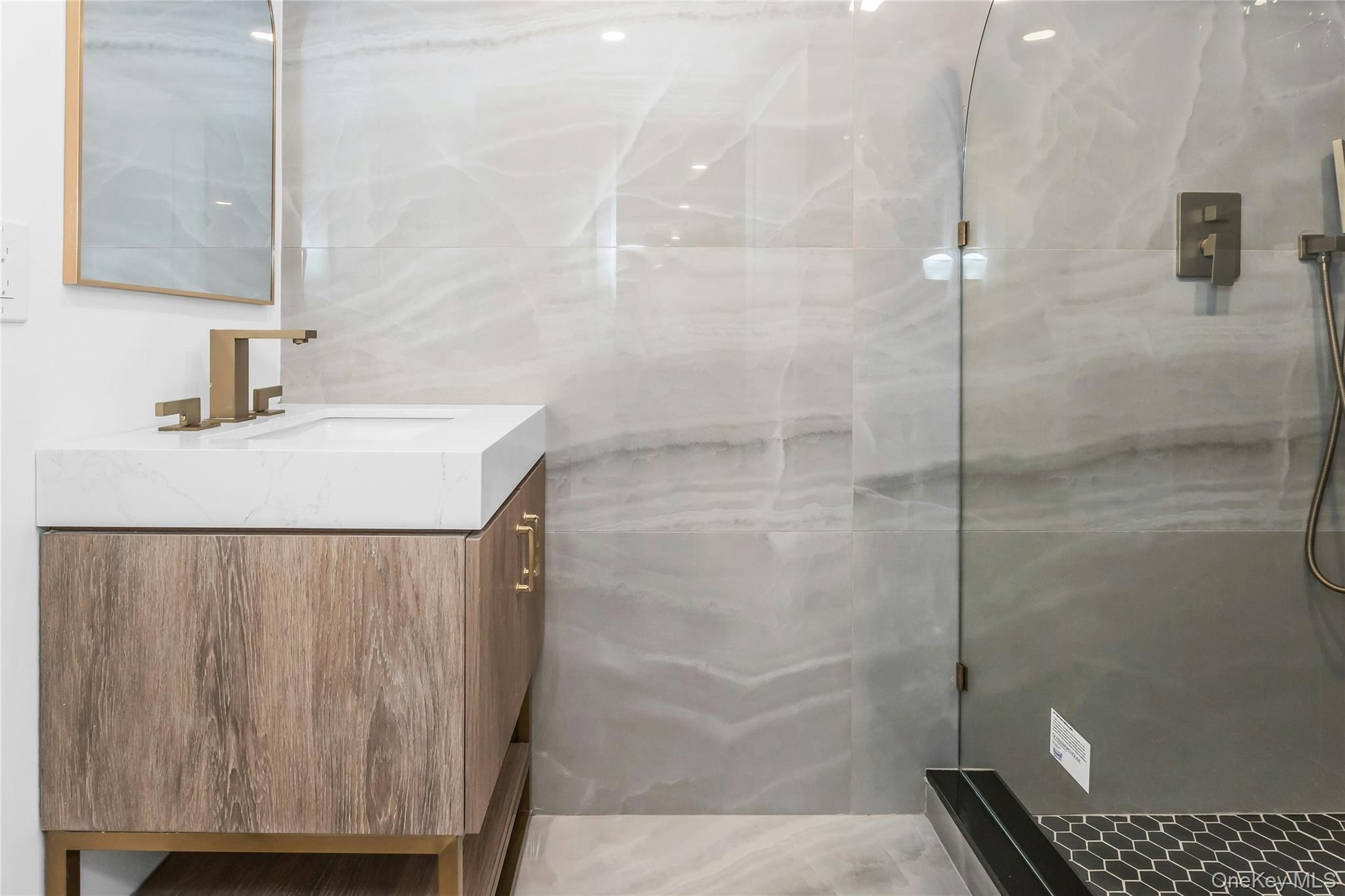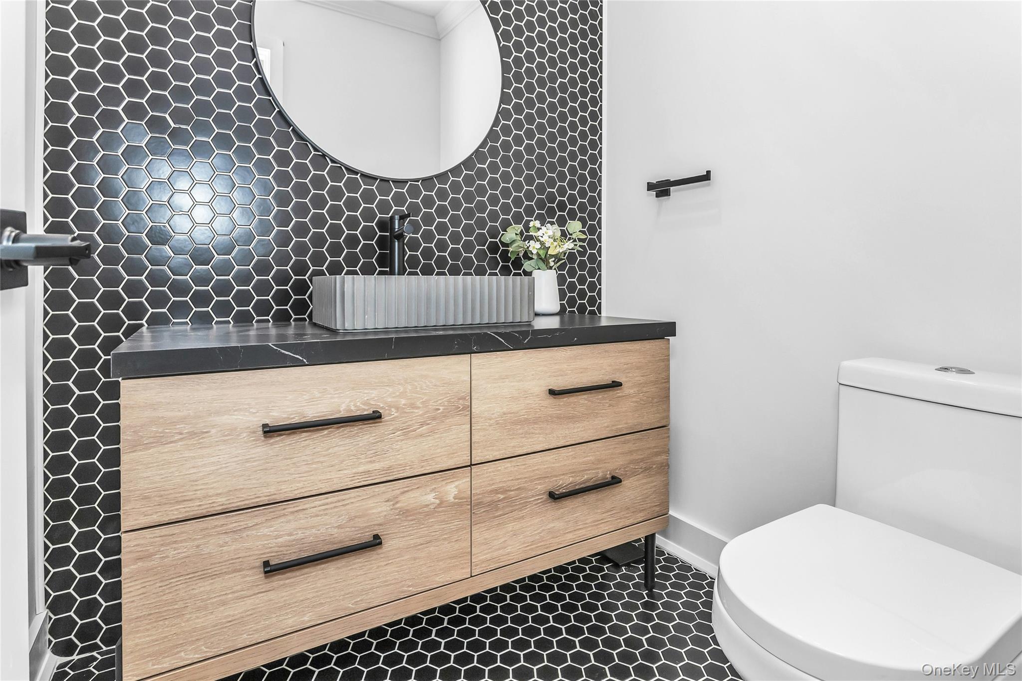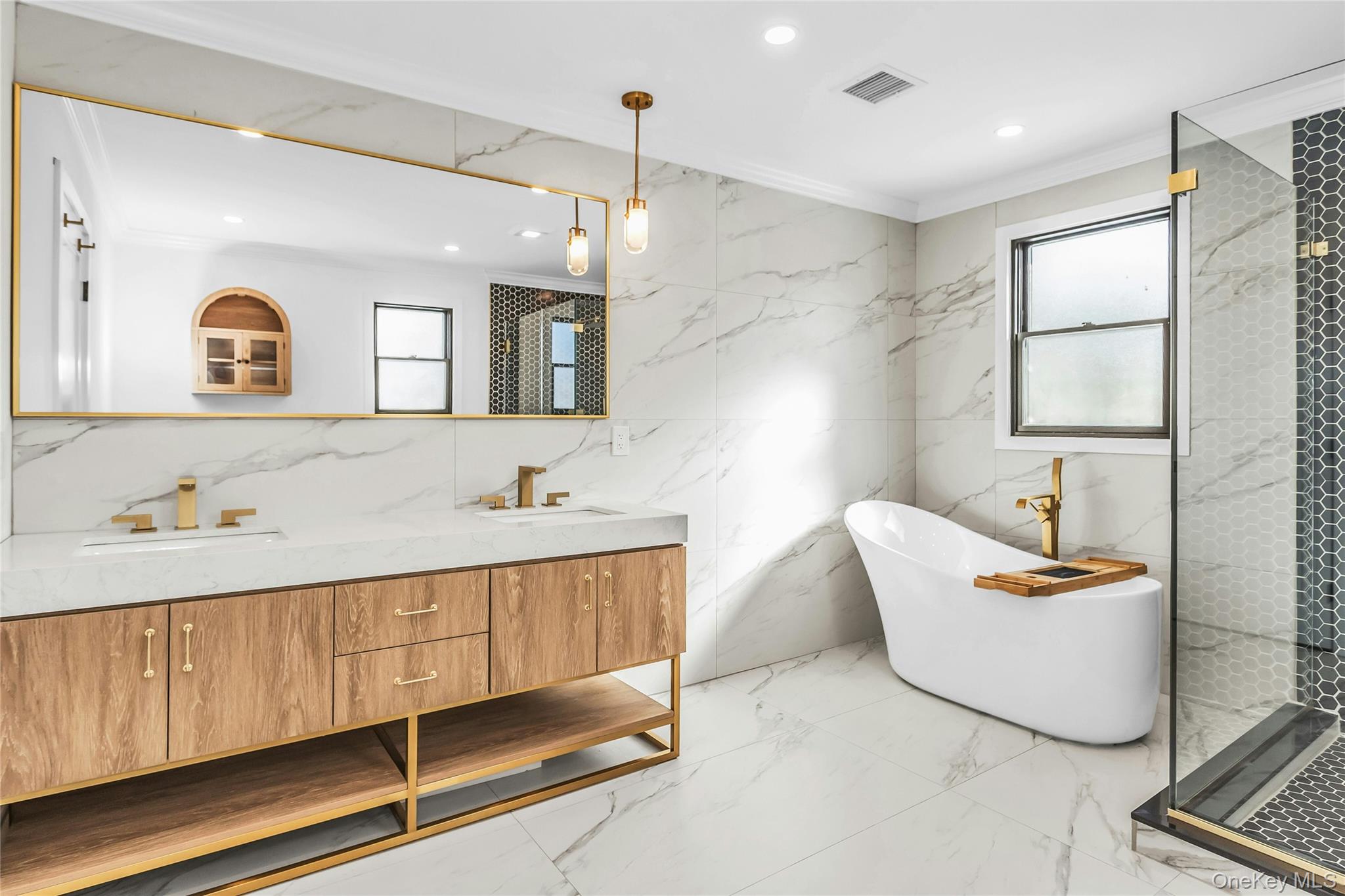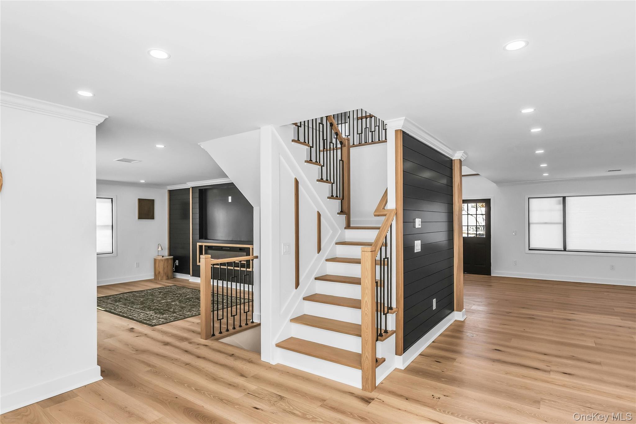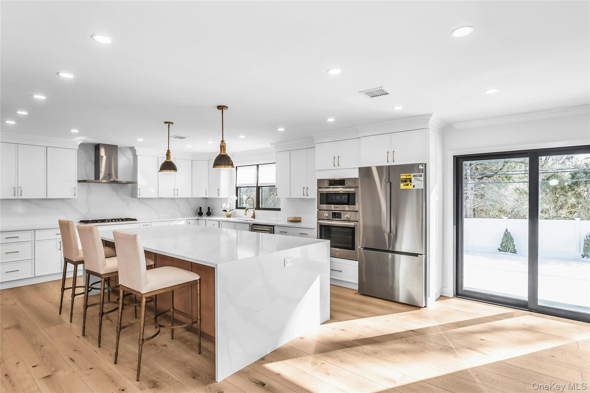This newly constructed custom home welcomes you with a dramatic two-story foyer that sets the tone for elegance and scale found throughout. Offering 5 bedrooms, 5 full baths and a powder room, it is thoughtfully designed for both sophisticated entertaining and everyday comfortable living. Each bathroom is beautifully appointed with imported Spanish or Italian tile, delivering a refined experience. Rich white oak flooring flows seamlessly across the main and second levels, while the lower level features high quality custom vinyl flooring for a versatile living space. This exceptional residence combines architectural presence, premium finishes, and timeless craftsmanship in one remarkable offering. Located in Old Bethpage, one of Nassau County's most sought-after communities.