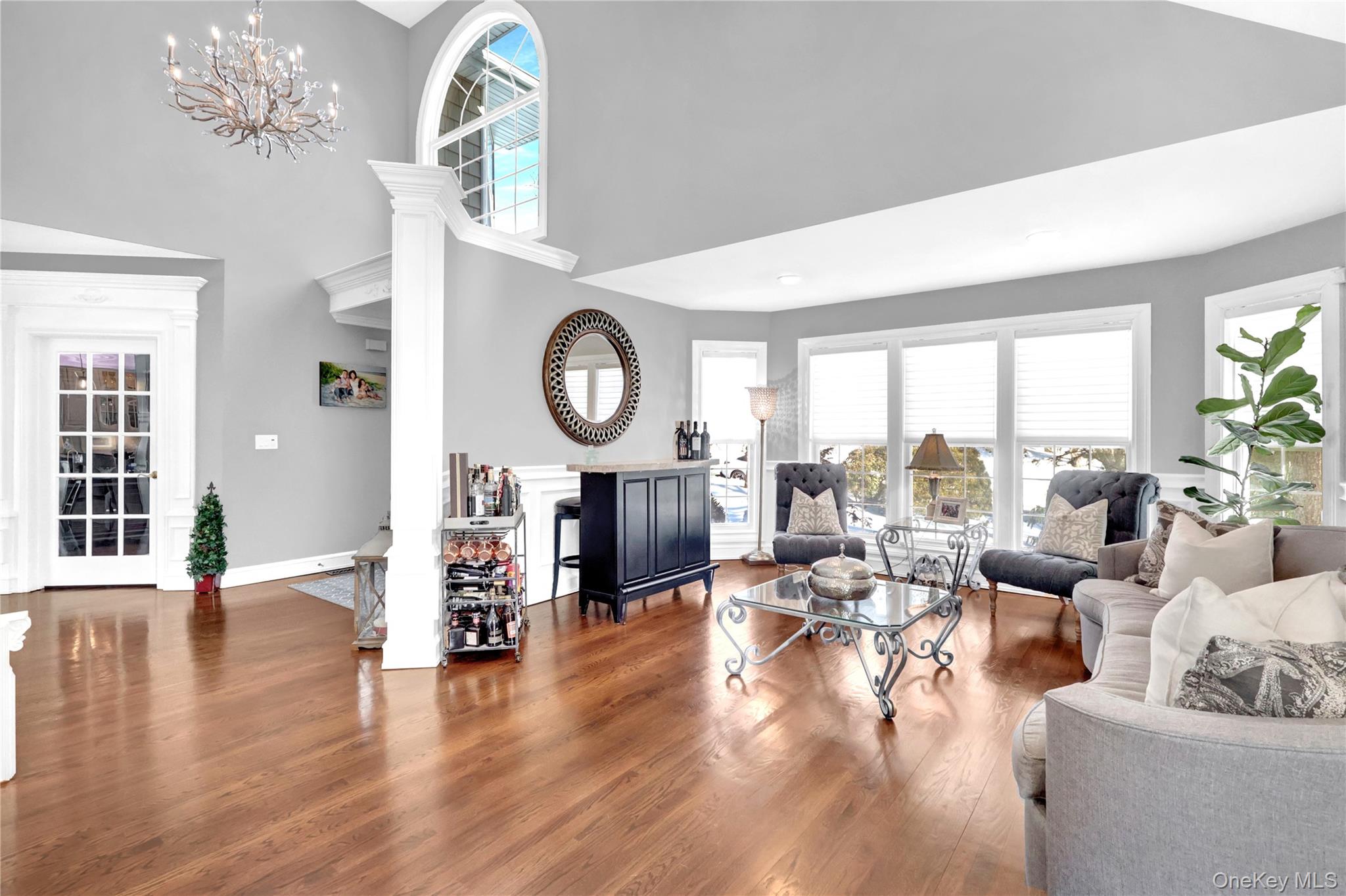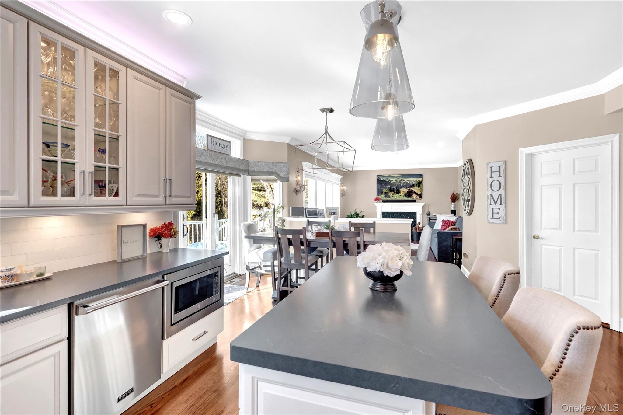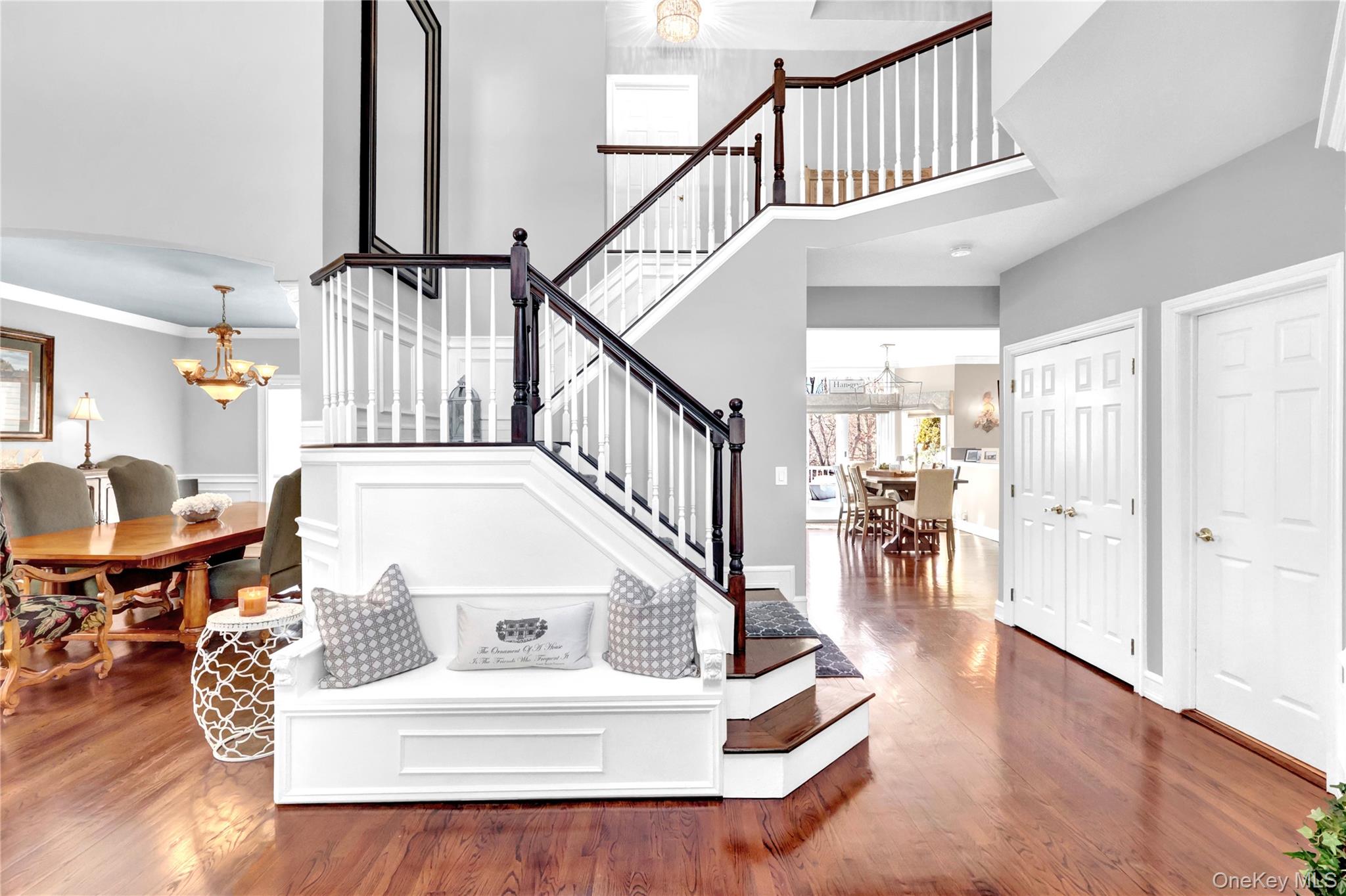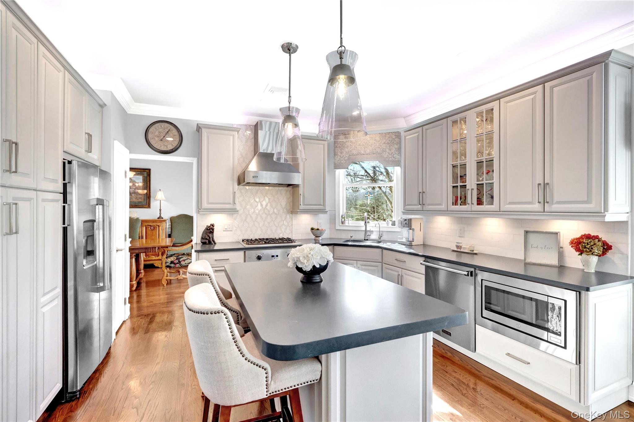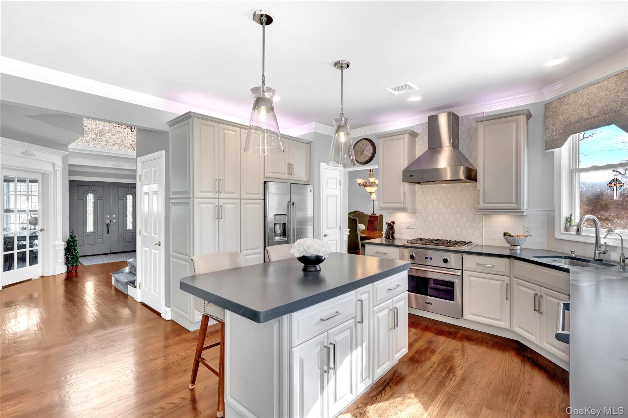 Welcome to this exceptional, fully renovated postmodern Colonial nestled north of 25A in desirable Mount Sinai. Showcasing refined craftsmanship and timeless elegance, this magnificent residence offers gleaming hardwood floors and custom moldings throughout, beginning with a breathtaking two-story entry foyer highlighted by a dramatic sweeping staircase. Entertain in style in the formal living room with vaulted ceilings and the elegant, banquet-sized formal dining room - perfect for hosting memorable gatherings. A beautifully appointed home office provides private and sophisticated space for work or study. The heart of the home is the newly renovated chef's kitchen, featuring custom cabinetry, center island, quartz countertops, designer backsplash, professional grade appliances, and a sunny breakfast area with sliders to deck. The kitchen flows seamlessly into the large den with fireplace and floor-to-ceiling windows overlooking the lush, private backyard - creating the perfect setting for both everyday living and entertaining. Upstairs, retreat to the grand primary suite, complete with a tray ceiling, fireplace, and a spa-inspired, newly renovated en-suite bath featuring a custom marble steam shower, mosaic tile flooring, freestanding soaking tub, and double vanity. Three additional generously sized bedrooms and a beautifully updated full bath with double sinks complete the second level. The fully finished walk-out lower level adds incredible living space, offering a fitness room, game room, and media room - ideal for recreation, relaxation, or extended living. Updates Include New A/C & Heating Units (2016), New Water Heater (2017), New Composite Deck (2020), New Pool Liner (2021), New Architectural Roof (2022), New Rear Door Slider & Basement French Doors (2022), New Front Arch Windows & New Front Siding (2023), New Heat Pump for Pool (2023), New Garage Door Openers (2023), New Sump Pump Systems & Battery Back-ups (2024), Newly Renovated Primary Bathroom (2024), Newly Renovated Kitchen, Cooktop, Rangehood, Oven Appliances (2024), New Pool Pump (2025), New Electrical Panel, Meter Box & New Main Line From Street From PSEG (2025), New Driveway & French Drainage System (2025). Step outside to your maintenance-free deck overlooking a spectacular, private resort-style backyard with a heated saltwater inground pool, waterfall feature, and expansive rolling lawn - your own private oasis for entertaining or unwinding in total tranquility.