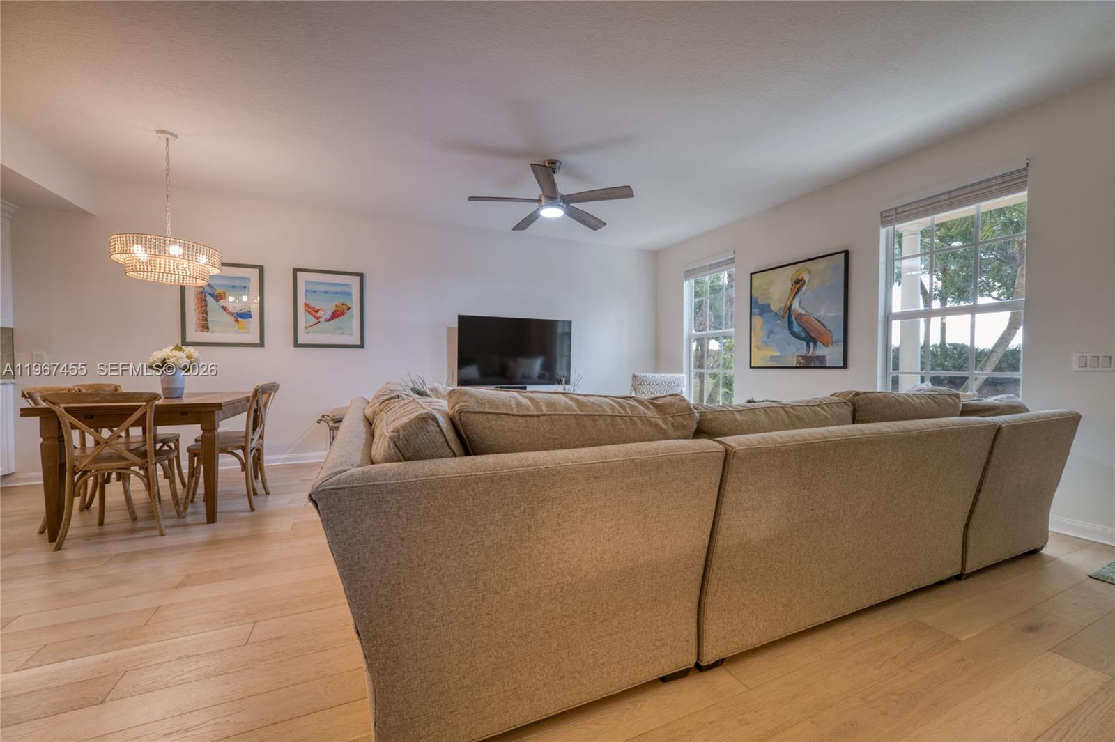 Step inside to discover an interior flooded with natural light and accentuated by gleaming wood flooring. The heart of the home is the updated chef’s kitchen, complete with quartz countertops and high-end stainless steel appliances. Upstairs, the primary suite is a true retreat, featuring a private balcony with sweeping views of the Abacoa Golf Course—the perfect spot for your morning coffee.