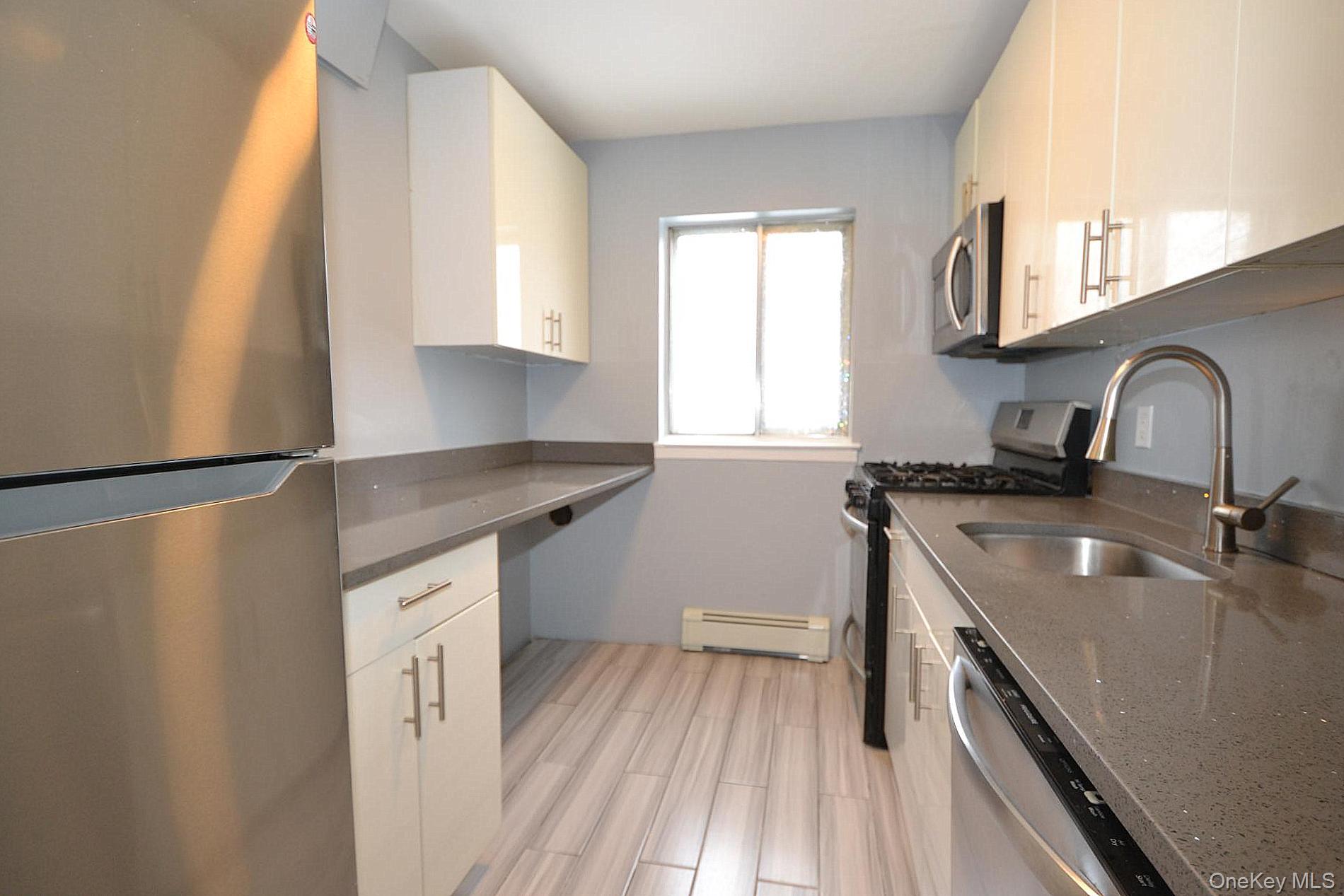 This beautifully renovated first floor end unit offers engineered wood floors and an updated kitchen with white cabinets, stainless appliances and quartz counters. It features a renovated bathroom, laundry hookups, LED hi-hats, generous storage throughout and the flexible second room makes an ideal office or den. You’ll love the ease of the private porch entrance just steps from your parking spot, plus the added security of an interior building door. Enjoy the convenience of two parking spots and a pet-friendly community. Monthly maintenance of $560 includes water, heat, gas for cooking, trash removal, snow removal, and upkeep of the common grounds. This inclusive package makes for easy, low-maintenance, affordable living.